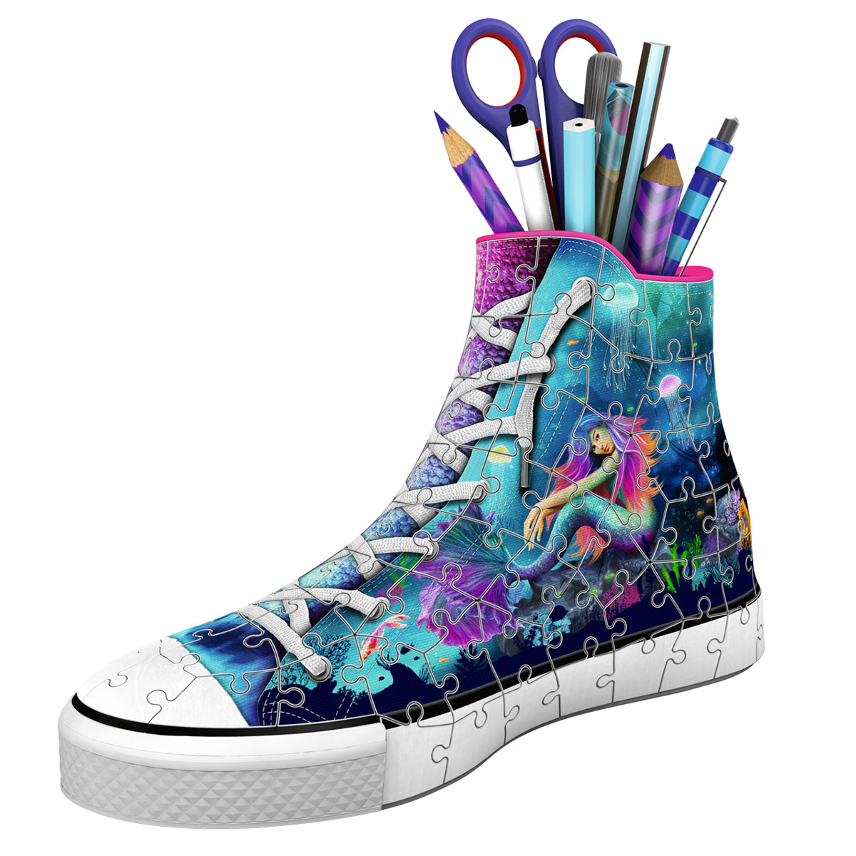 3D Пазл «Русалка» - отличный подарок для поклонников фэнтези и увлекательная возможность собрать стильную подставку для канцелярских принадлежностей. Подставка выполнена в виде кеда, на котором изображена загадочная русалка. Благодаря технологии Easyclick детали пазла легко соединяются друг с другом без использования клея.