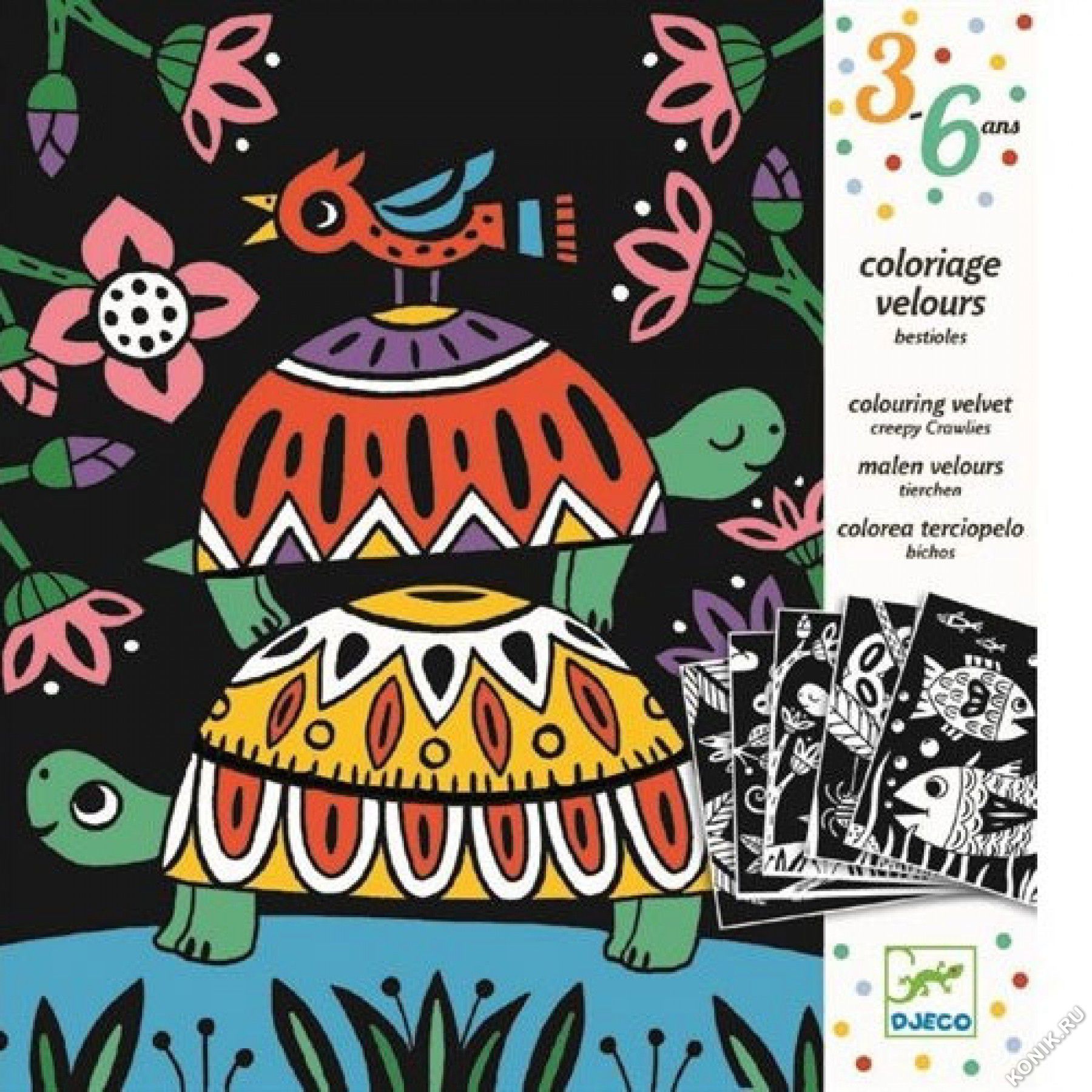 Набор бархатных раскрасок «Черепахи» от французского бренда Djeco позволяет малышу проявить свою фантазию, что способствует развитию творческой личности и эстетическому воспитанию.