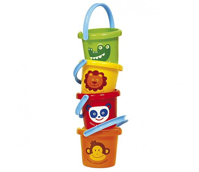 На корпусе ведерка изображены мордашки различных животных: крокодил, обезьянка, панда, тигренок.