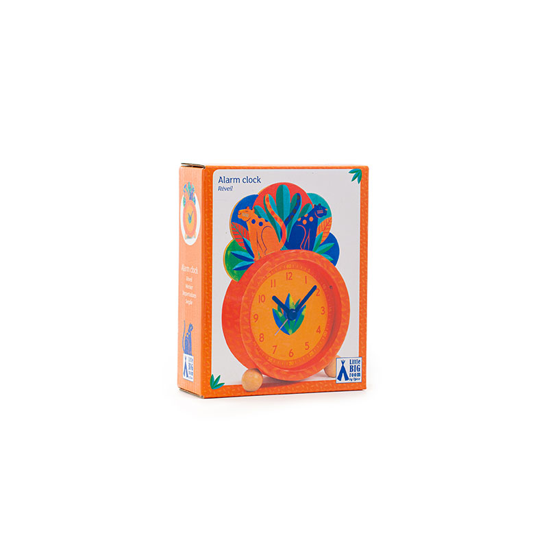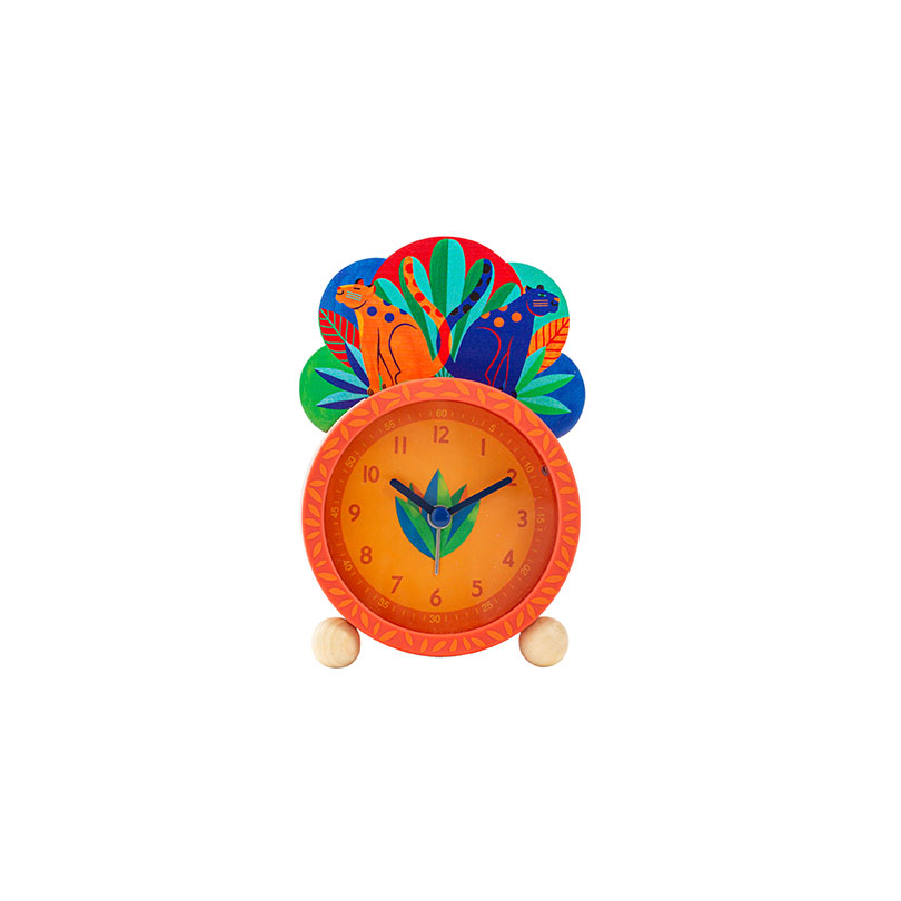 Аксессуар для детской комнаты выполнен в ярком оранжевом цвете. Верх будильника украшен аркой с изображением двух довольных пантер в цветастых зарослях. Такие часики отлично впишутся в интерьер детской комнаты и будут радовать вашего ребёнка еще долгое время.