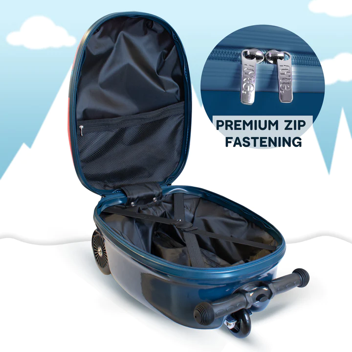 Чемодан обтекаемой формы из ударопрочного, гибкого нейлона, закрывается на молнию. Внутри чемодана имеются эластичные ремни для надежного закрепления вещей и карман на молнии для необходимых мелочей. Чемодан-самокат позволит детям взять с собой в поездку любимые игрушки и необходимые вещи, и, конечно, с таким самокатом ребенок точно не будет скучать во время путешествия, ожидания поезда или регистрации на рейс в аэропорту. Колеса самоката выполнены из полиуретана, платформа и рулевая стойка из алюминия. Подвижное рулевое управление помогает детям лучше держать равновесие и управлять самокатам. Руль самоката регулируется по высоте. Складная конструкция самоката очень удобна во время поездок, самокат складывается в углубление чемодана.