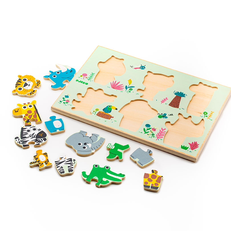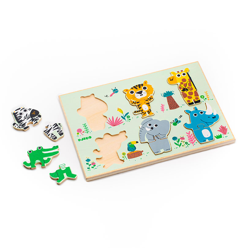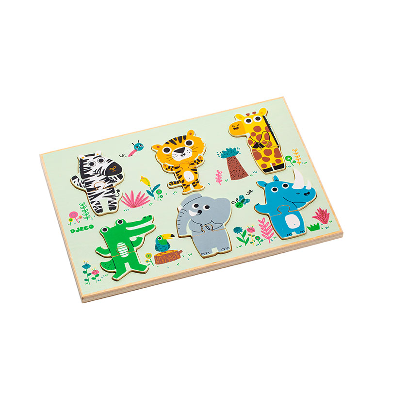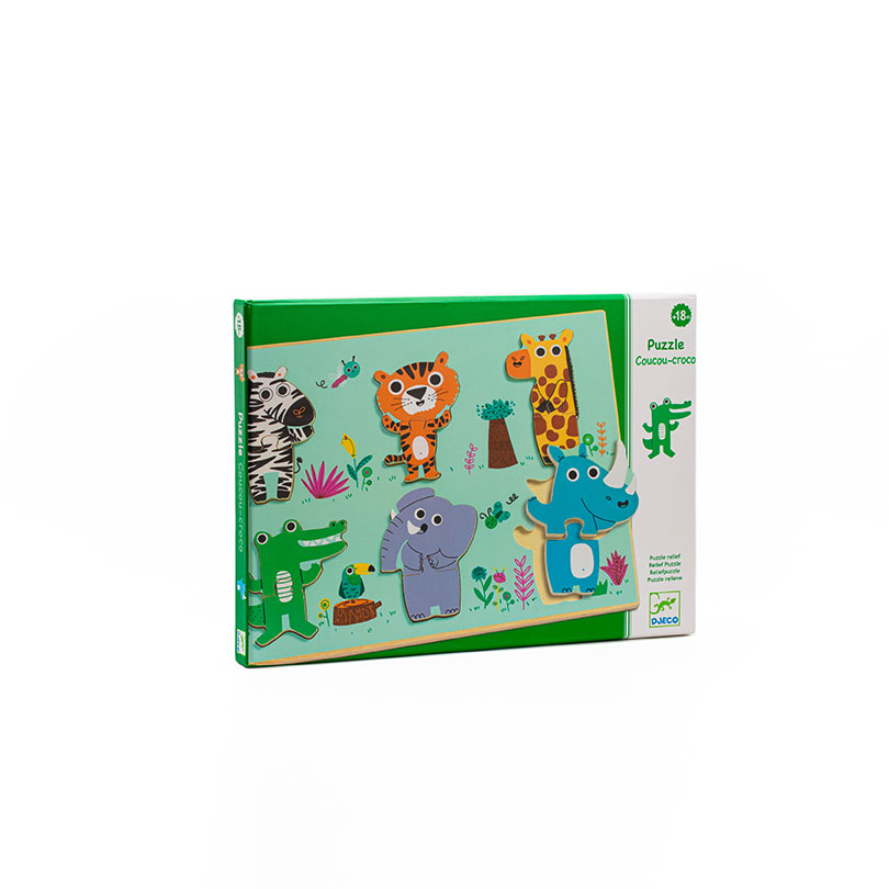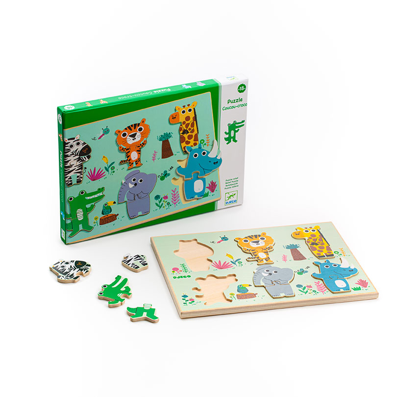 Деревянный пазл «Куку-кроко» от французского производителя Djeco (Джеко) — красочная и увлекательная развивающая головоломка для малышей. Она отлично подойдет на роль первого пазла и познакомит ребёнка с обитателями чудесной саванны.