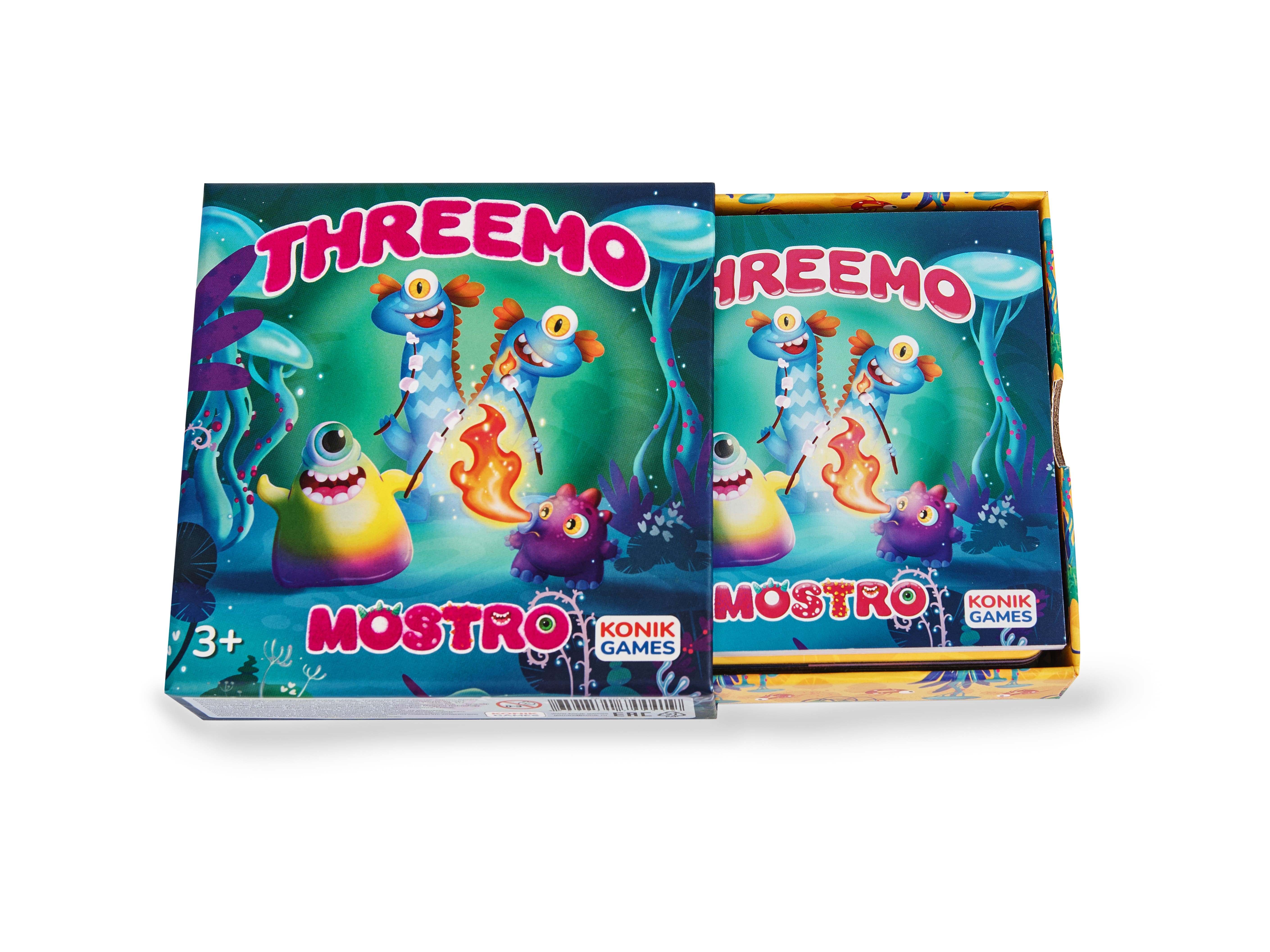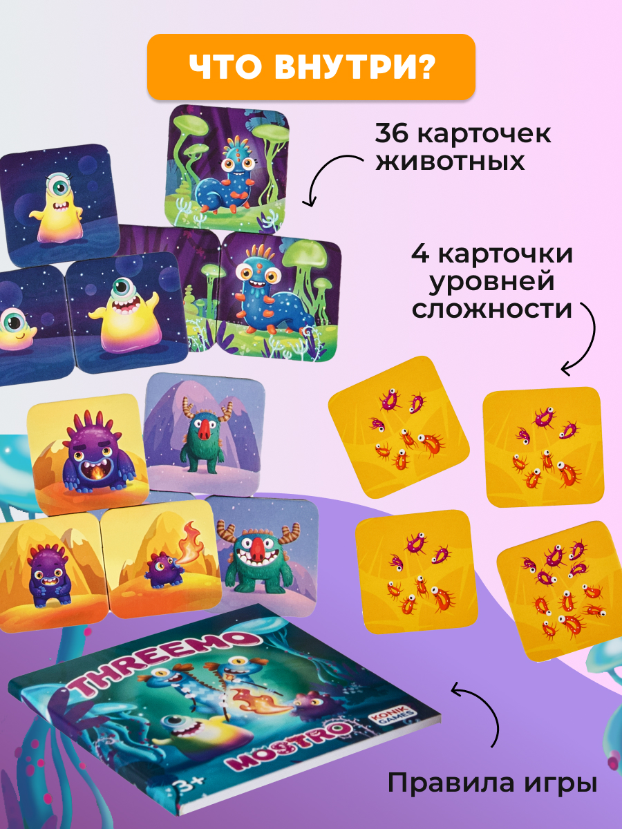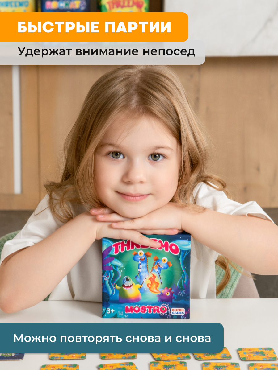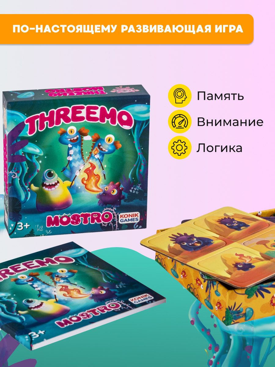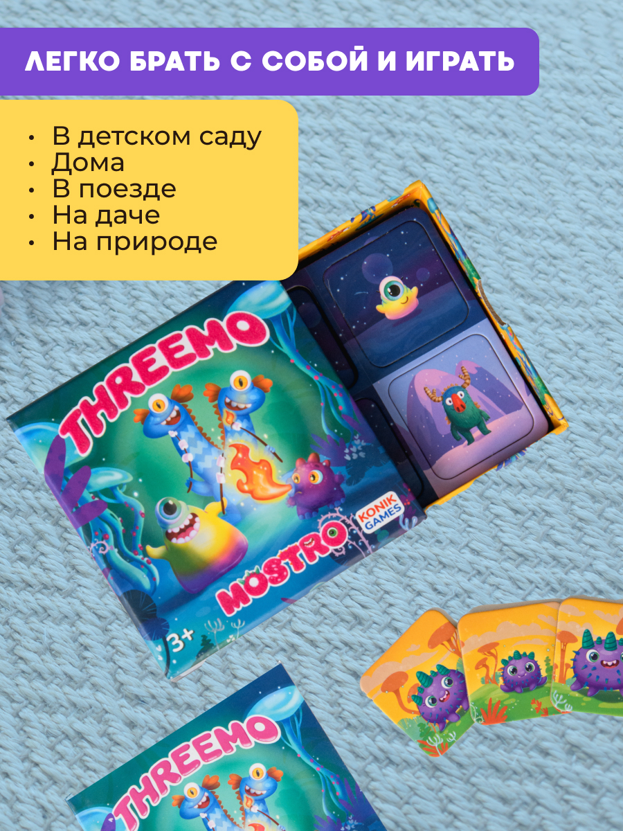 Добрая настольная игра-головоломка THREEMO MONSTRO — это необычное мемори приключение. В ней нет ни одной одинаковой карточки! Найди не просто пару или дубли, а поймай целую семью монстрика. Угадай, кто где прячется. Запомни и попробуй повтори в свой ход.
