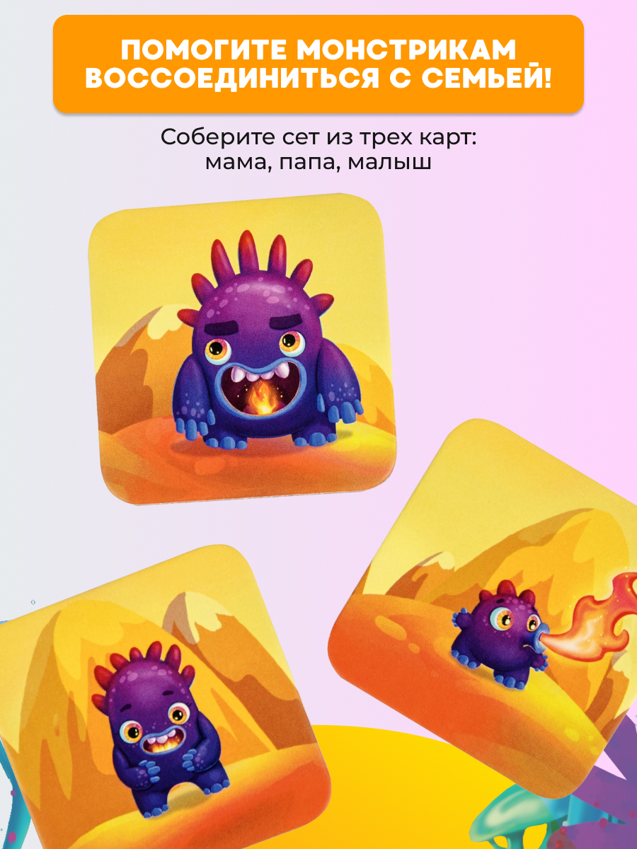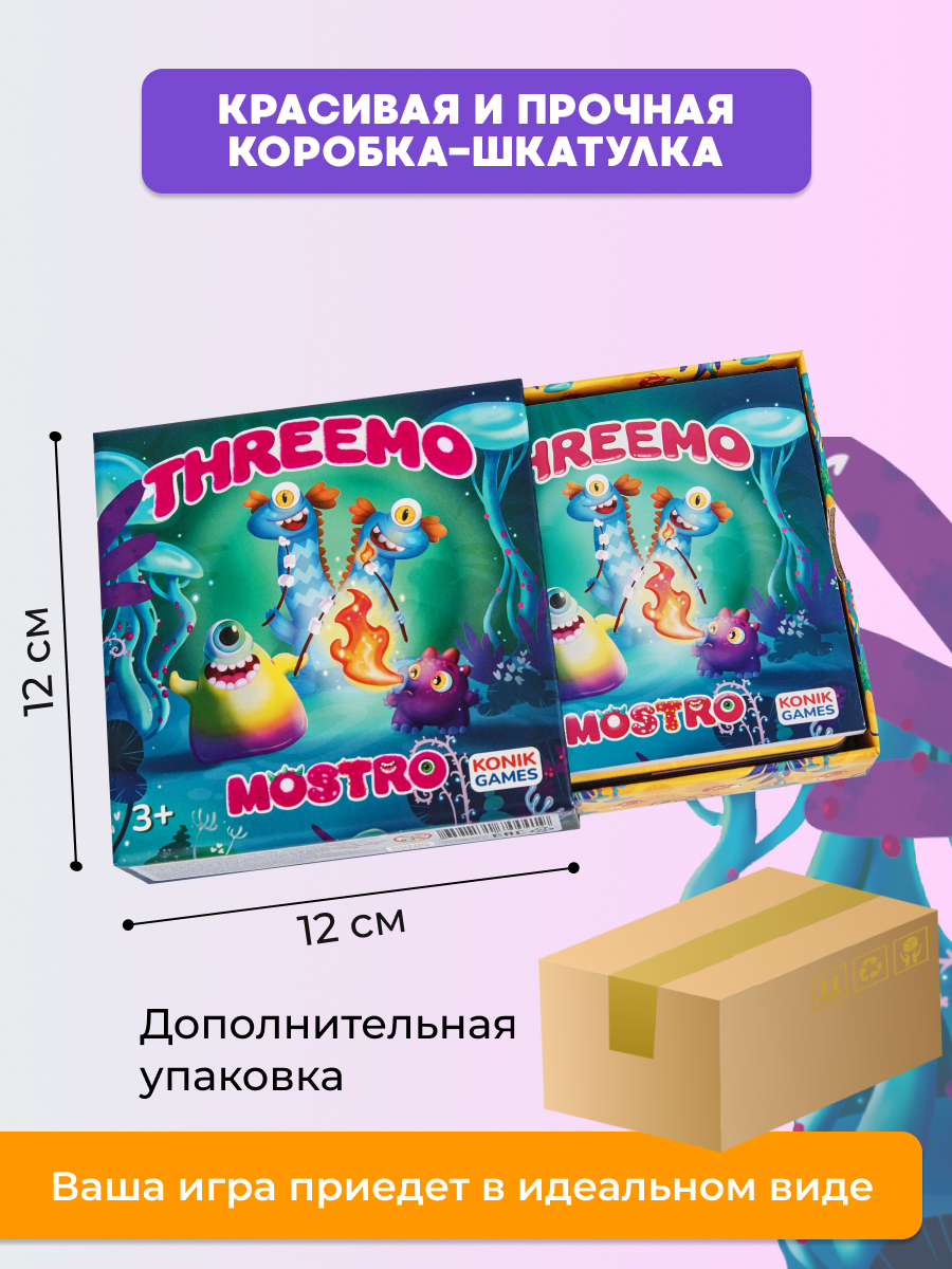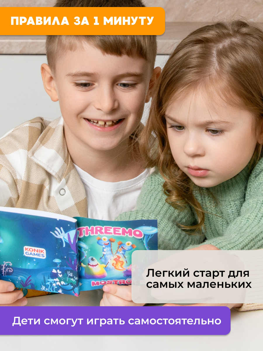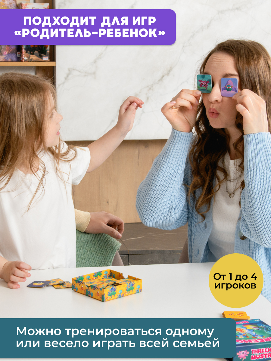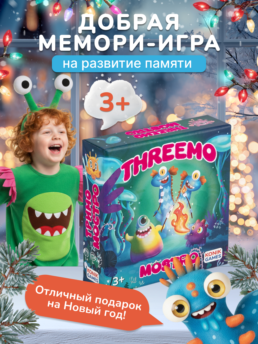 Добрая настольная игра-головоломка THREEMO MONSTRO — это необычное мемори приключение. В ней нет ни одной одинаковой карточки! Найди не просто пару или дубли, а поймай целую семью монстрика. Угадай, кто где прячется. Запомни и попробуй повтори в свой ход.