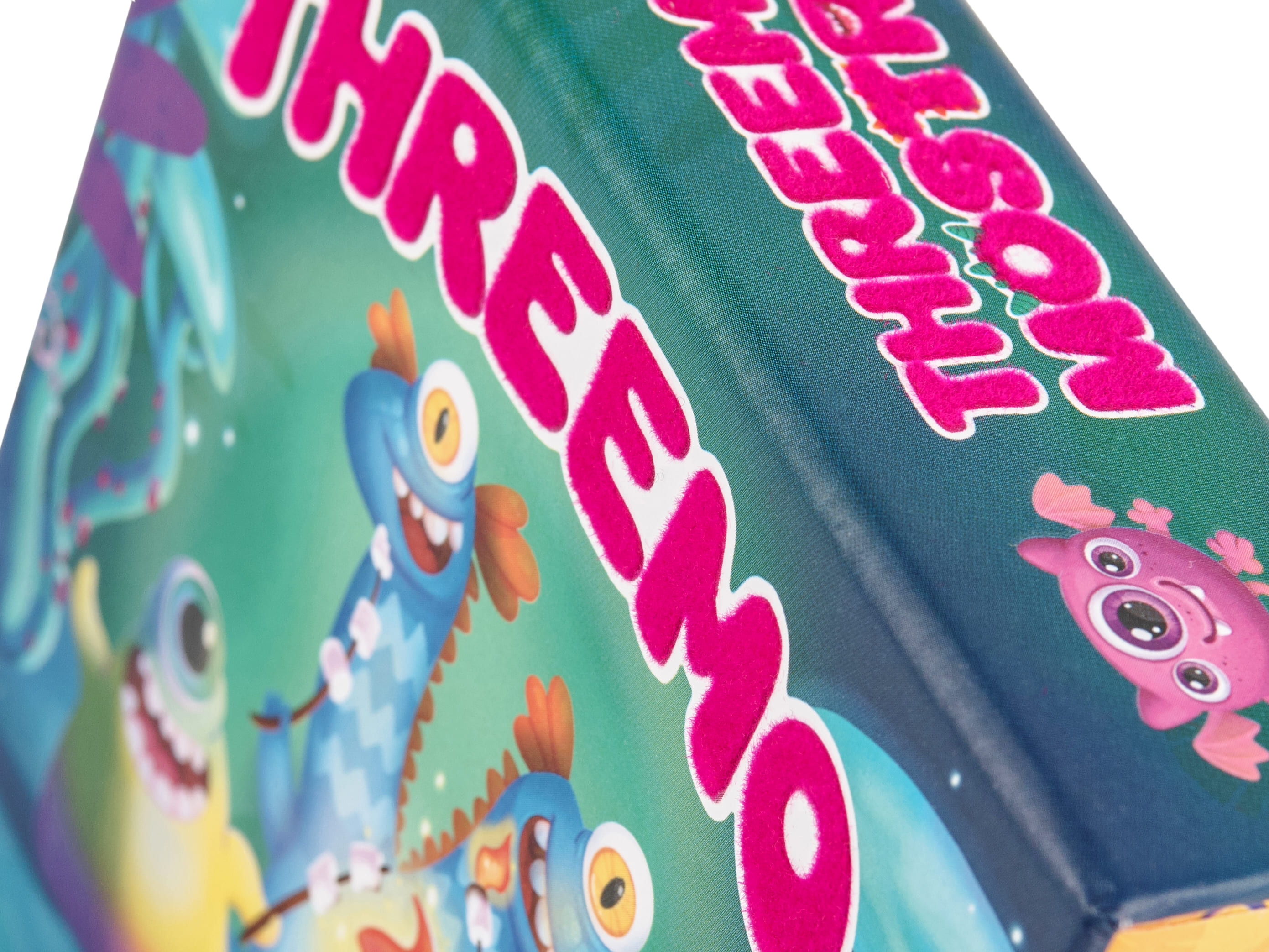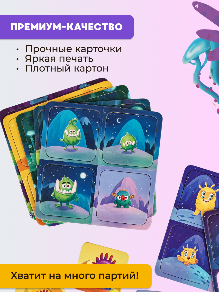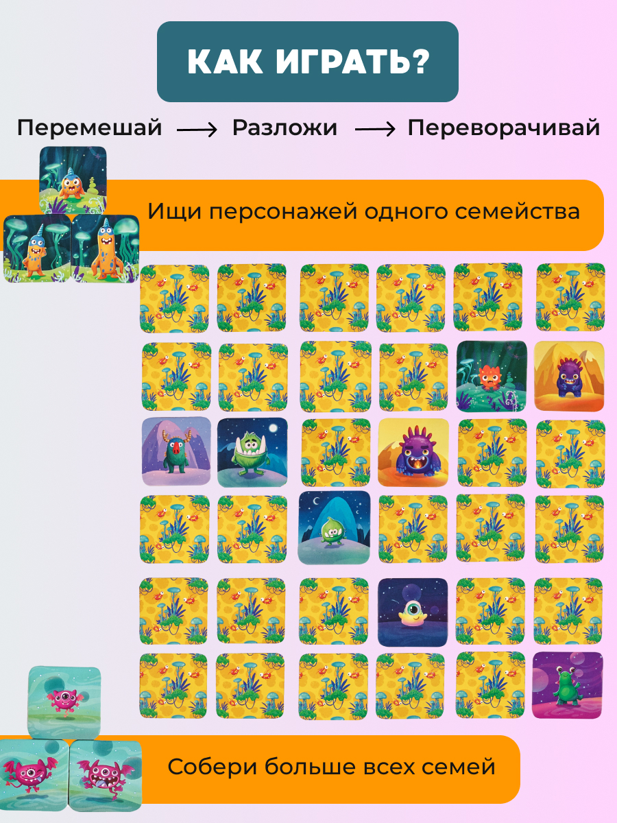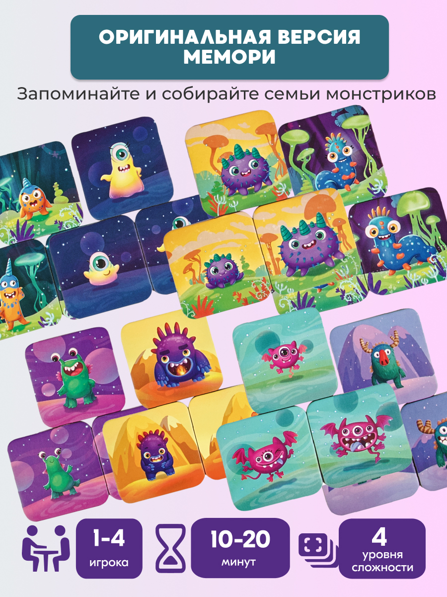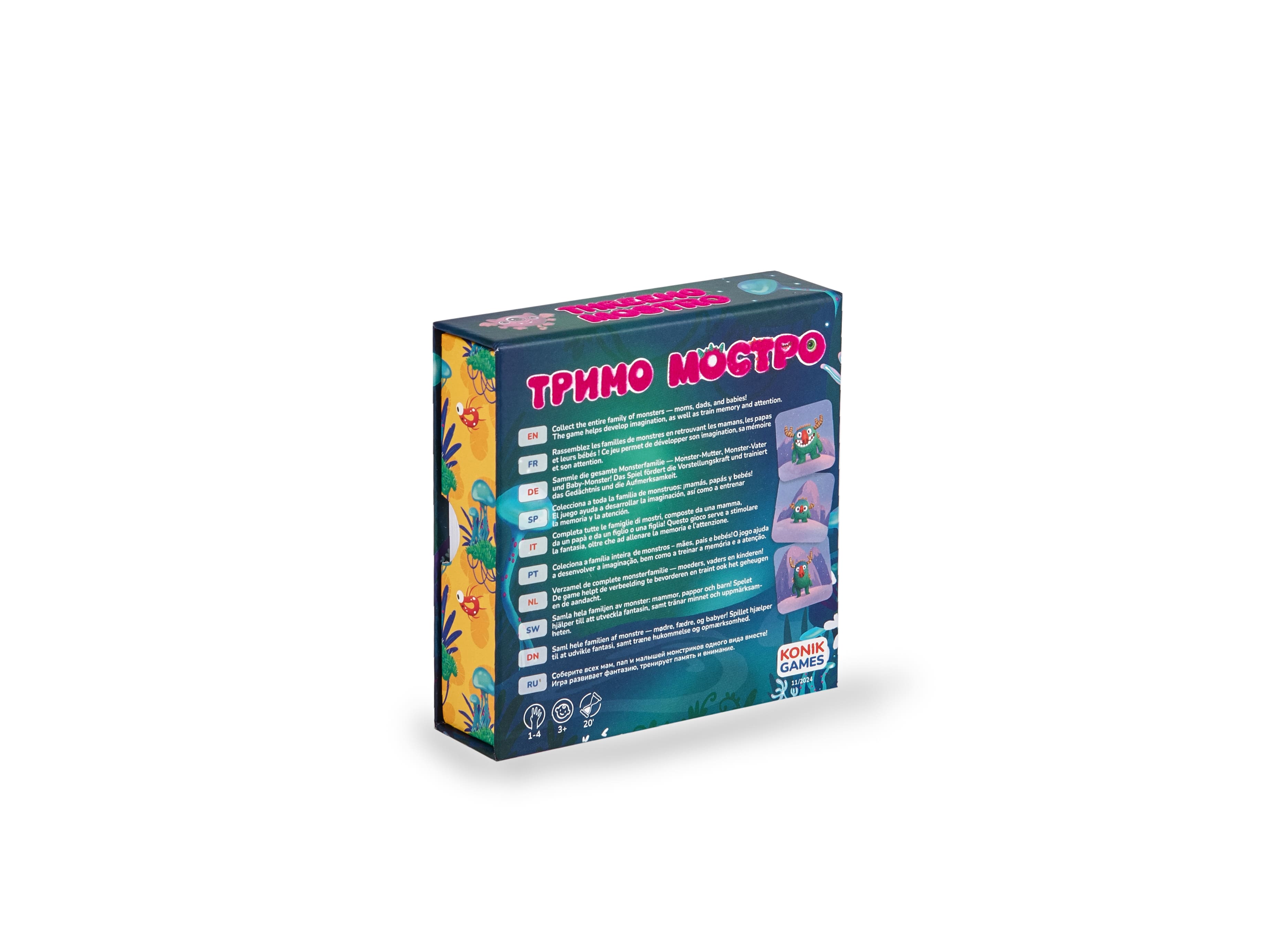 Добрая настольная игра-головоломка THREEMO MONSTRO — это необычное мемори приключение. В ней нет ни одной одинаковой карточки! Найди не просто пару или дубли, а поймай целую семью монстрика. Угадай, кто где прячется. Запомни и попробуй повтори в свой ход.