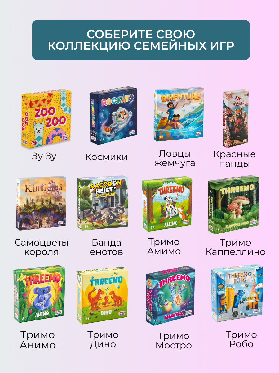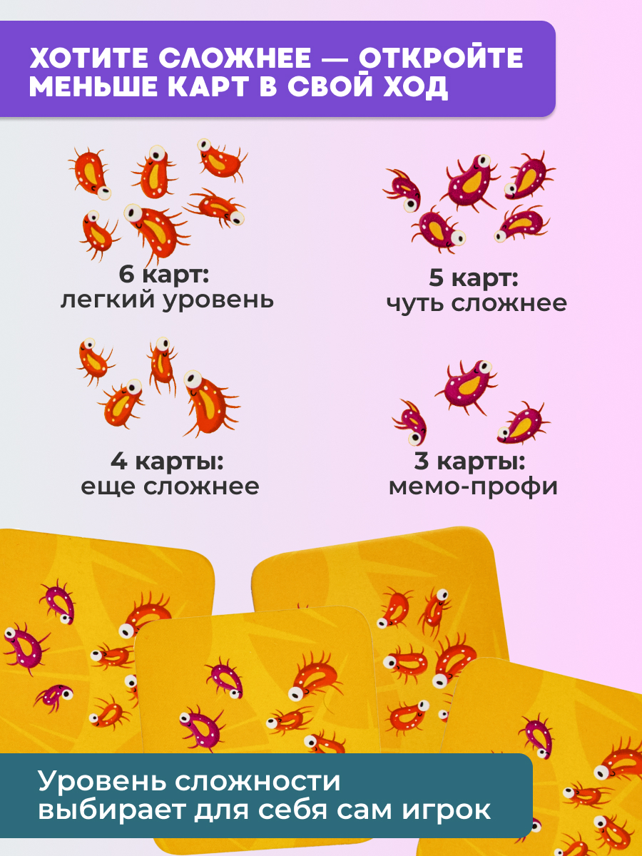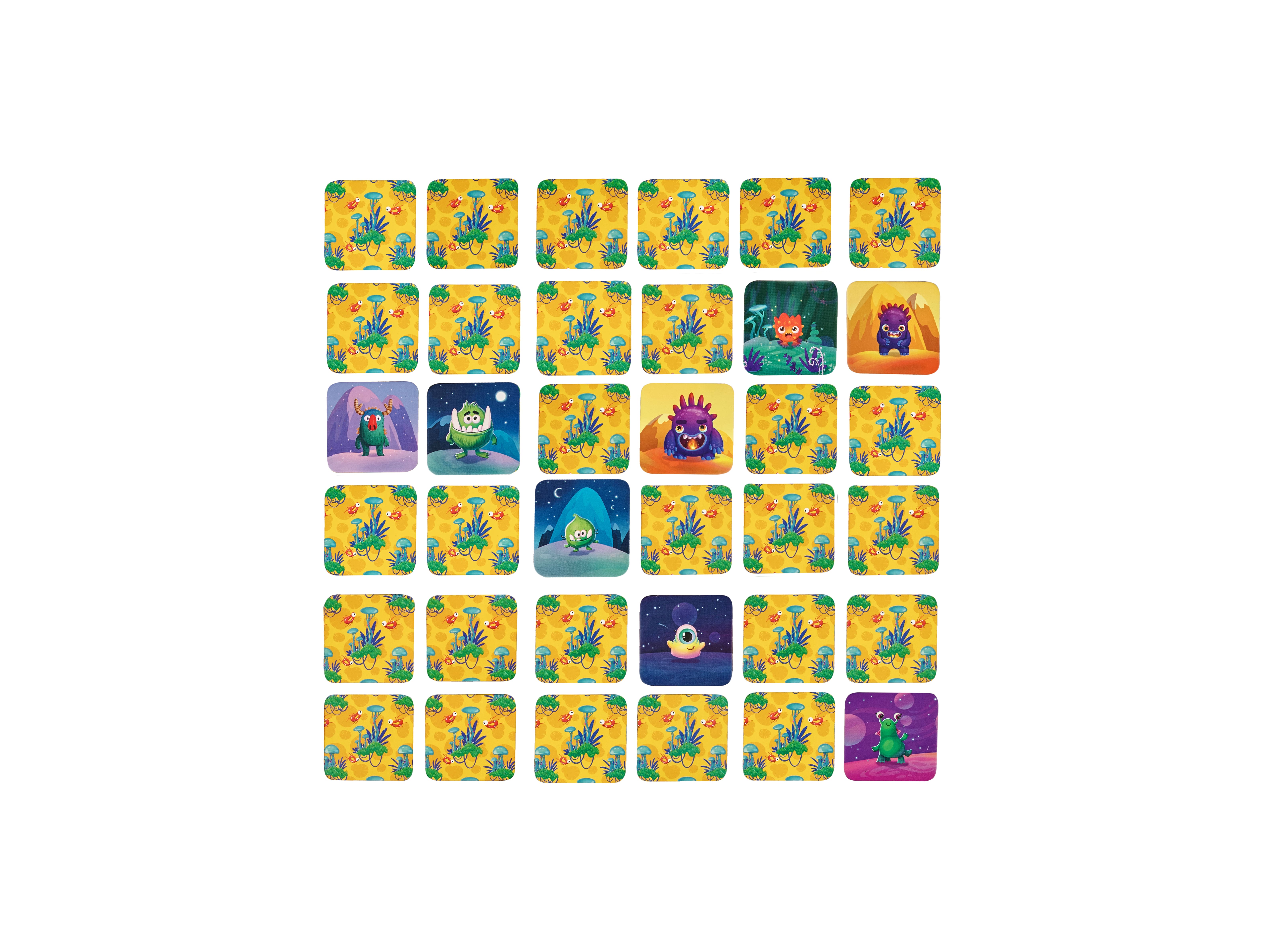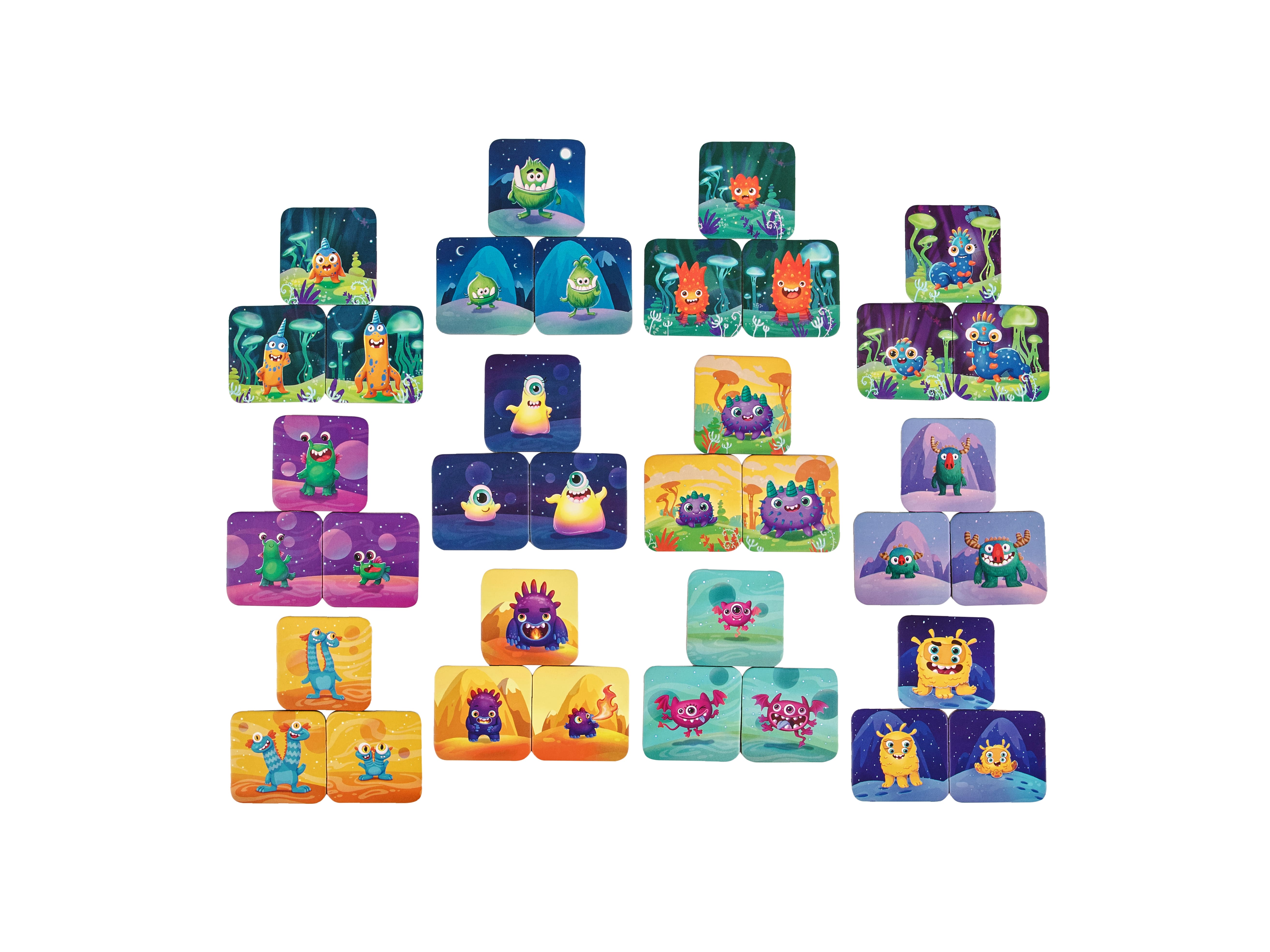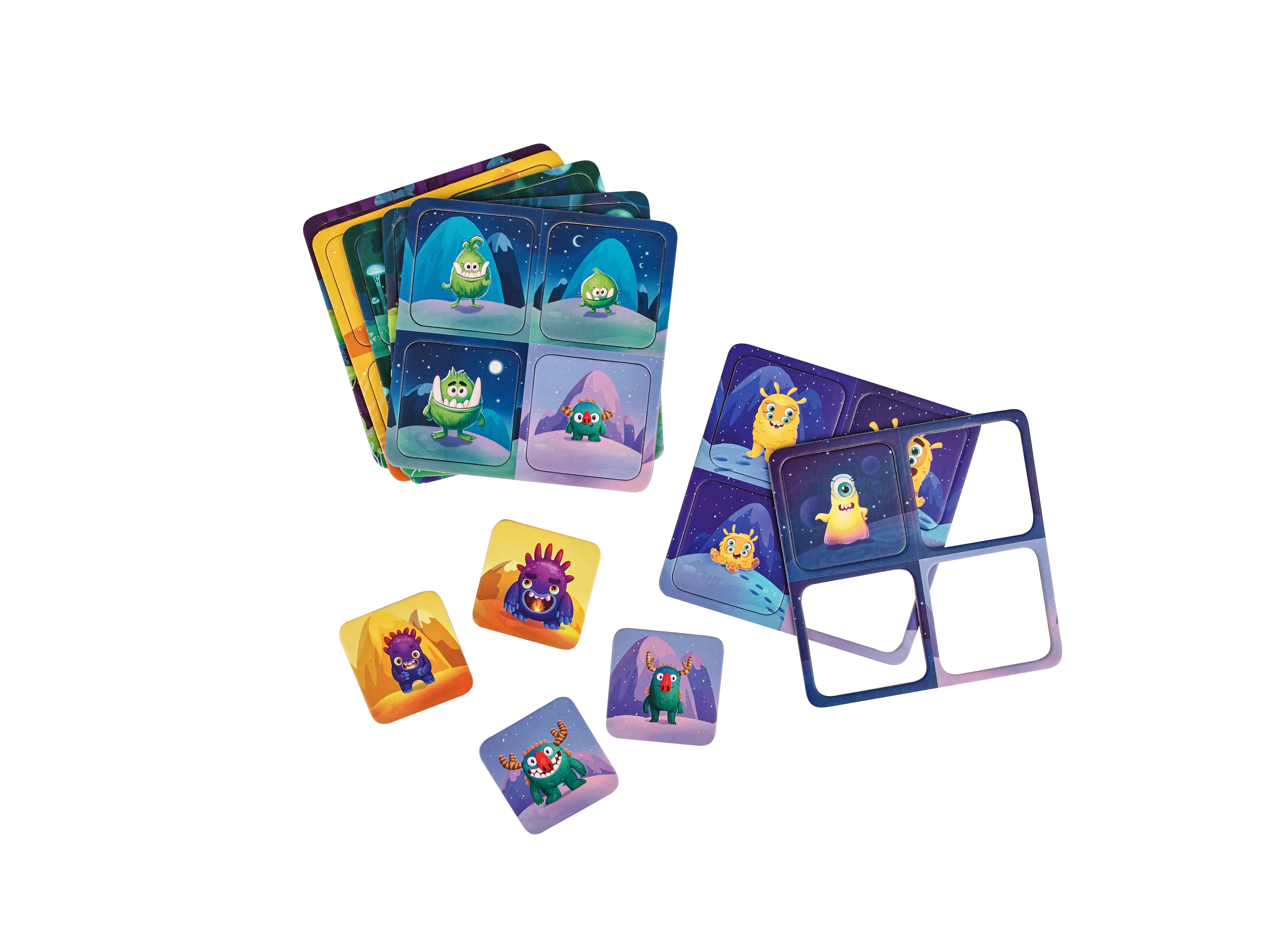 Добрая настольная игра-головоломка THREEMO MONSTRO — это необычное мемори приключение. В ней нет ни одной одинаковой карточки! Найди не просто пару или дубли, а поймай целую семью монстрика. Угадай, кто где прячется. Запомни и попробуй повтори в свой ход.