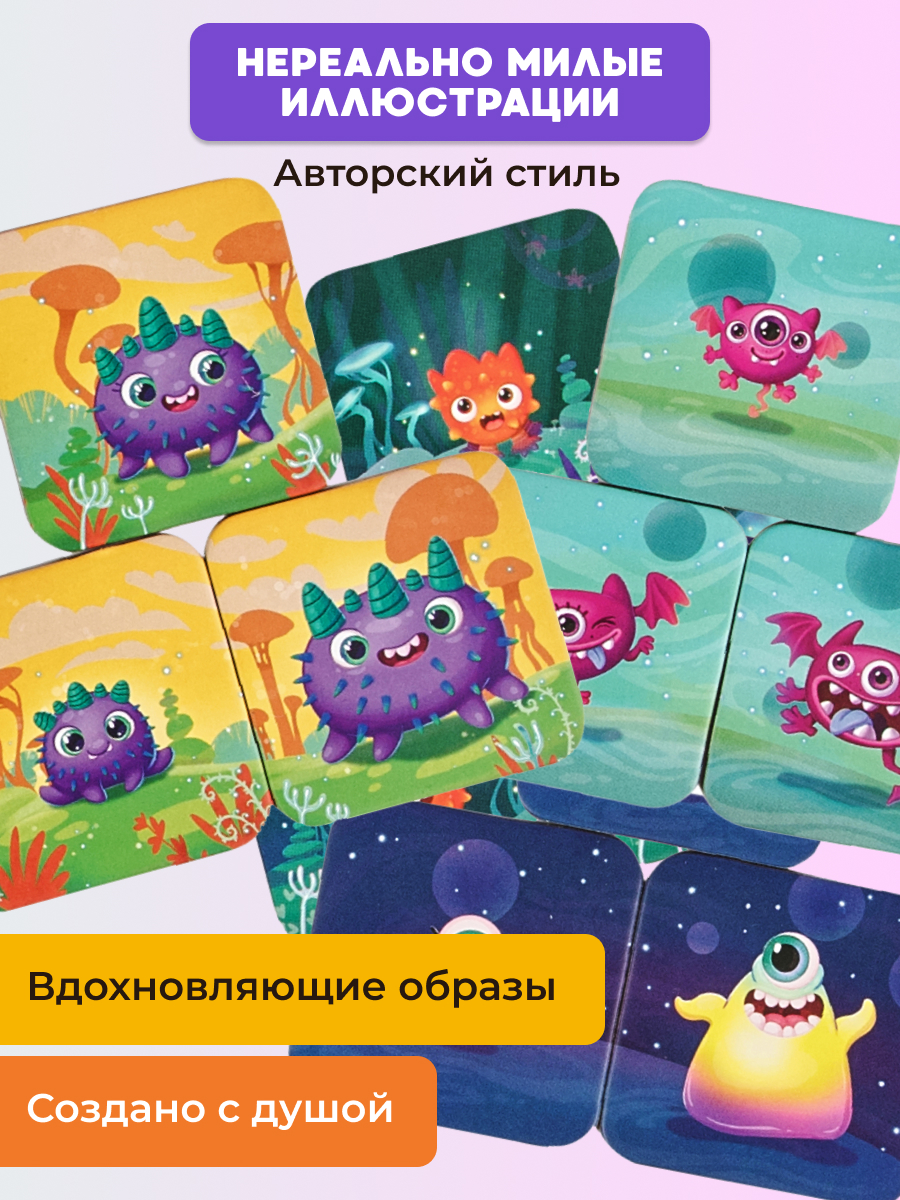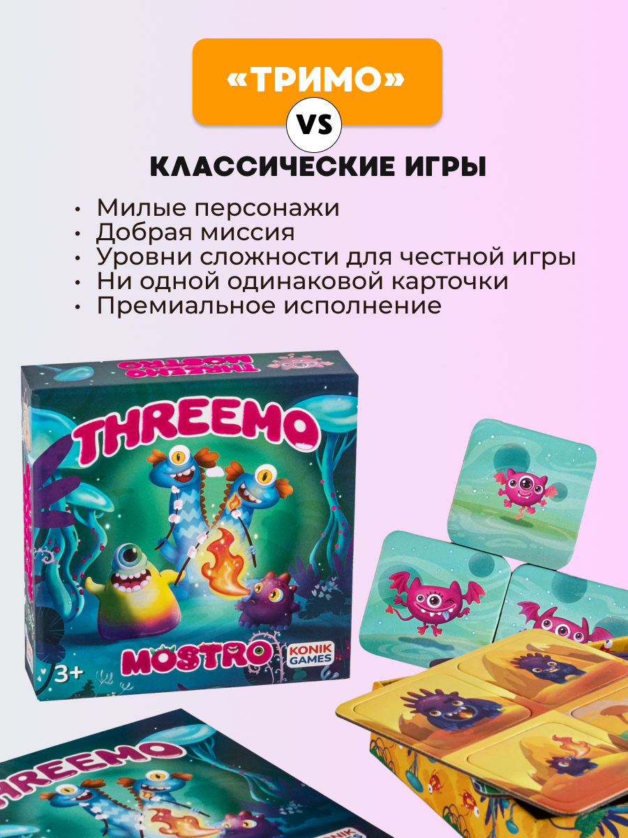 Тримо Монстро рекомендуют родители, педагоги, логопеды. Озорная банда монстриков помогает вырастить умников и умниц, тренируя память. Для победы нужен коварный ум и хитрый зоркий глаз алмаз. Картинки героев живые и милые. Авторские персонажи, словно мультики, а не банальные лис, заяц, волк. Партия идет легко и азартно. Правила простые — читай, а сразу хватай стульчики, чтобы играть!