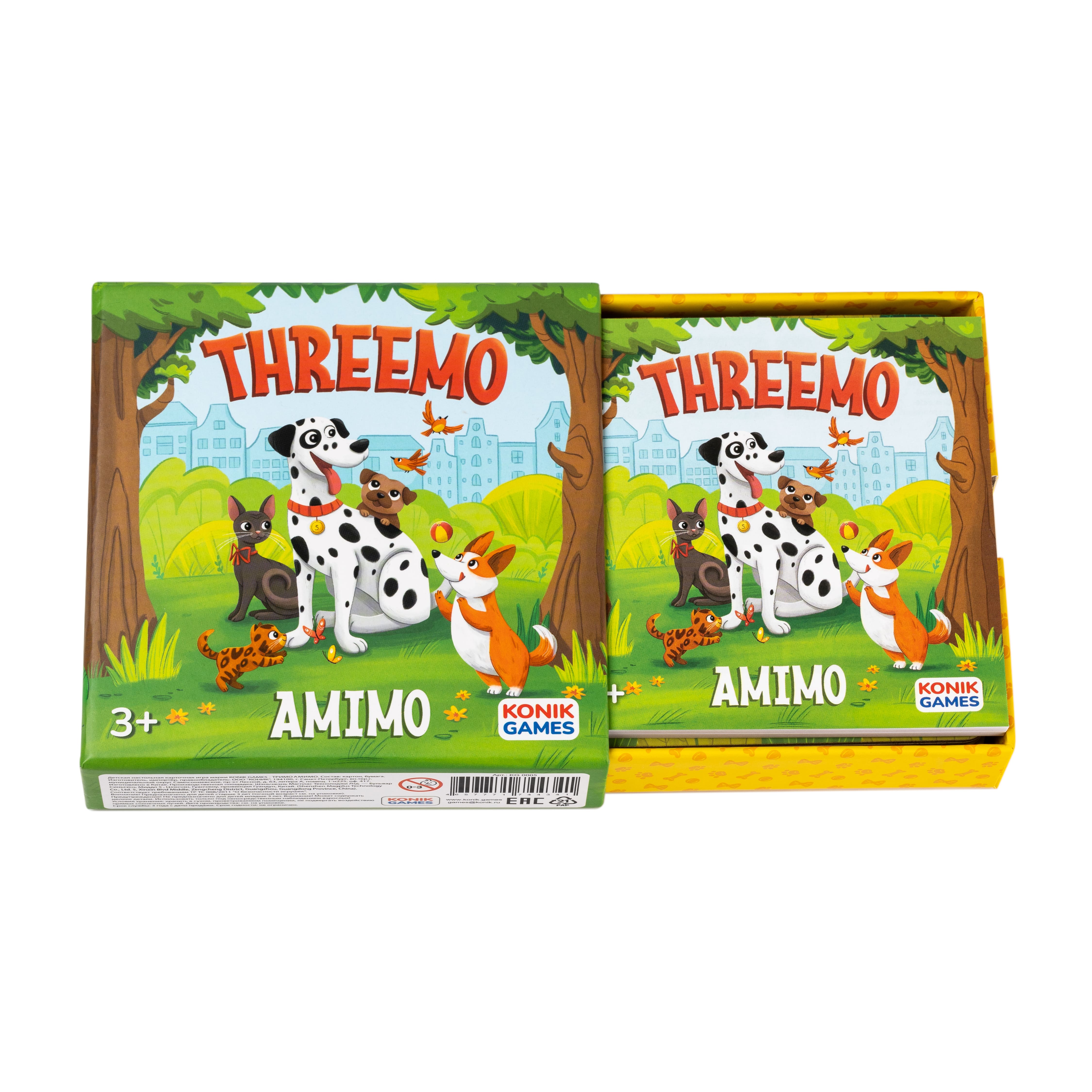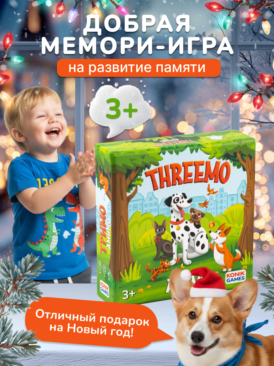 THREEMO AMIMO от KONIK GAMES — это оригинальная вариация мемо для всей семьи. В ней нет ни одной одинаковой карточки! Зато есть 4 уровня сложности — каждый участник сможет подобрать для себя подходящий.