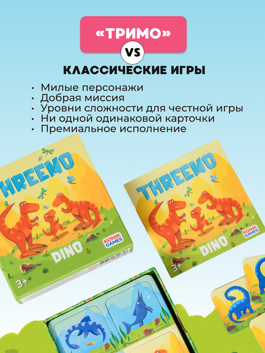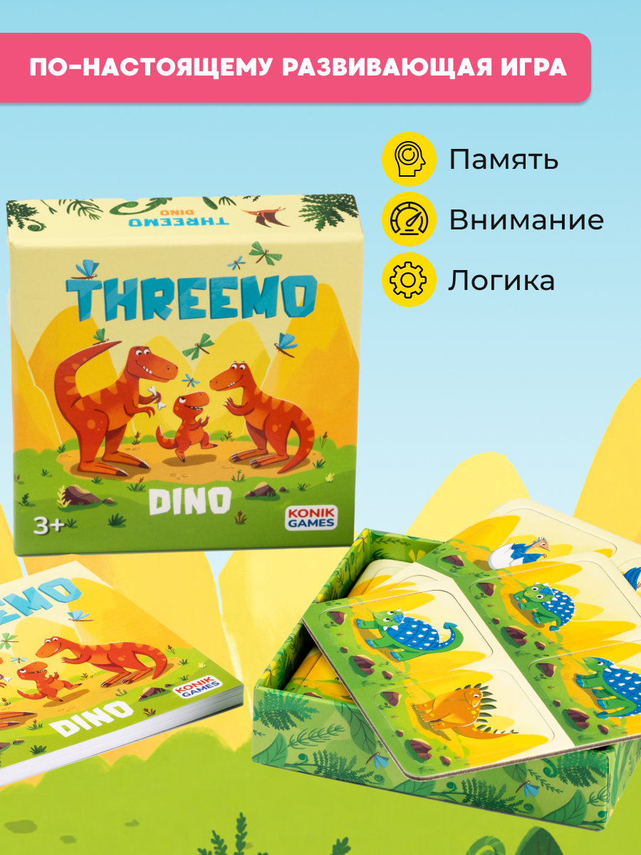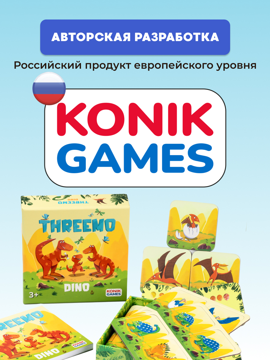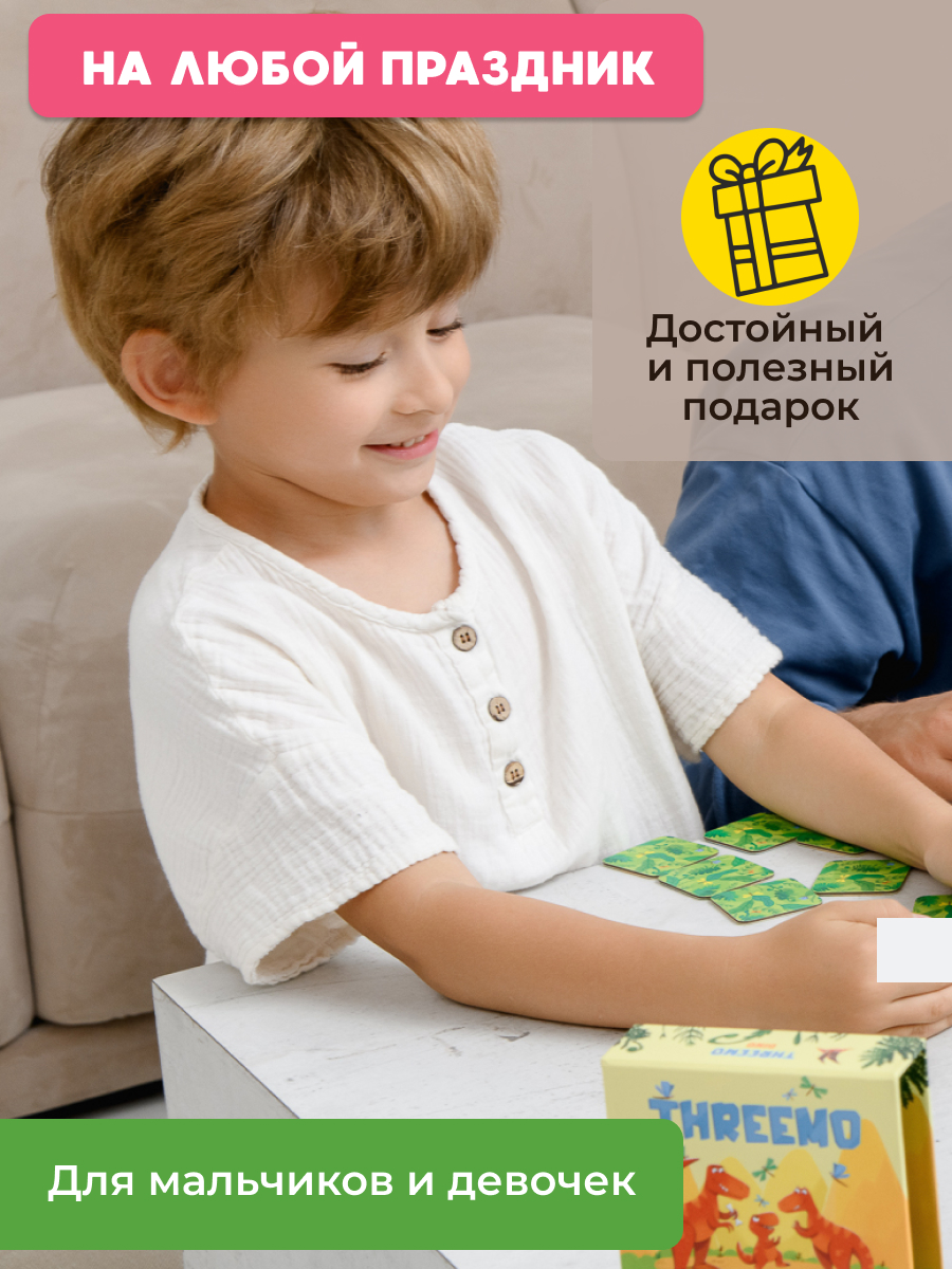Серия THREEMO – это оригинальная вариация всем известной мемо. В ней нет ни одной одинаковой карточки! Зато есть 4 уровня сложности – каждый участник сможет подобрать для себя подходящий. Это позволяет одновременно играть всей семьёй – в полную силу и с шансами на победу.