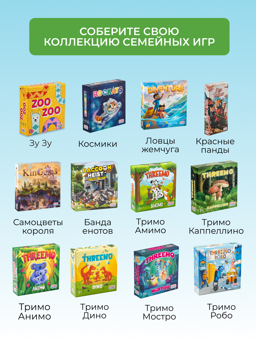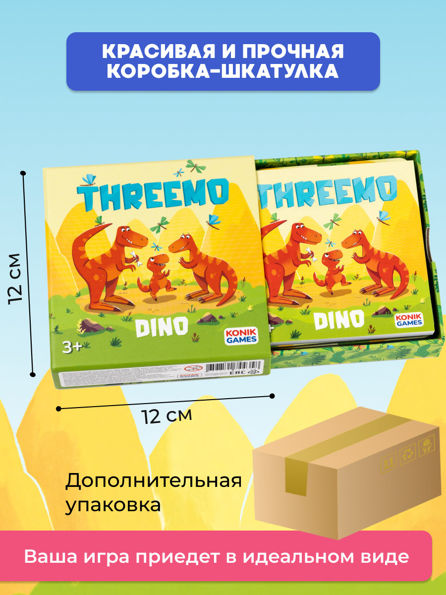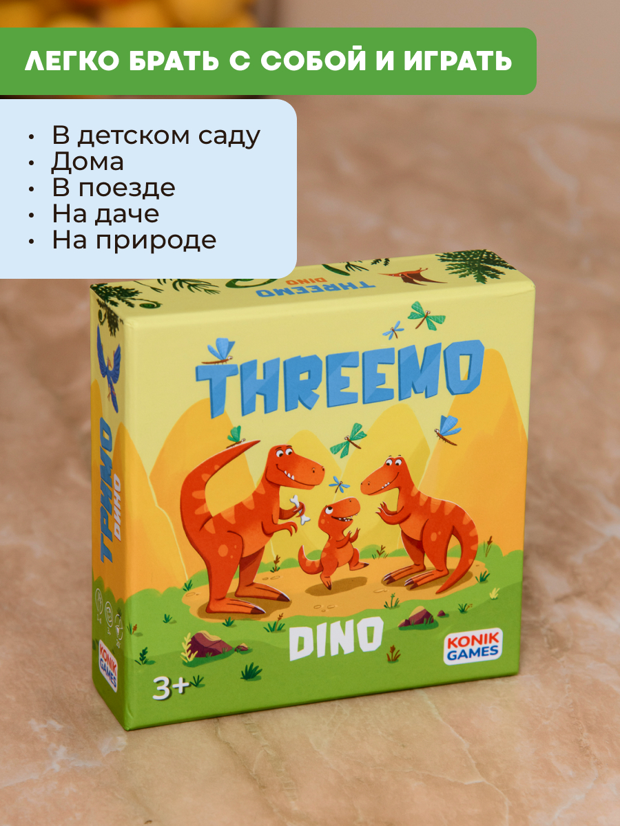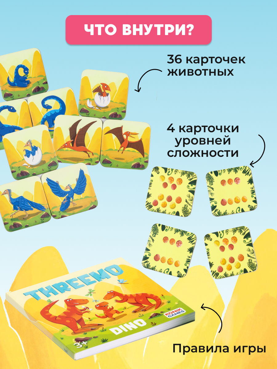 Серия THREEMO – это оригинальная вариация всем известной мемо. В ней нет ни одной одинаковой карточки! Зато есть 4 уровня сложности – каждый участник сможет подобрать для себя подходящий. Это позволяет одновременно играть всей семьёй – в полную силу и с шансами на победу.