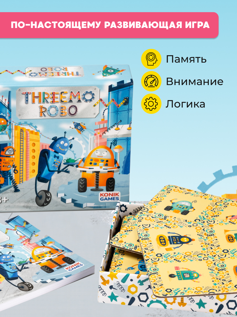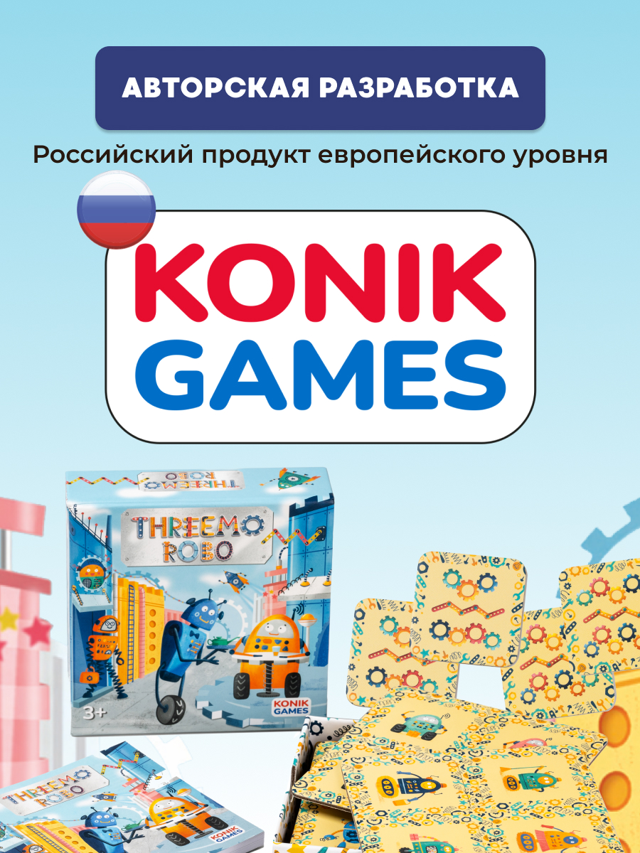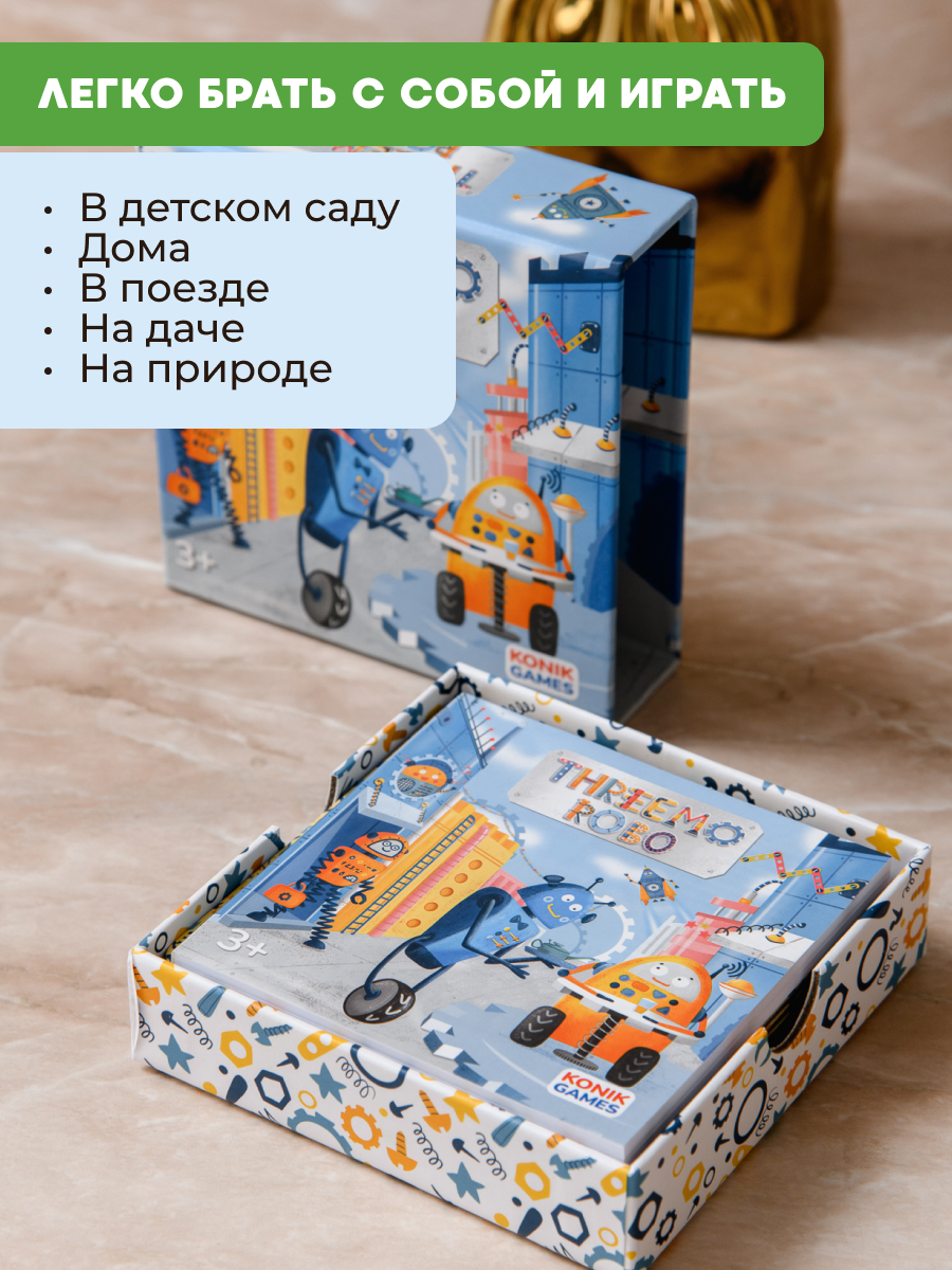 ТРИМО РОБО от КОНИК ГЕЙМС отлично развивает память, внимание, логику и подходит для детей от 3 лет и всей семьи. Все иллюстрации созданы с душой и вдохновением, а благодаря красочной и плотной коробке эта настольная игра станет приятным подарком.