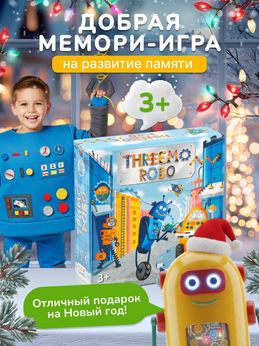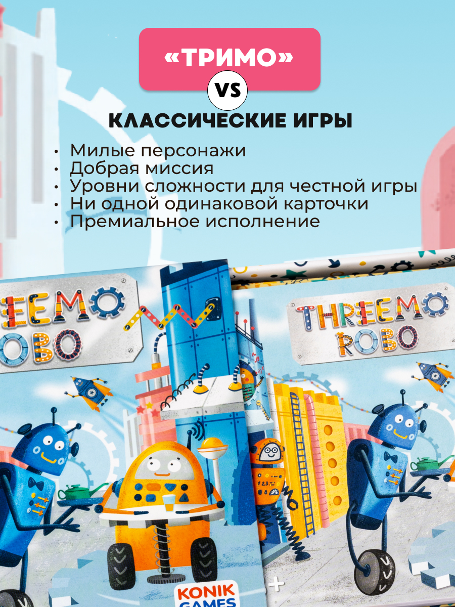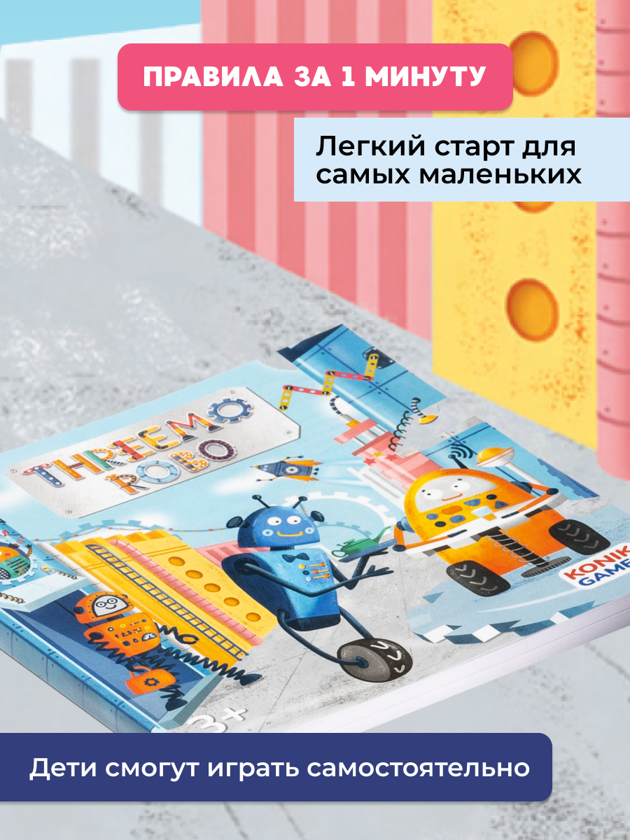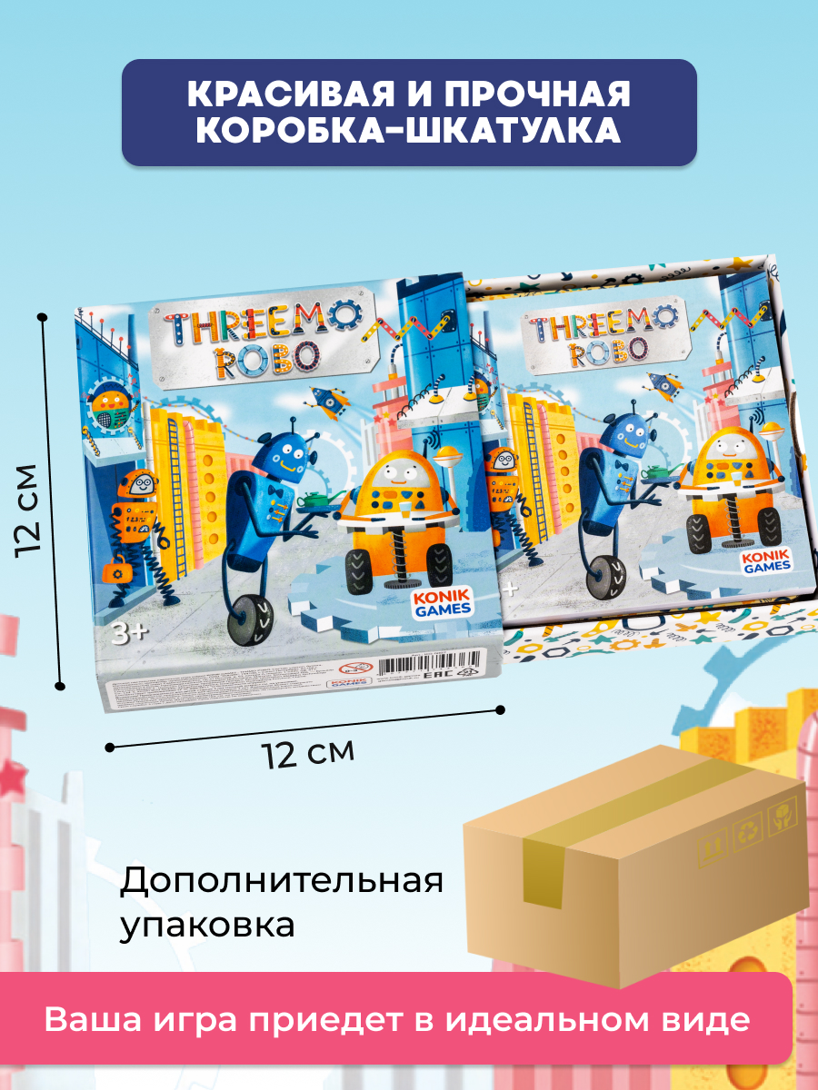 ТРИМО РОБО от КОНИК ГЕЙМС отлично развивает память, внимание, логику и подходит для детей от 3 лет и всей семьи. Все иллюстрации созданы с душой и вдохновением, а благодаря красочной и плотной коробке эта настольная игра станет приятным подарком.