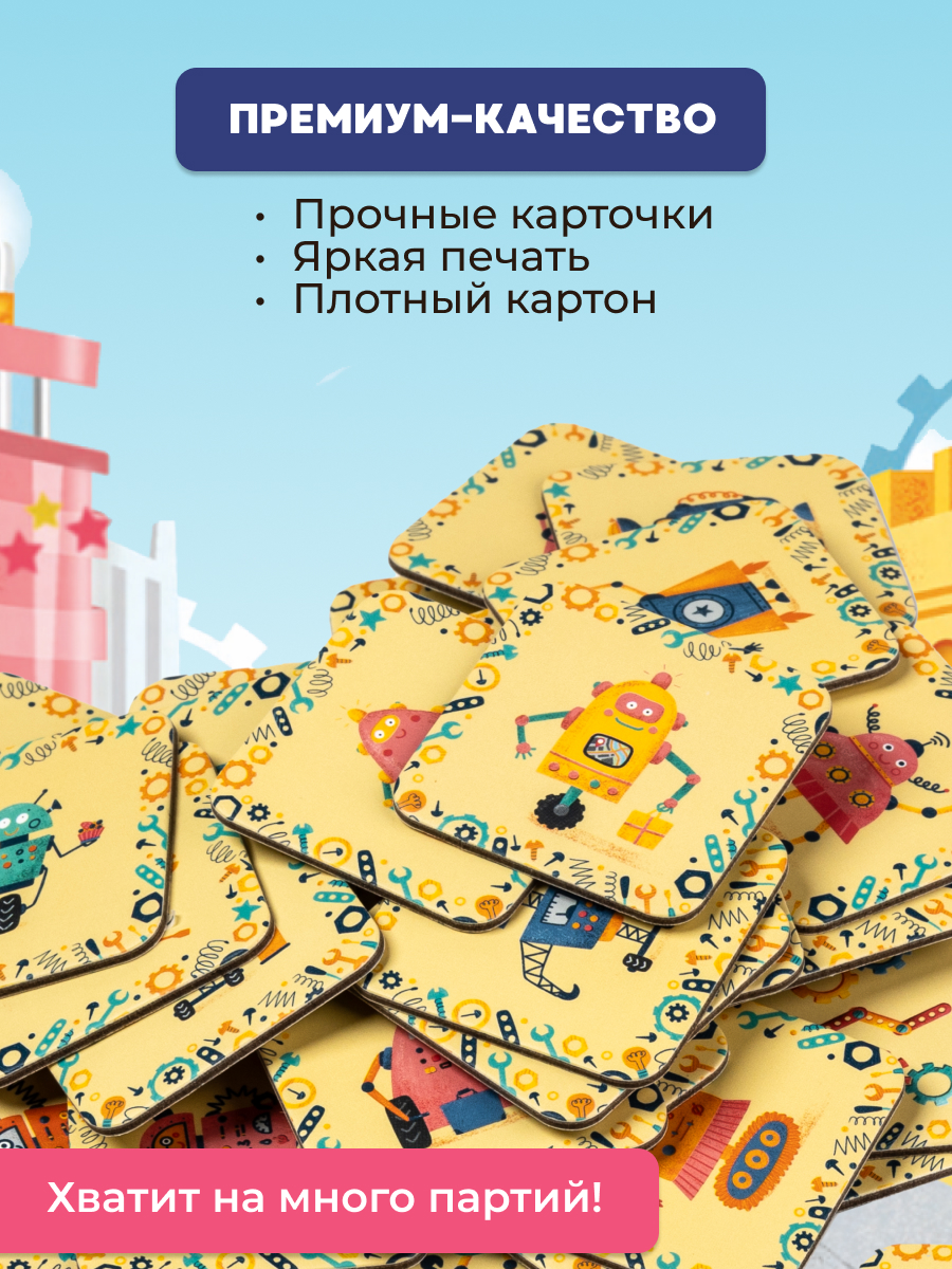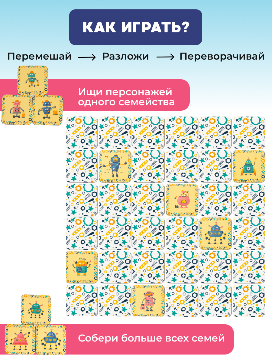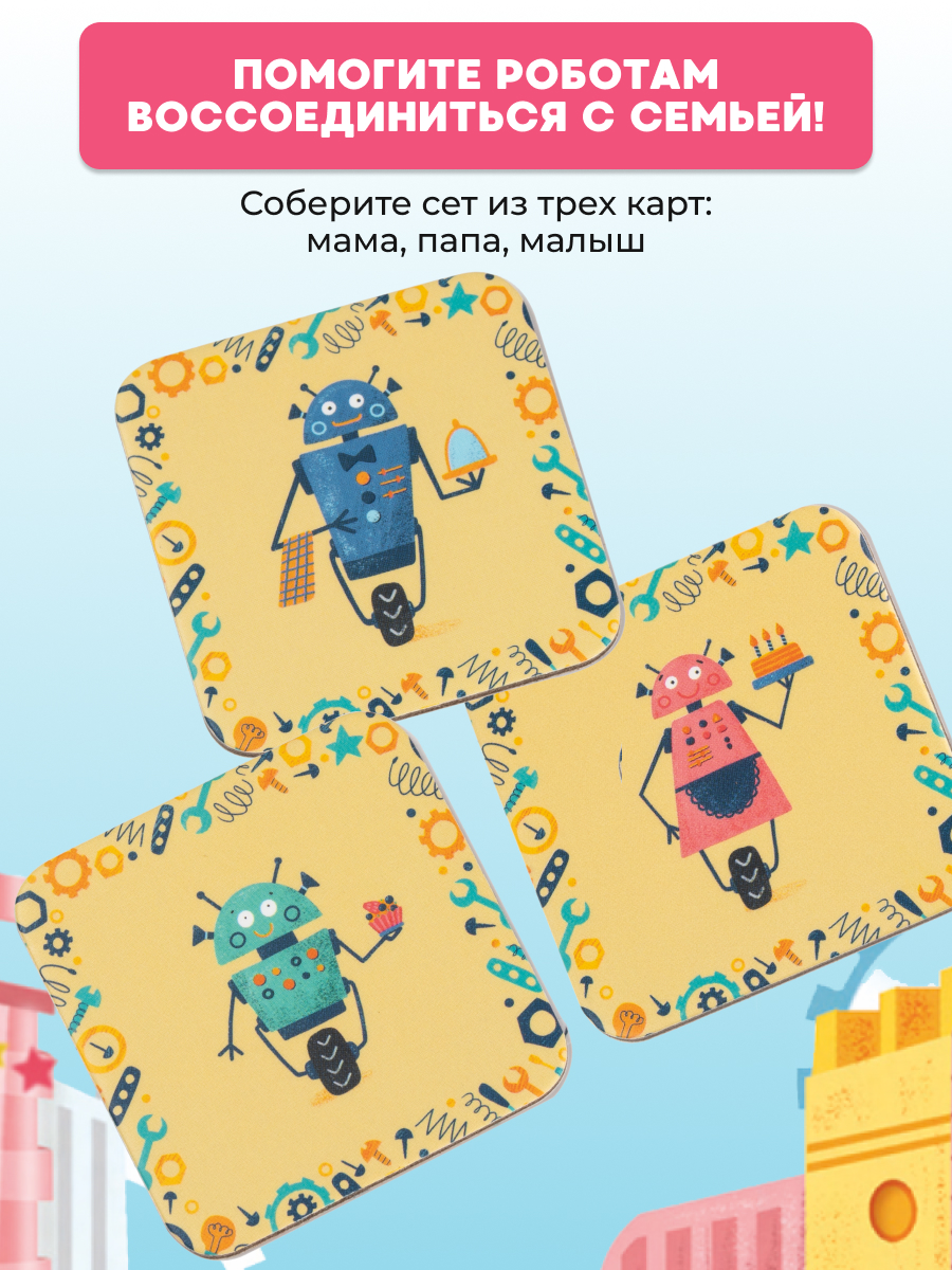 В этой веселой настольной игре вам предстоит собрать как можно больше сетов «мама, папа и малыш» из семейств трудолюбивых роботов. Обратите внимание — каждую семью объединяет не цвет, а форма и функционал. В свой ход игроки могут открывать от 3 до 6 карточек. Это позволяет одновременно играть и детям, и родителям – в полную силу и с шансами на победу!