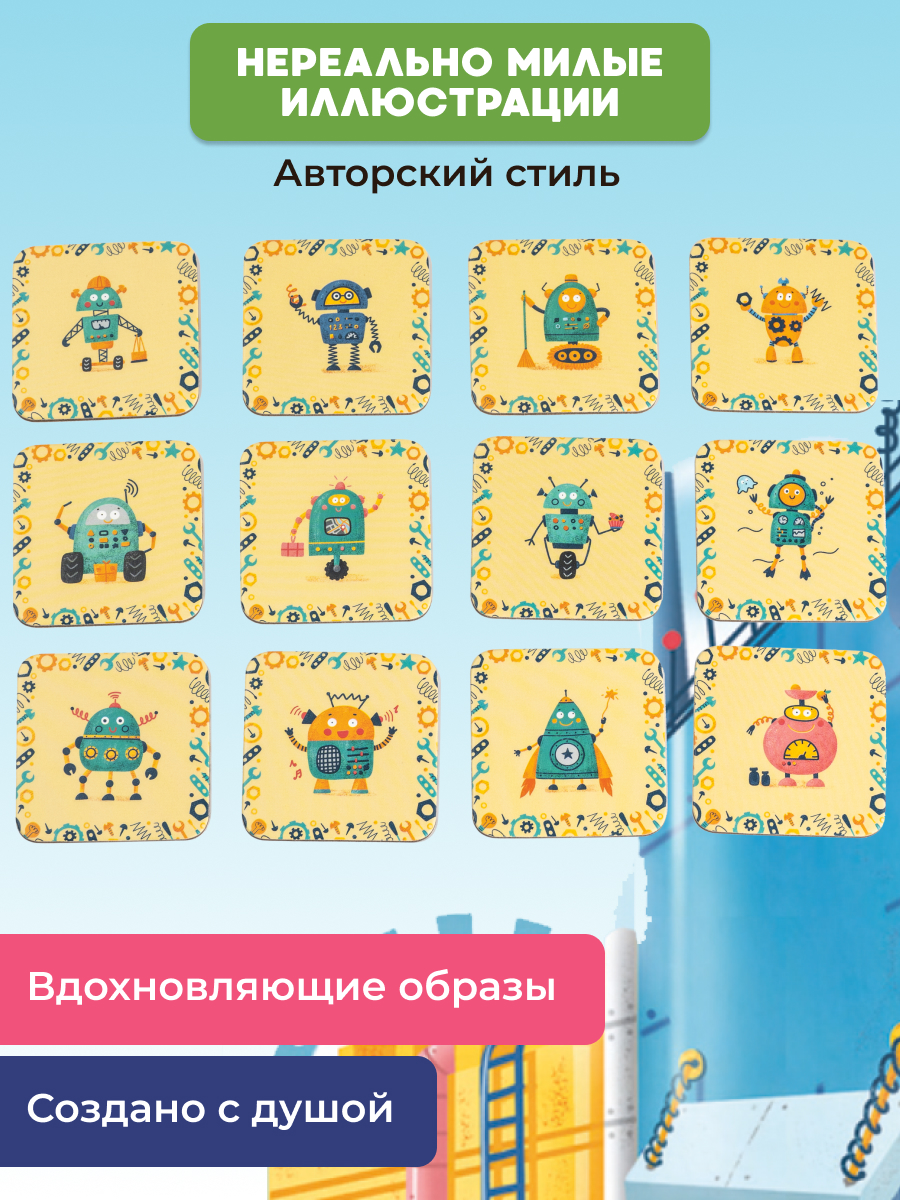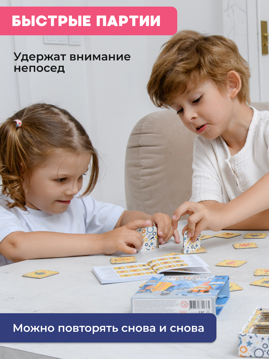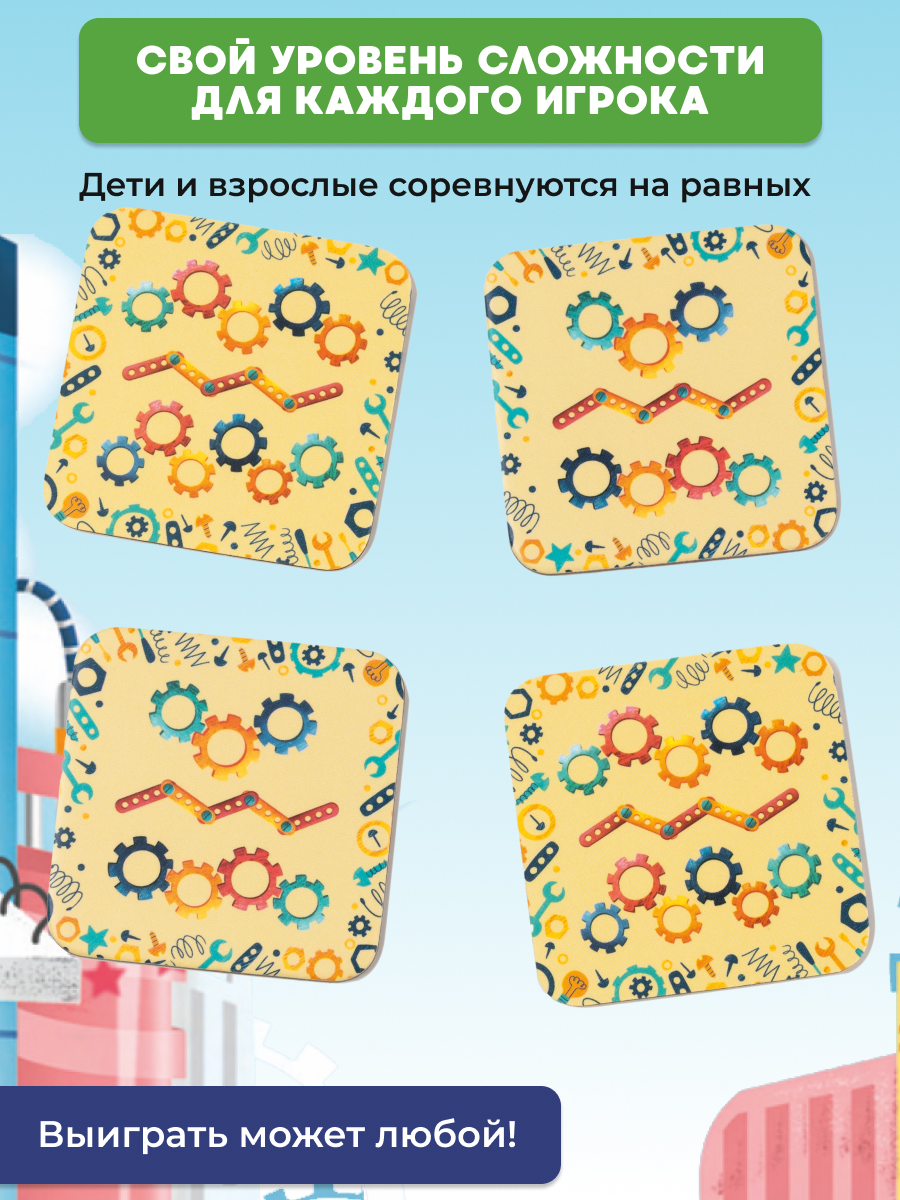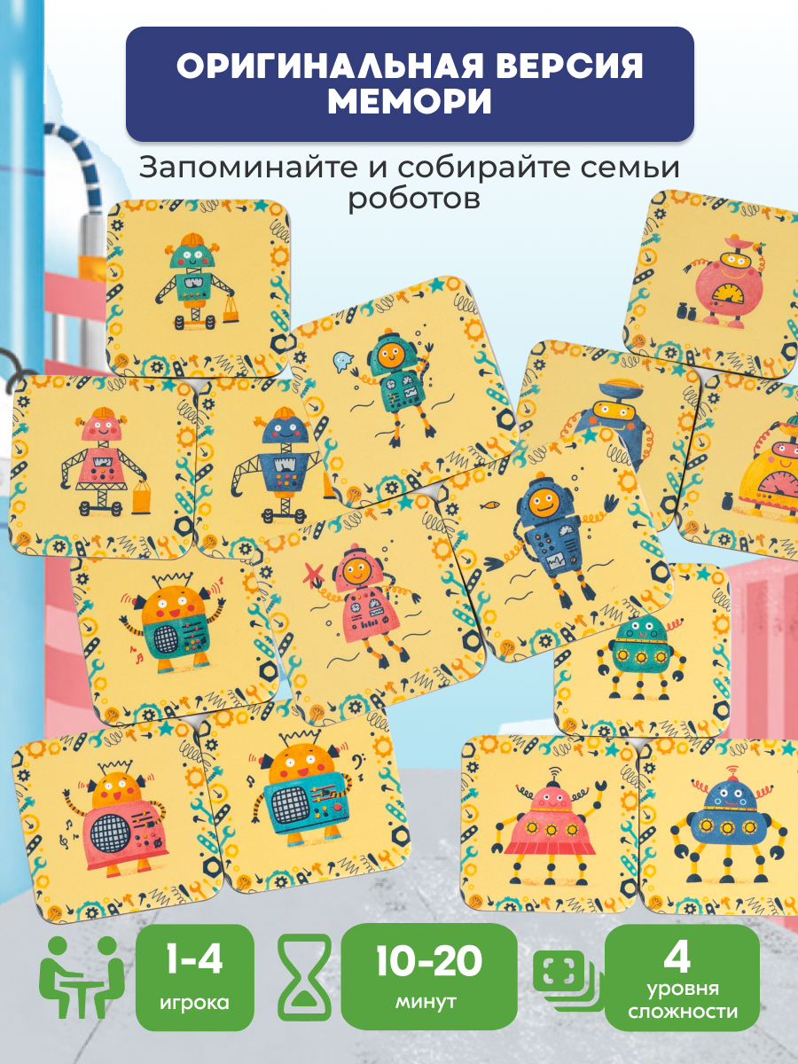 В этой веселой настольной игре вам предстоит собрать как можно больше сетов «мама, папа и малыш» из семейств трудолюбивых роботов. Обратите внимание — каждую семью объединяет не цвет, а форма и функционал. В свой ход игроки могут открывать от 3 до 6 карточек. Это позволяет одновременно играть и детям, и родителям – в полную силу и с шансами на победу!