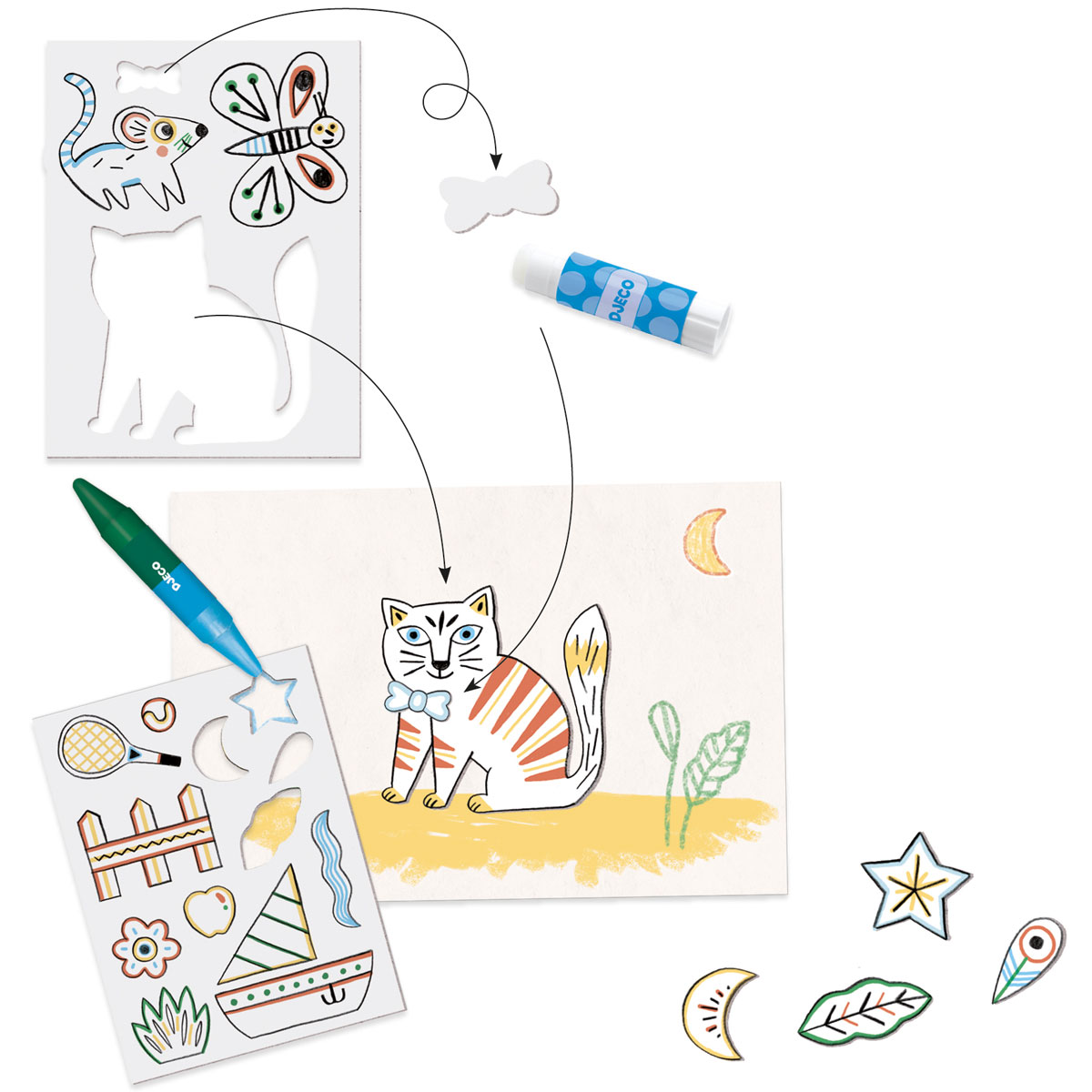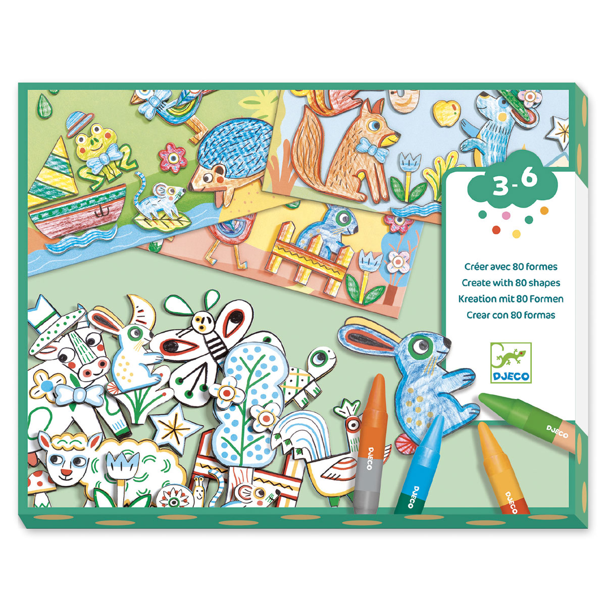 Креативный набор на тему животных, предназначенный для детей от 3 до 6 лет. Содержит всевозможные прочные картонные фигурки, которые можно раскрасить и приклеить к 6 сценкам. Пошаговые инструкции включают несколько шаблонов.