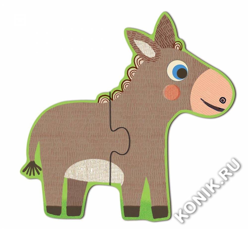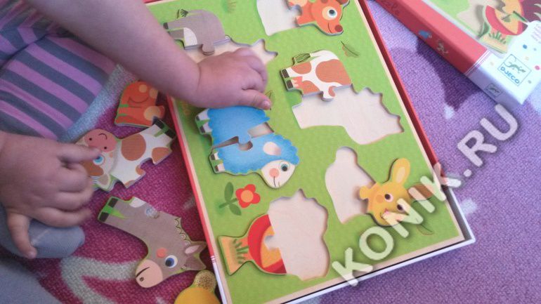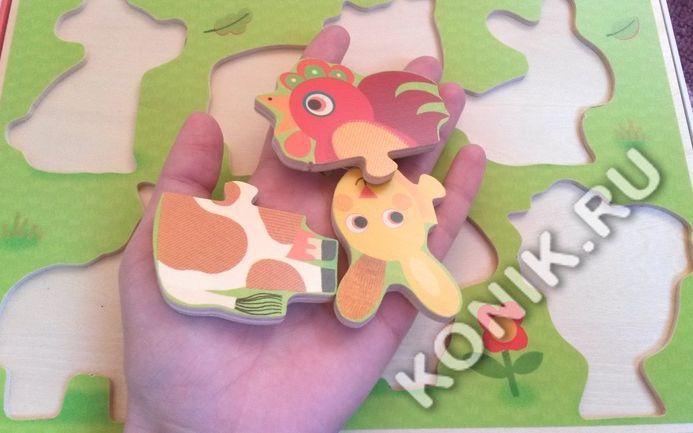 Малышу предстоит подобрать животное в соответствующую по форме выемку на рамке. Кроме того, эта игра является еще и пазлом, деревянные фигурки животных состоят из двух частей, которые нужно собрать и создать полноценную фигурку.