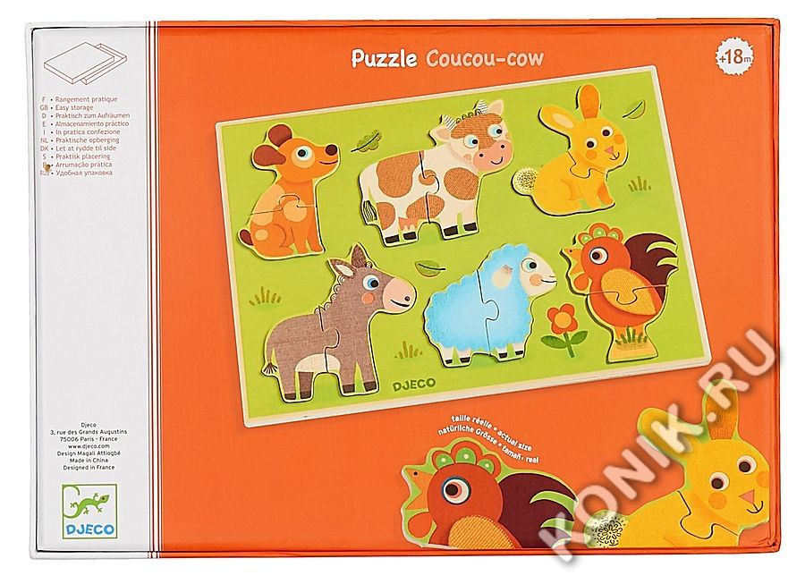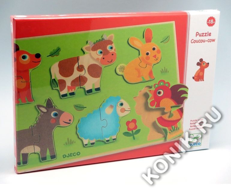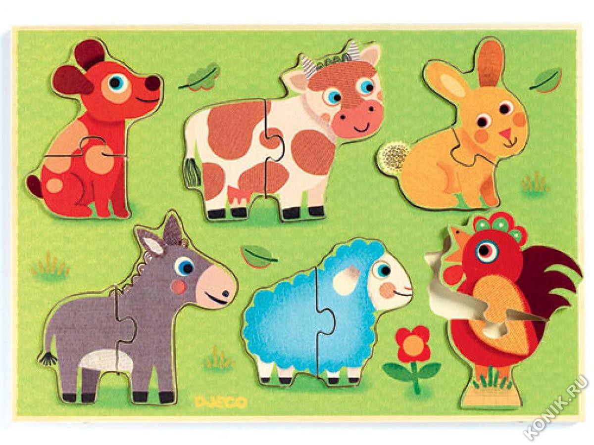 Деревянная рамка-вкладыш «Животные на лугу» от французского производителя Djeco познакомит вашего ребёнка с домашними животными, которые пасутся на лугу: коровой, овечкой, осликом, кроликом, петушком и собакой.