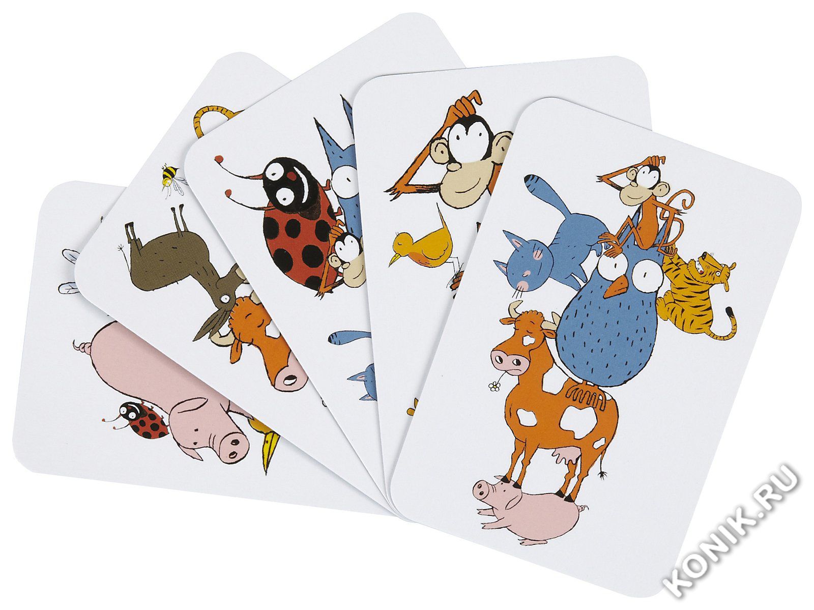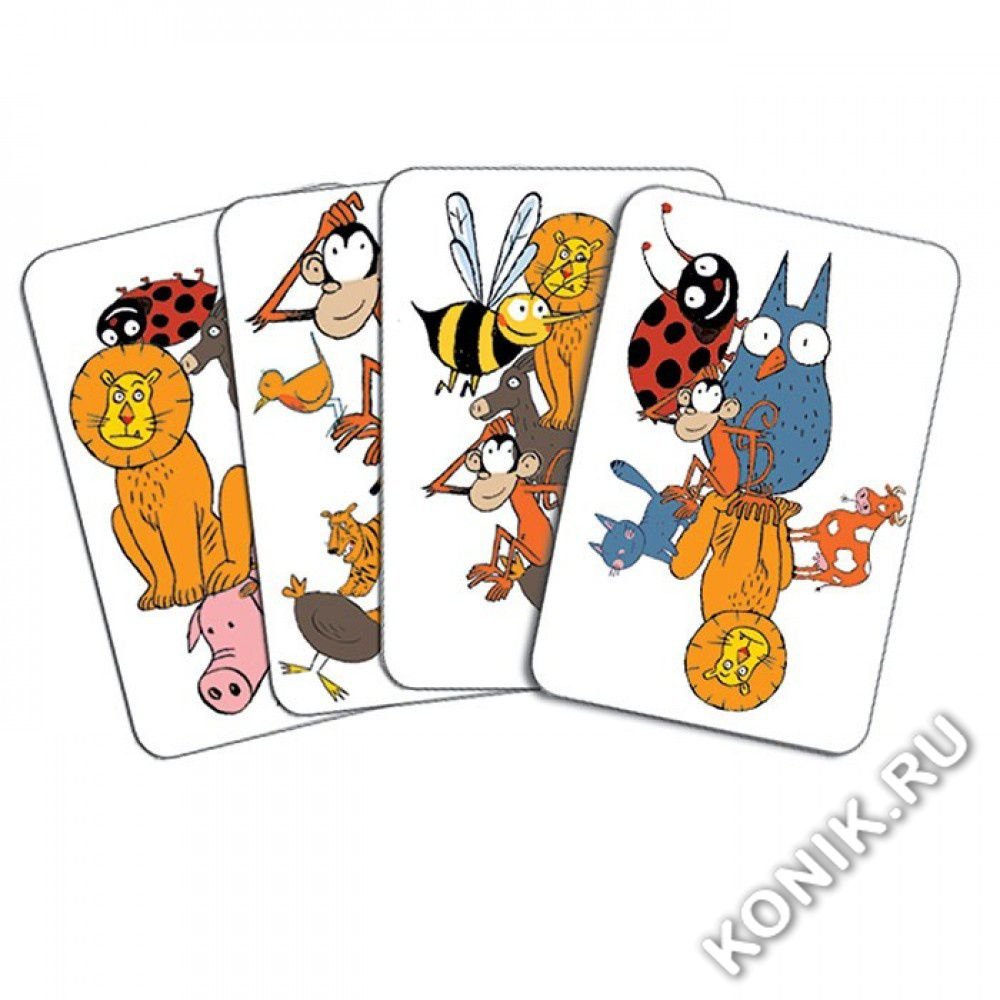 Лев, божья коровка, обезьяна, сова, свинья… Какая мешанина животных! Чтобы первым найти животное, общее для всех карточек, вам понадобится острый орлиный глаз!