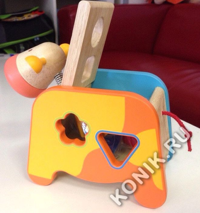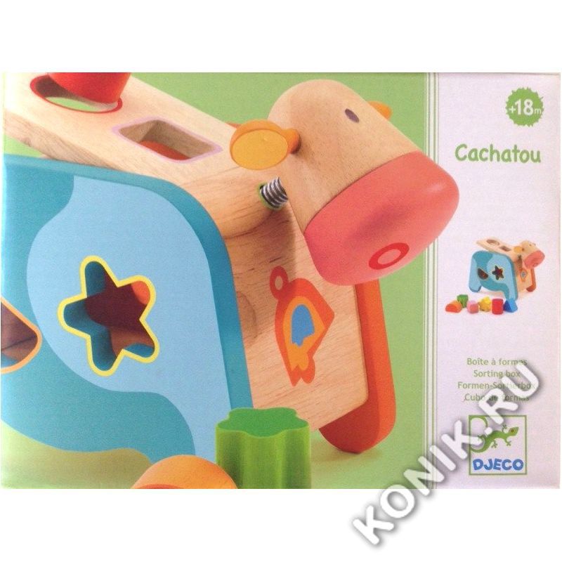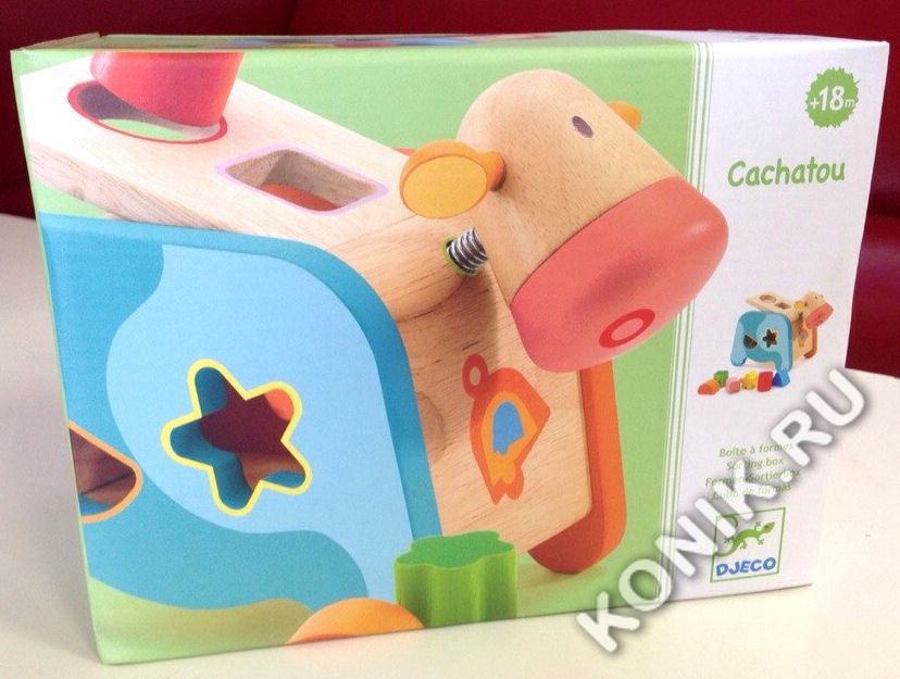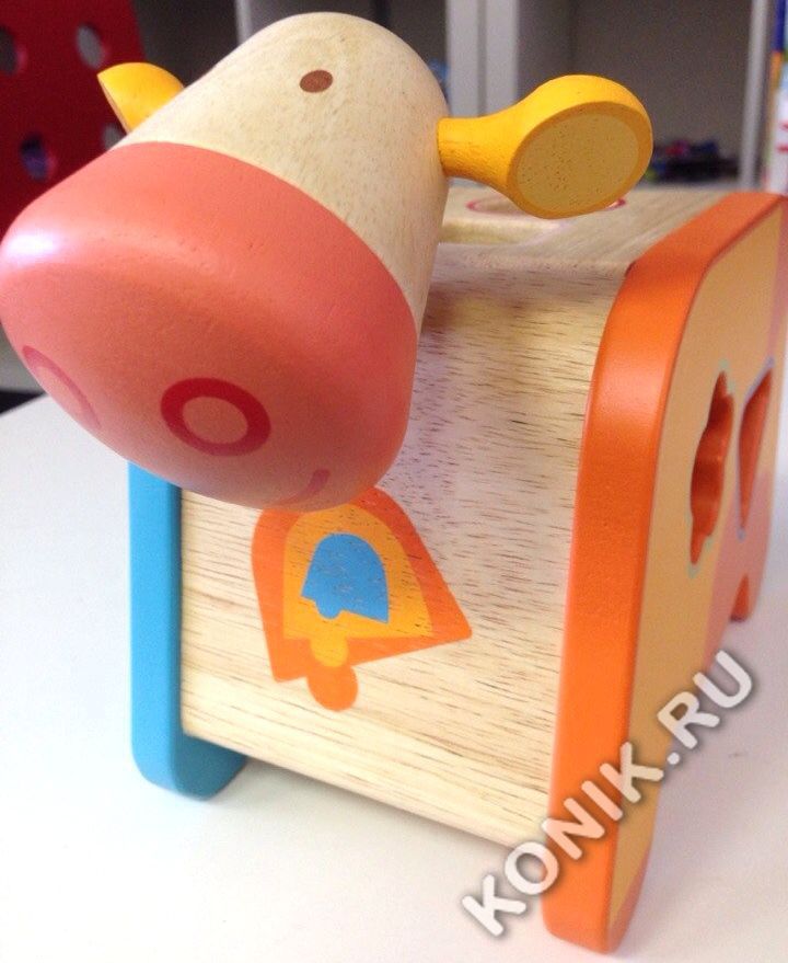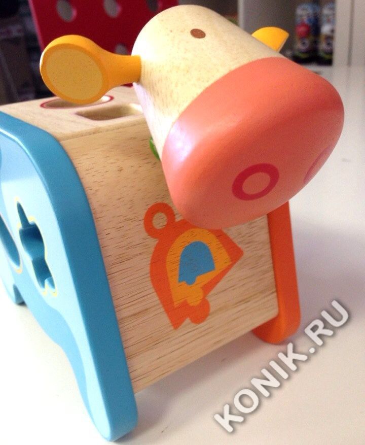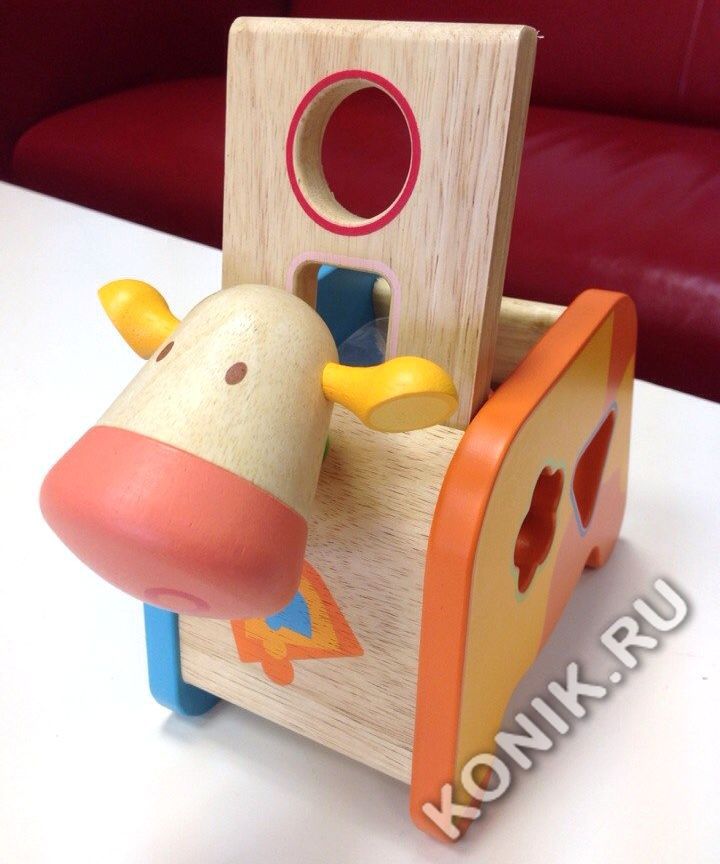 Коробка для сортировки в форме коровы выполнена из натурального дерева в пастельных тонах. Она содержит 6 разноцветных деталей разной формы, которые помещаются в коробку. Дети вставляют фигурки в нужные отверстия, ориентируясь на форму и цвет деталей. Как только все фигурки окажутся внутри, они смогут открыть крышку и достать кусочки.