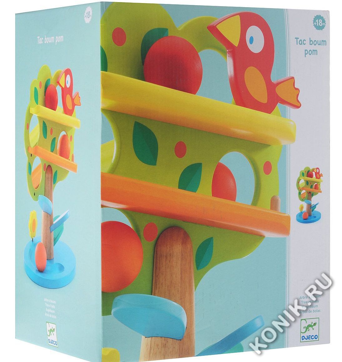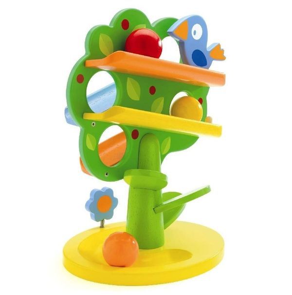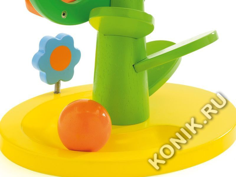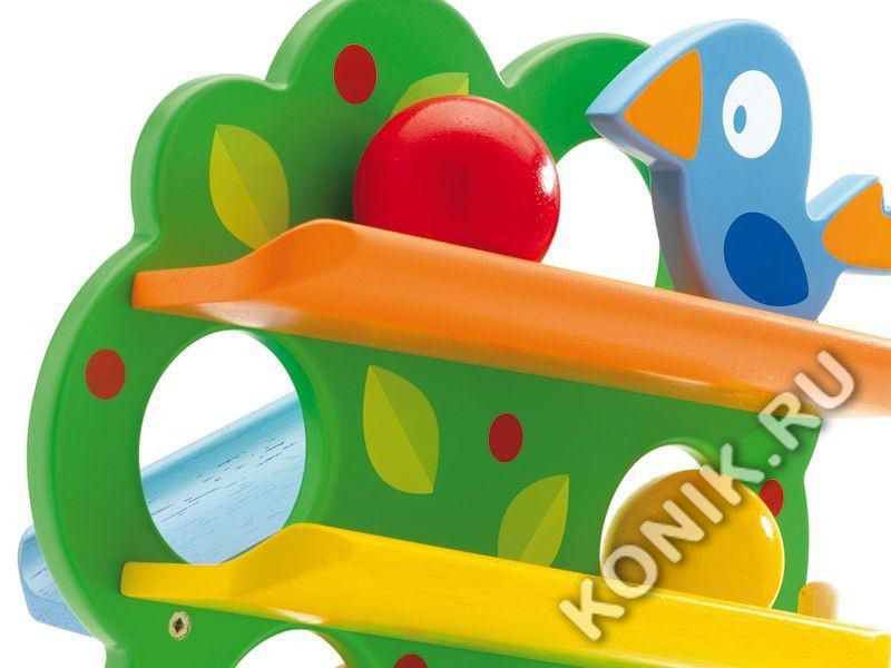 Горка из шариков в форме дерева. Дети кладут шарики на верхушку горки и подталкивают птичку, чтобы она начала движение. Шарики скользят по разноцветным веткам. Они катятся, падают, исчезают с одной стороны и как по волшебству появляются с другой! Дорожка заканчивается у подножия дерева и обрывается у цветка.