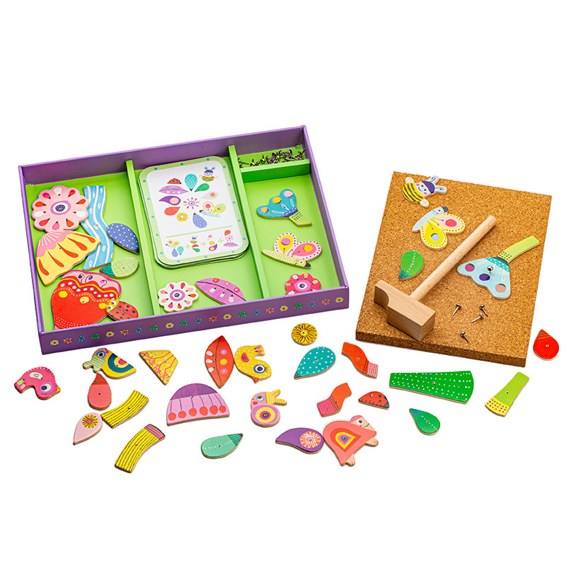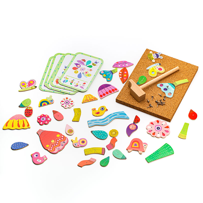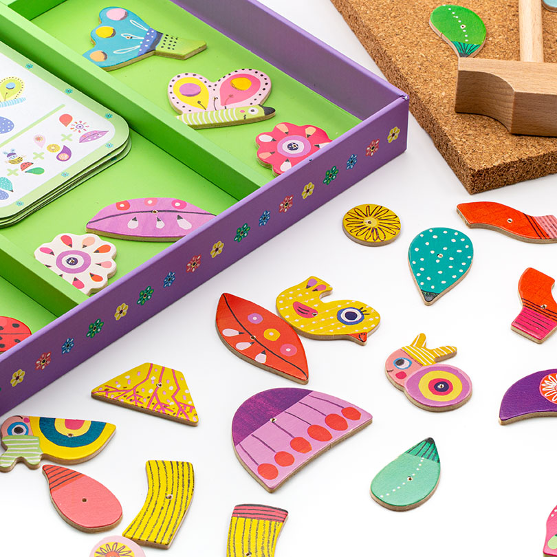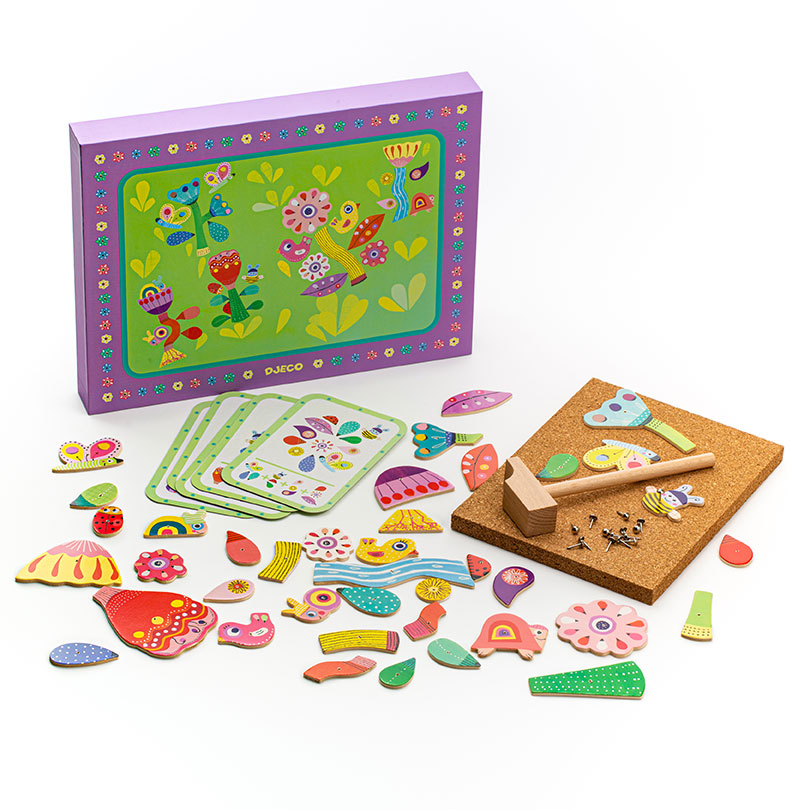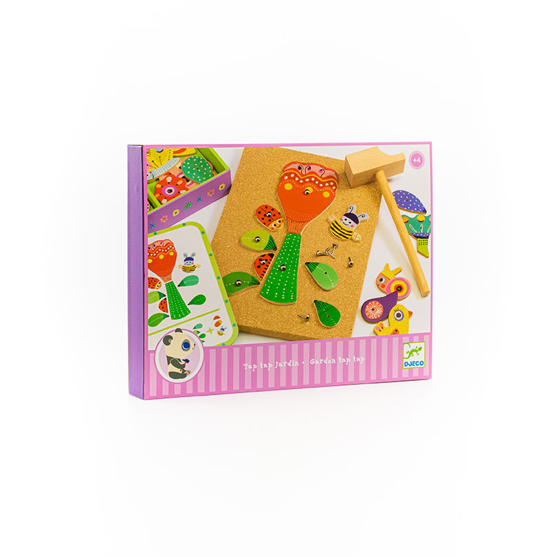 Tap tap Jardin - это классическое занятие для детей, обновленное компанией Djeco для развития ловкости малышей. Дети могут создавать свои собственные цветы и сады, прикрепляя детали к пробковой доске с помощью молотка и гвоздей. Они могут либо воссоздать предложенный дизайн, либо использовать свое воображение для создания прекрасного сада! Все это поставляется в красивой деревянной коробке!