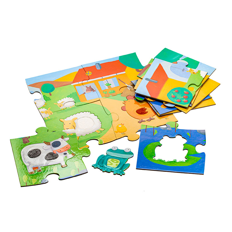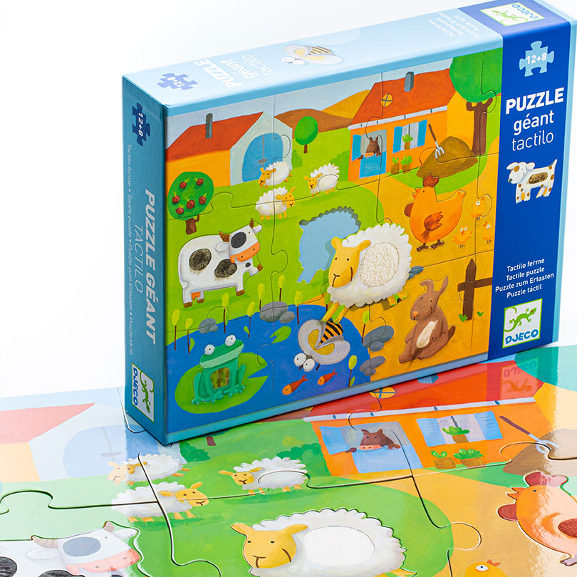 Тактильный пазл-гигант «Ферма» от французского производителя Djeco (Джеко) может стать самой первой и самой любимой головоломкой Вашего малыша. В раннем возрасте особо важны тактильные ощущения, которые играют особую роль в познании мира, опережая другие способы восприятия. Ребёнок сможет собрать целую картину с изображением большой фермы с забавными животными.