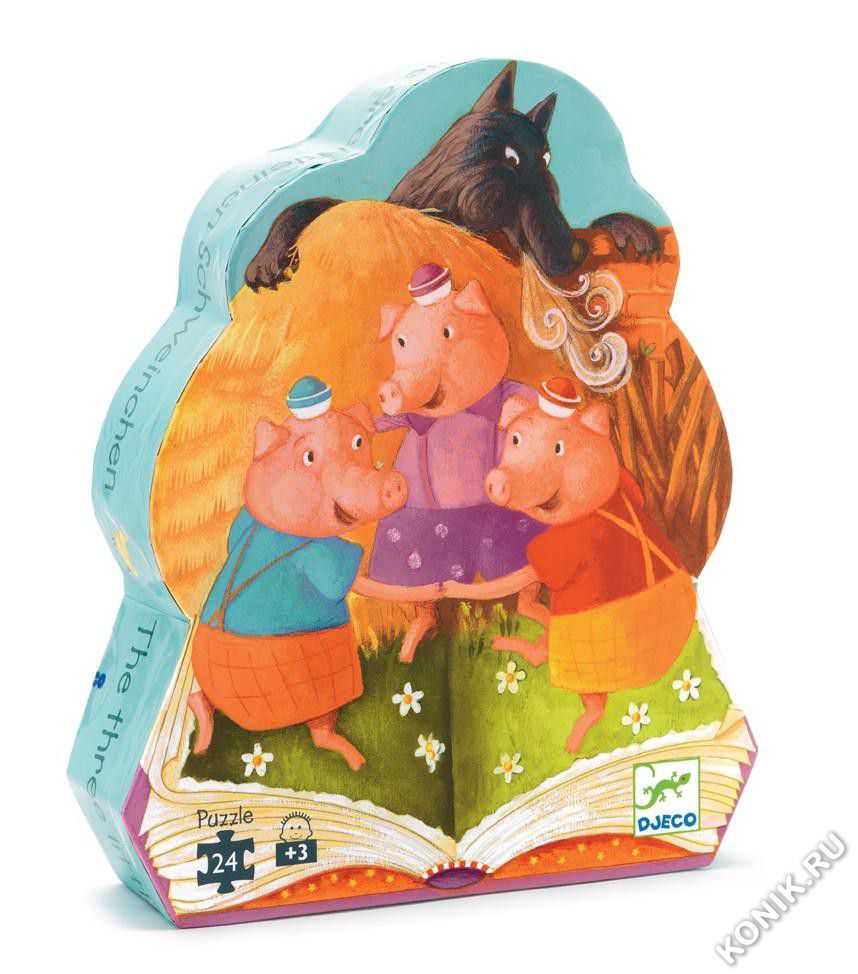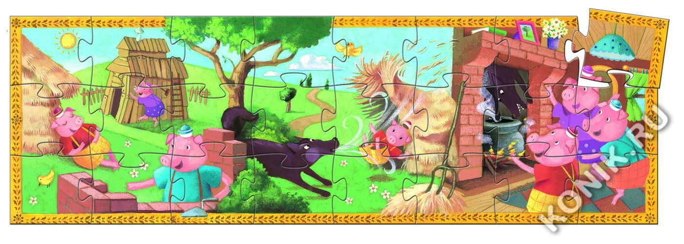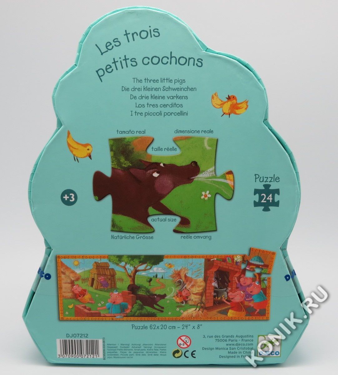 Детская головоломка «Три поросенка» — замечательный пазл в красочной фигурной коробке, который не оставит равнодушным ребёнка, увлекающегося сказками. Он сможет самостоятельно собрать всех героев сказки: трех поросят с их домиками и серого волка, а готовой картинкой можно украсить стены детской комнаты.