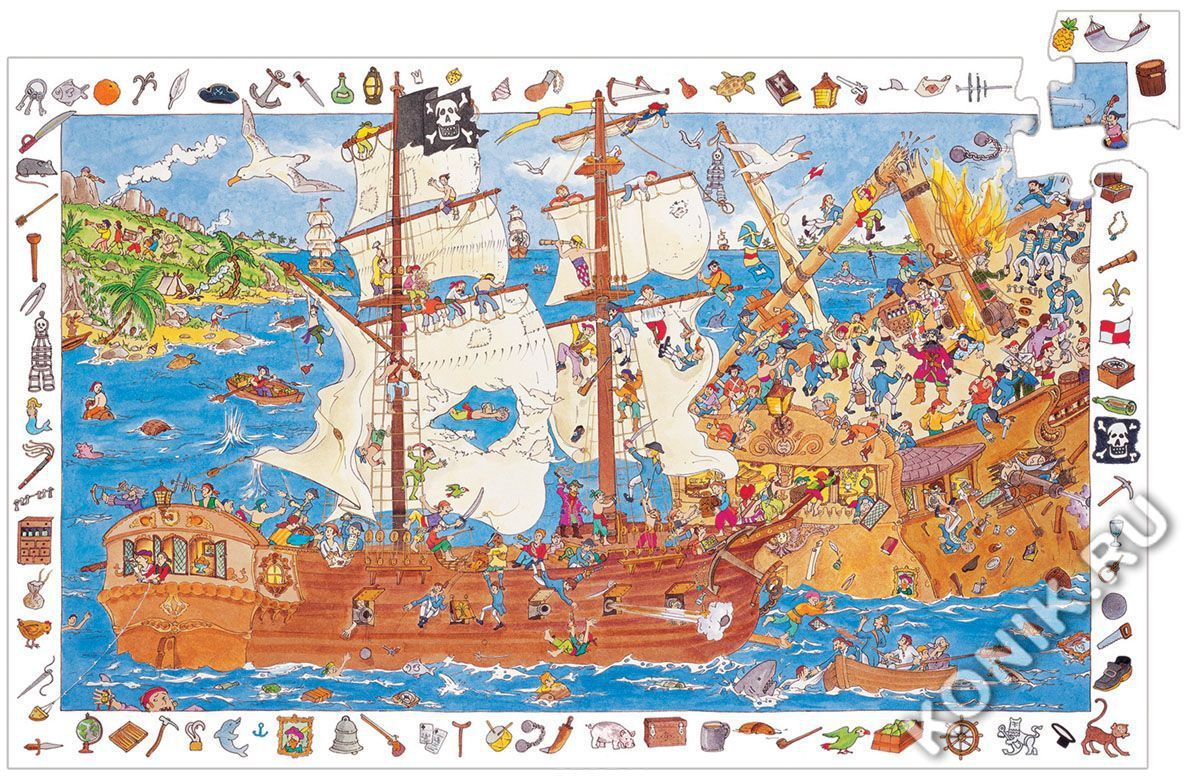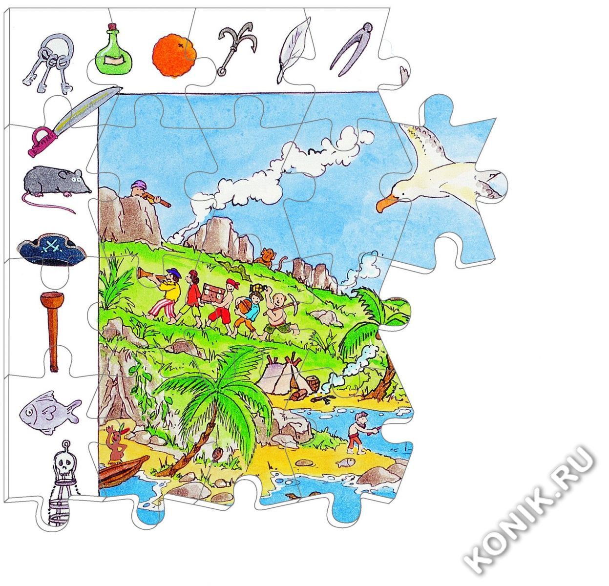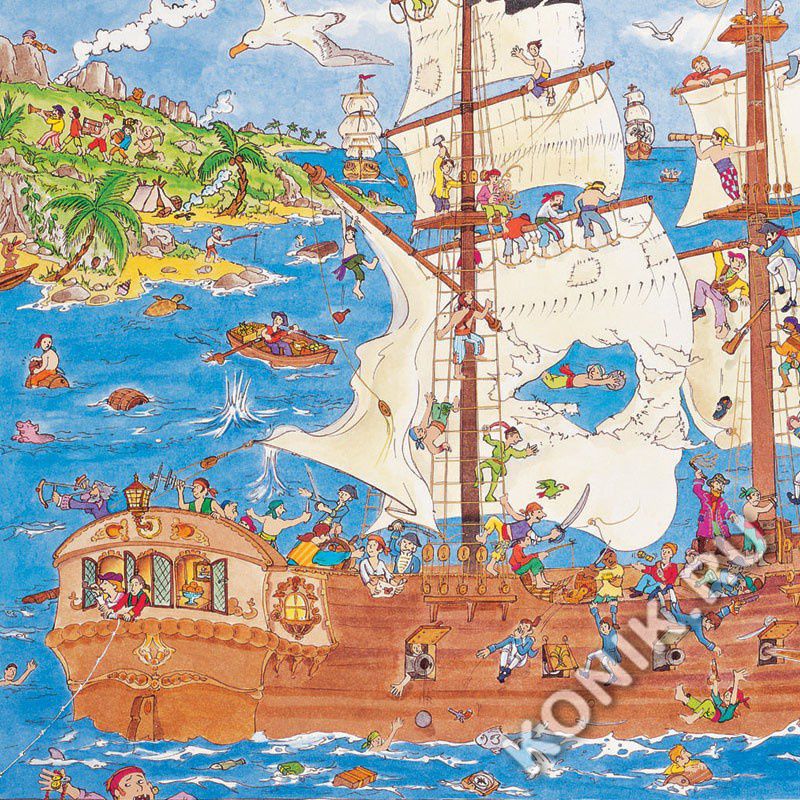 Вам предстоит собрать целую картину с изображением пиратских сюжетов. При этом ваш малыш сможет расширить свой кругозор, запомнить новые слова, повторить счет, а главное - развить наблюдательность и внимательность. После того, как пазл будет собран, вашему ребенку предстоит найти все детали, изображенные на полях пазла.