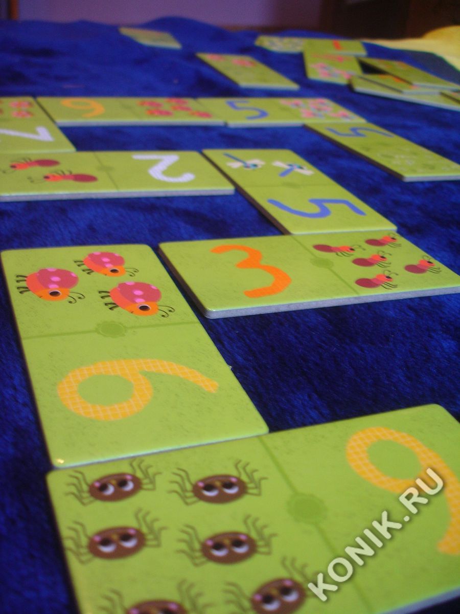 С одной стороны фишки нарисована цифра, с другой - картинка с изображением определенного числа животных. Дети по очереди подставляют фишки домино так, чтобы каждая последующая начиналась с того числа, на которое заканчивается предыдущая. Победителем становится первый, кто останется без фишек.