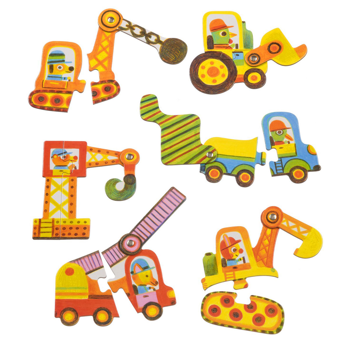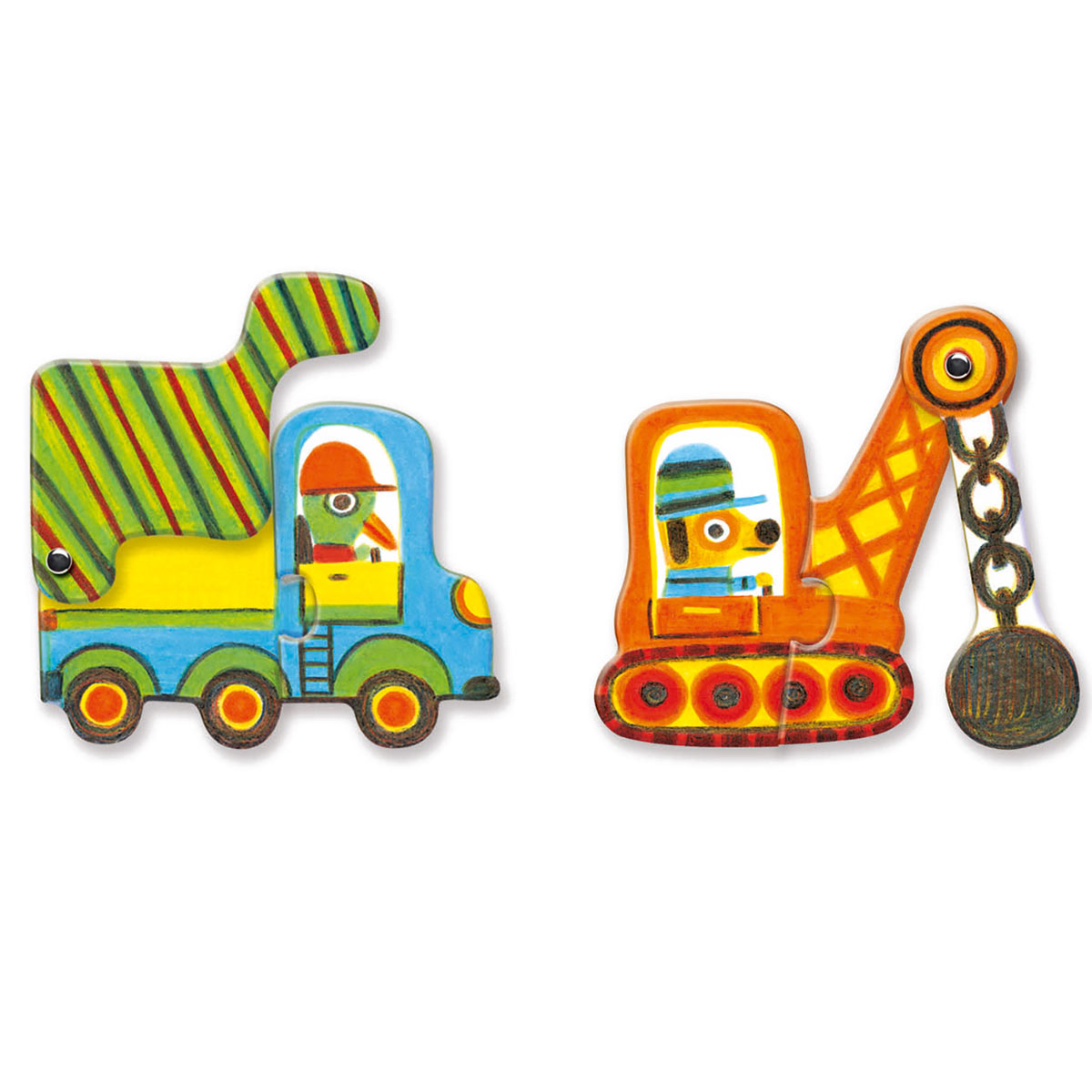 Пазл-дуо «Машинки» от французского производителя Djeco — первая развивающая игра для маленьких строителей и прекрасная головоломка. Главная задача — дополнить машинку или строительную технику необходимой деталью: самосвал — кузовом, бульдозер — ковшом. Какая именно часть подойдет, малыш должен догадаться самостоятельно.