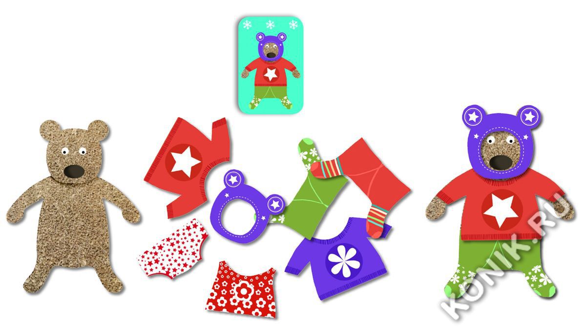 Ведущий вытягивает карту с изображением мишки, подробно описывает погоду и одежду, в которую он одет. Остальные игроки должны как можно быстрее одеть своего мишку. Тот, кто сделает это раньше всех и правильно, побеждает.