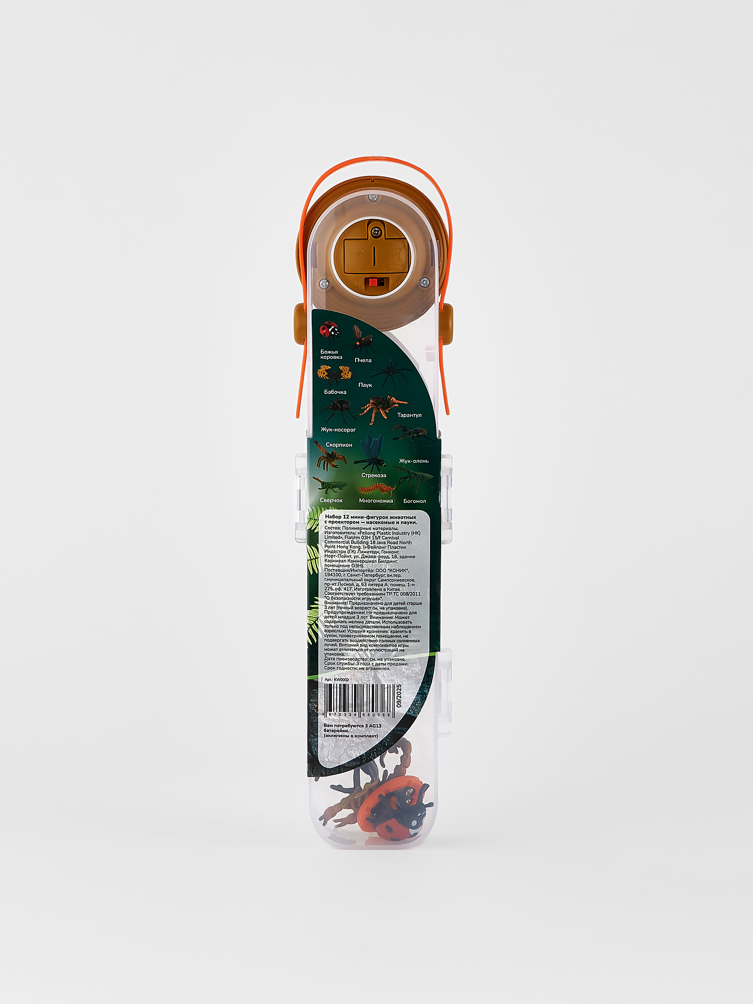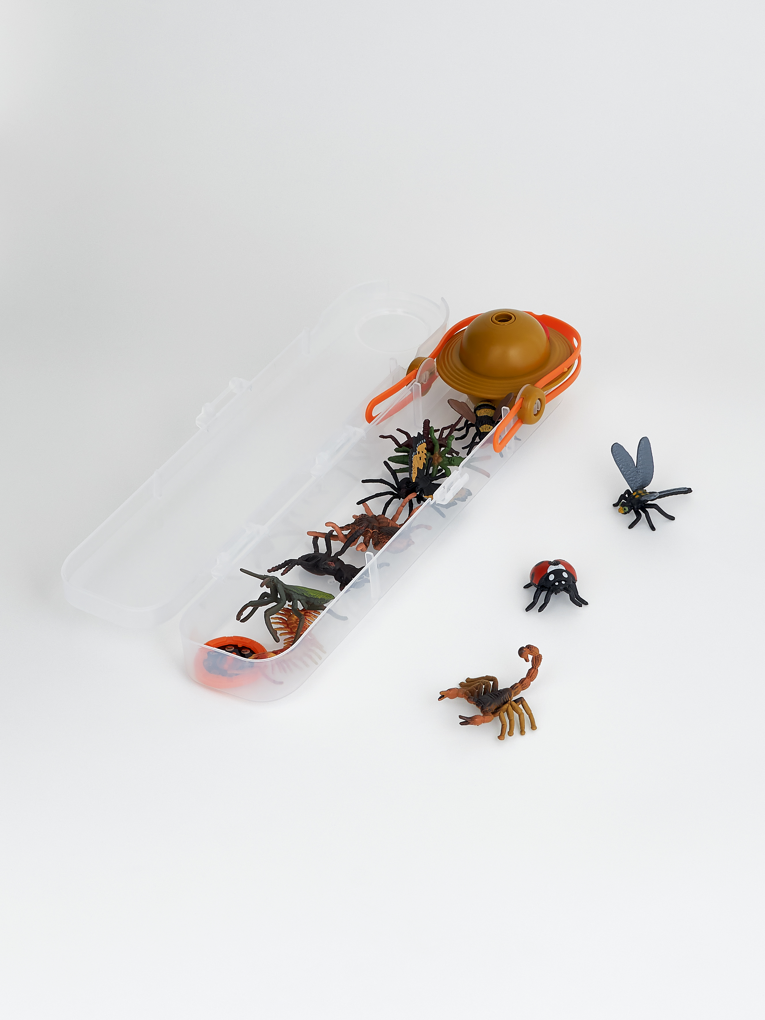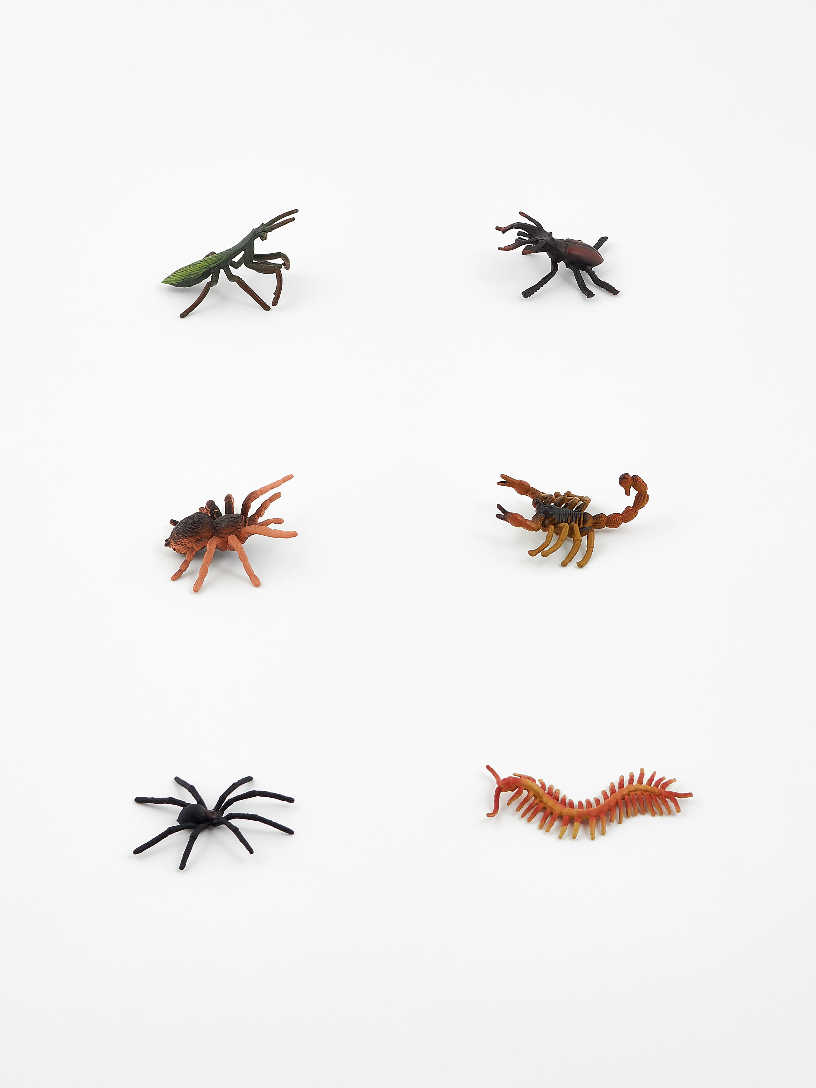 В комплект входят: богомол, жук-олень, тарантул, скорпион, паук, многоножка, сверчок, стрекоза, бабочка, пчела, божья коровка, жук-носорог.