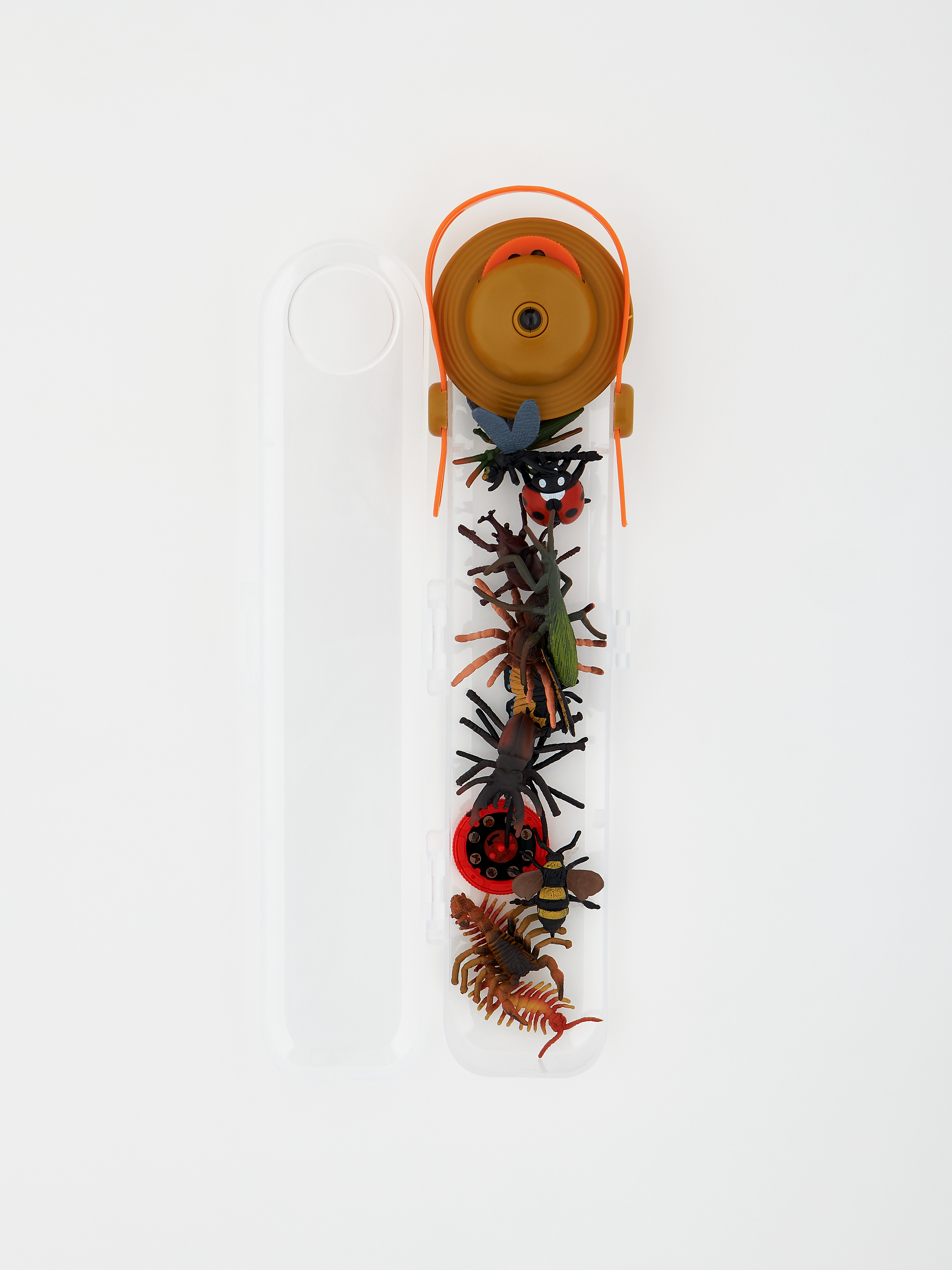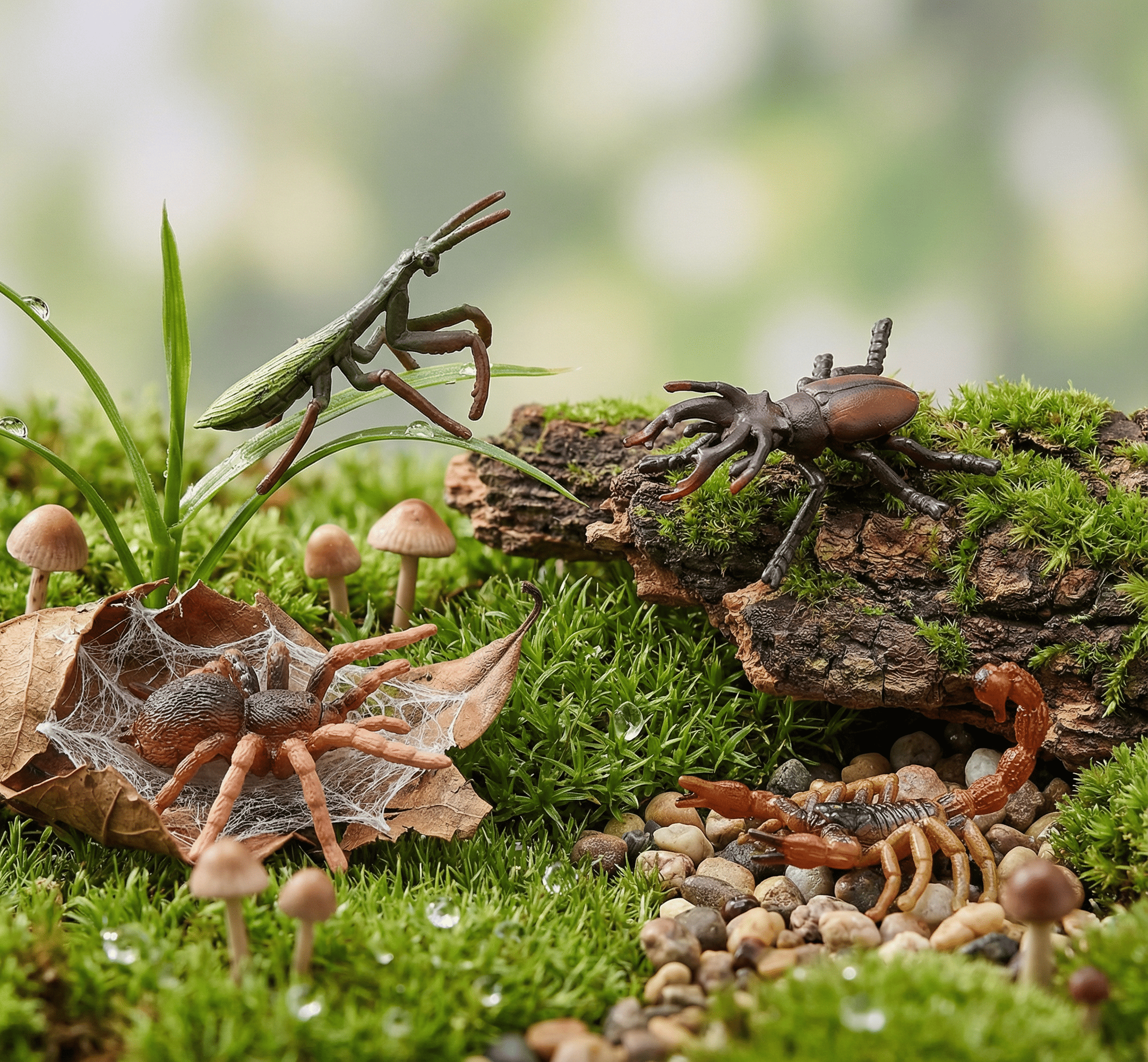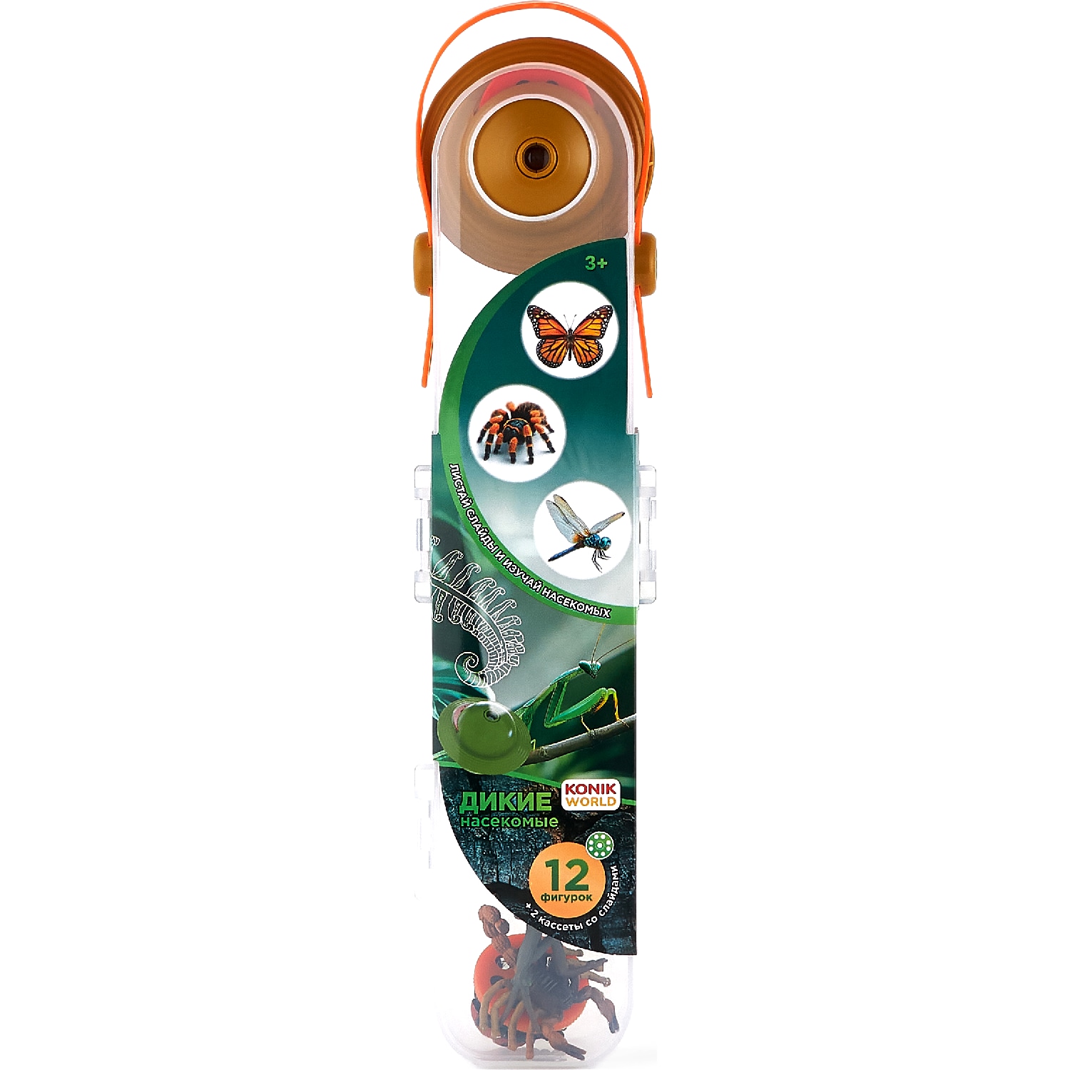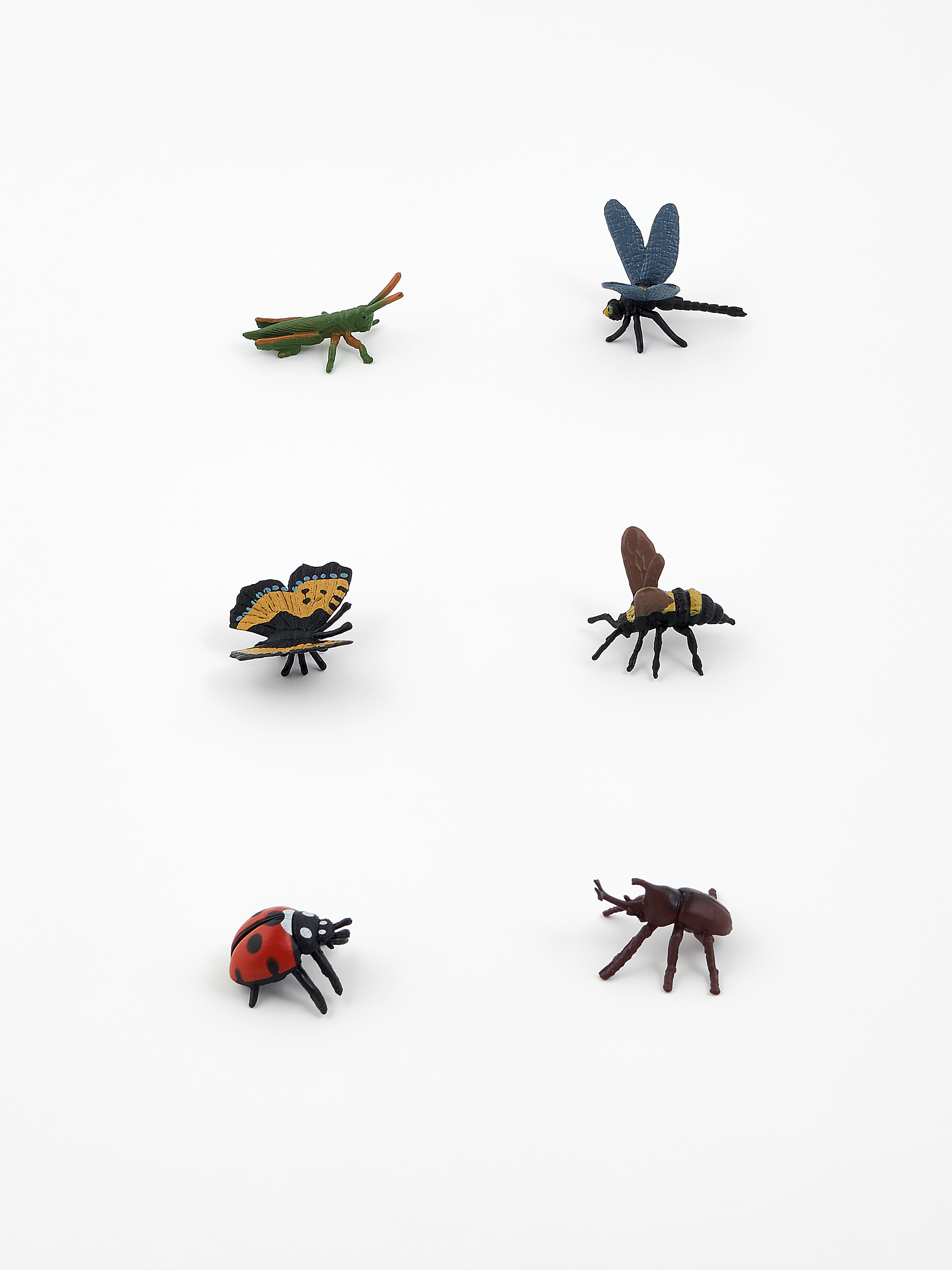 В комплект входят: богомол, жук-олень, тарантул, скорпион, паук, многоножка, сверчок, стрекоза, бабочка, пчела, божья коровка, жук-носорог.