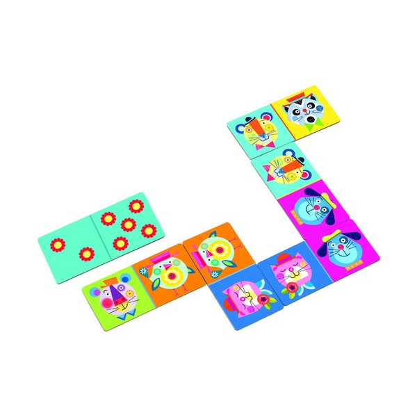 Каждая доминошка адаптирована для юных игроков, а потому вместо черно-белых точек на них «красуются» симпатичные зверюшки (кошечки, собачки, еноты, птички и т.п.). Благодаря своей наглядности и красочности игра подходит для детей в возрасте трех лет и старше.