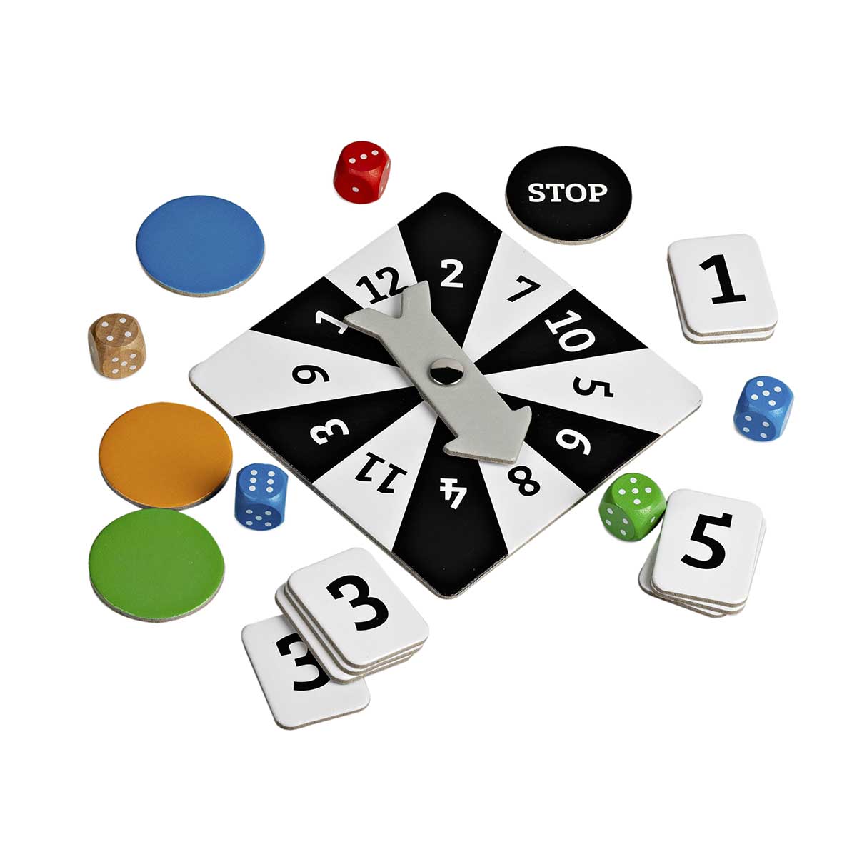 Игроки по очереди крутят спиннер и смотрят на число, на которое указала стрелка. Затем первый игрок бросает набор из 9 кубиков на игровое поле. Задача игроков - найти пару кубиков одного цвета, сумма или разница точек на которых совпадает с числом, указанным на спиннере. Важно сделать это быстрее остальных, чтобы получить больше очков.