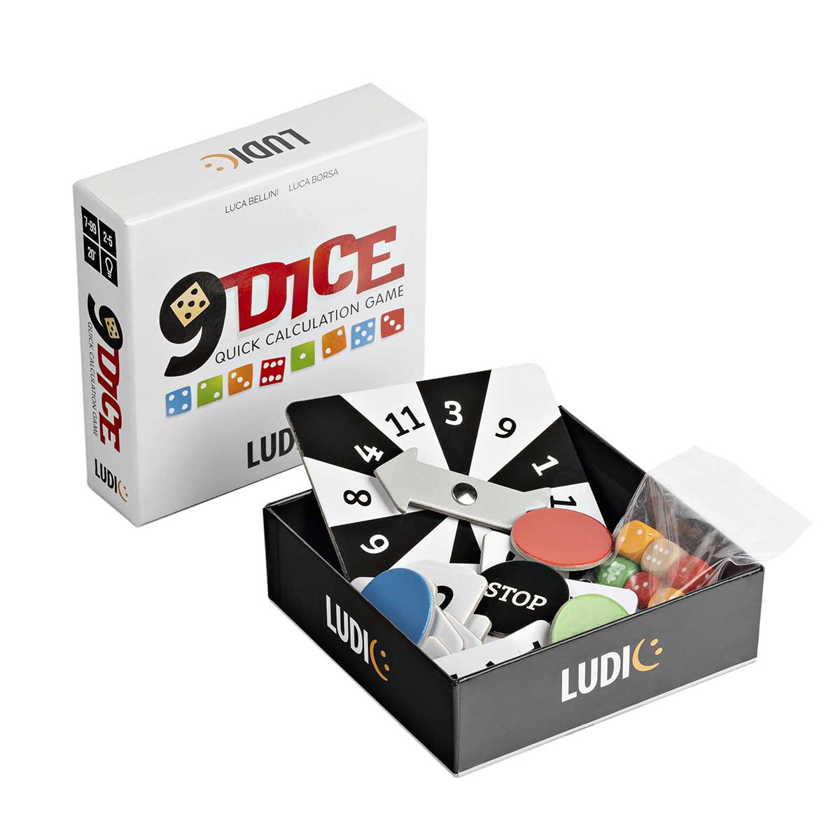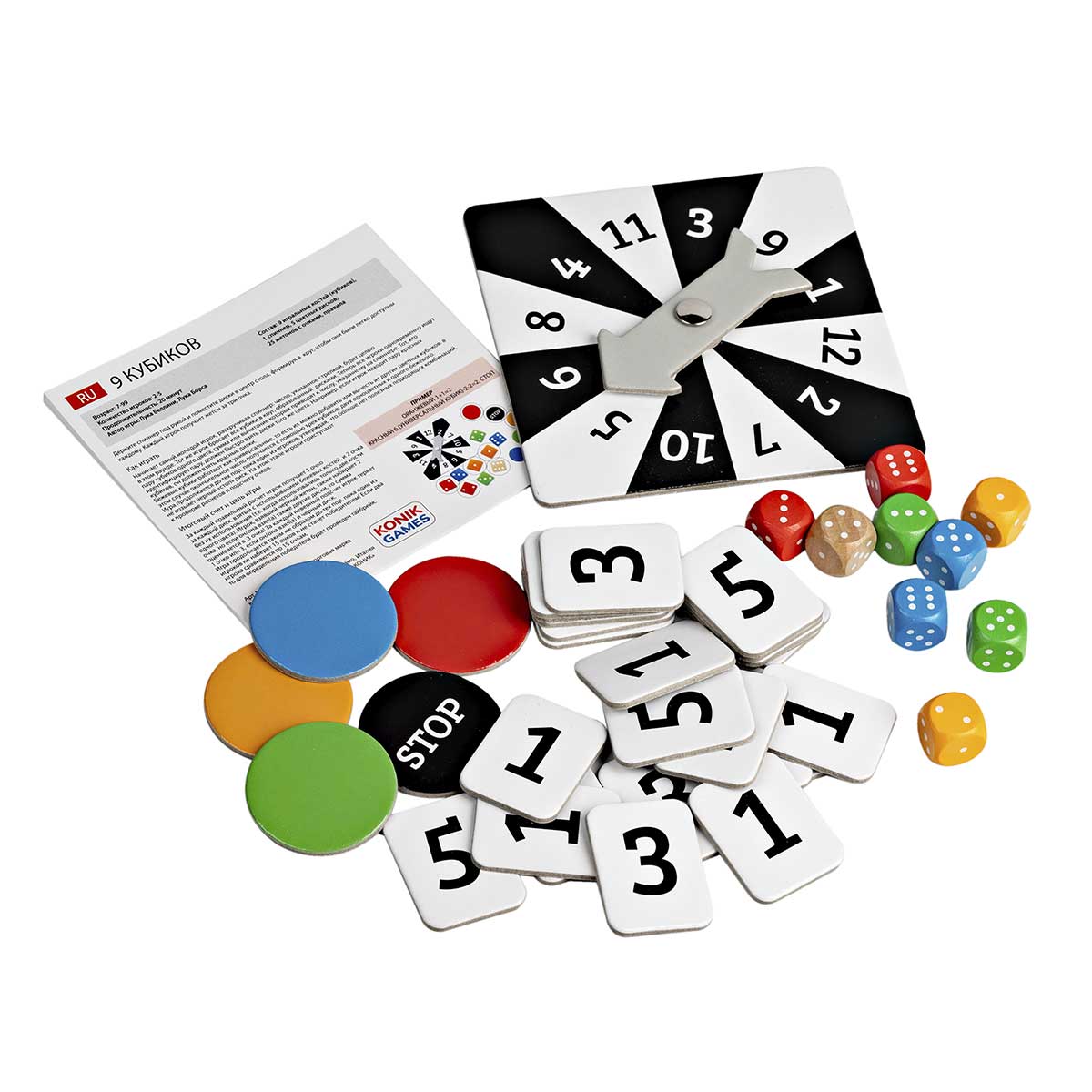 «9 Кубиков» – это увлекательная настольная игра, направленная на развитие навыков устного счета и внимательности. Игроки крутят спиннер и смотрят на число, на которое показала стрелка. После игрок, который ходит первым, бросает набор из 9 кубиков на игровое поле. Все игроки ищут пару кубиков одного цвета. Сумма или разница точек на кубиках должна совпадать с числом, на которое указал спиннер. Важно сделать это быстрее остальных.