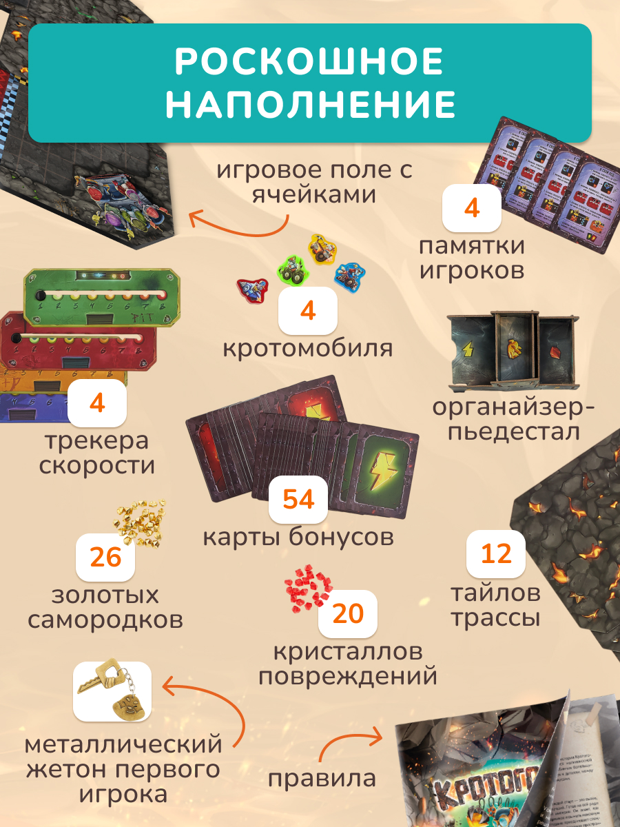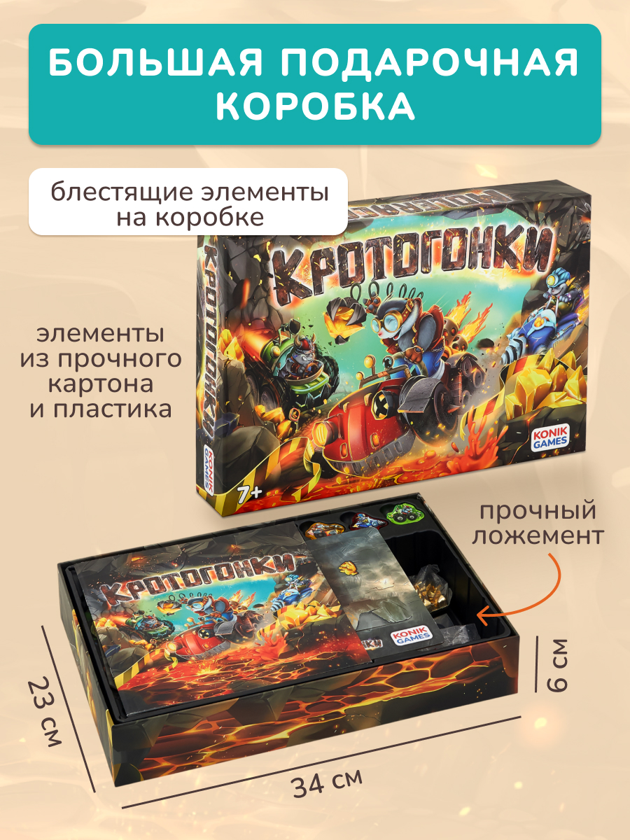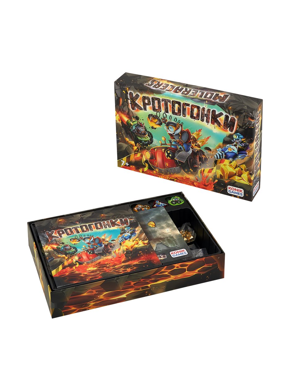 «Кротогонки» от Konik Games — это динамичная настольная игра в жанре гоночной стратегии. Управляйте забавными кротами-гонщиками на уникальных «кротомобилях», продумывайте ходы, избегайте столкновений и собирайте золотые самородки, чтобы стать чемпионом!
