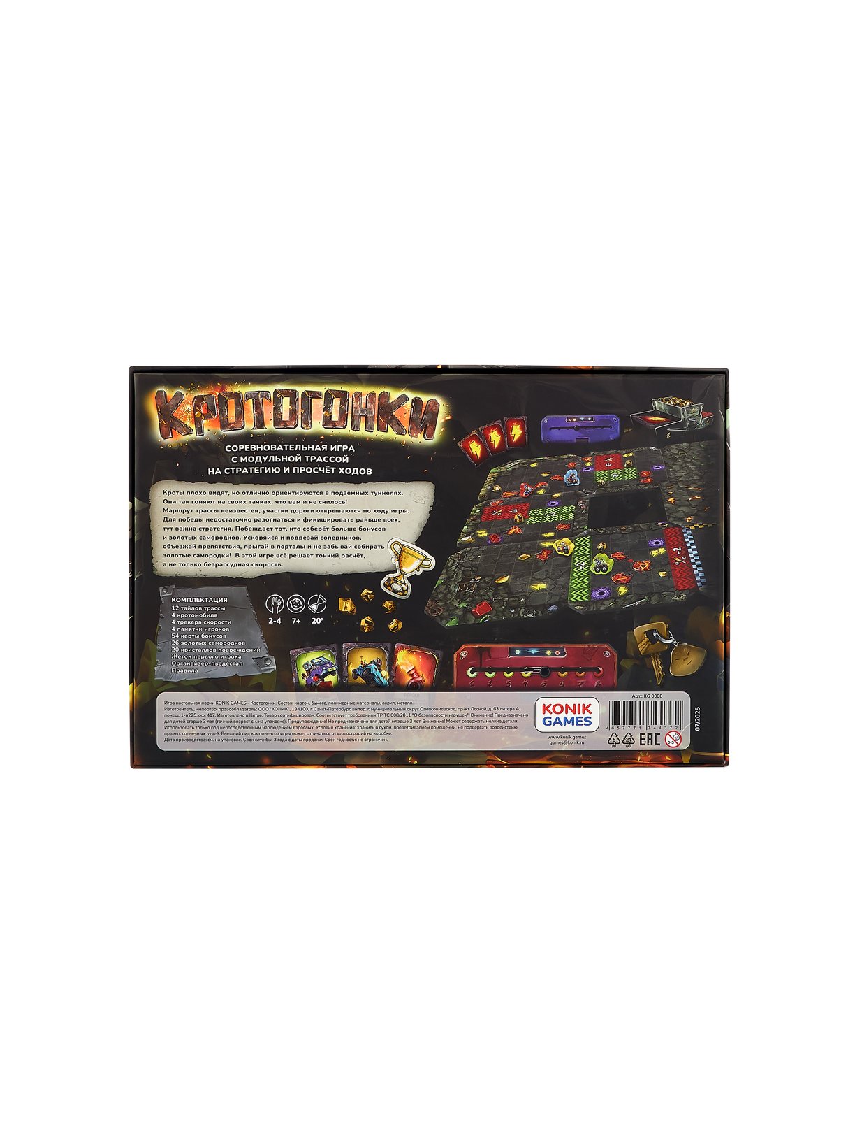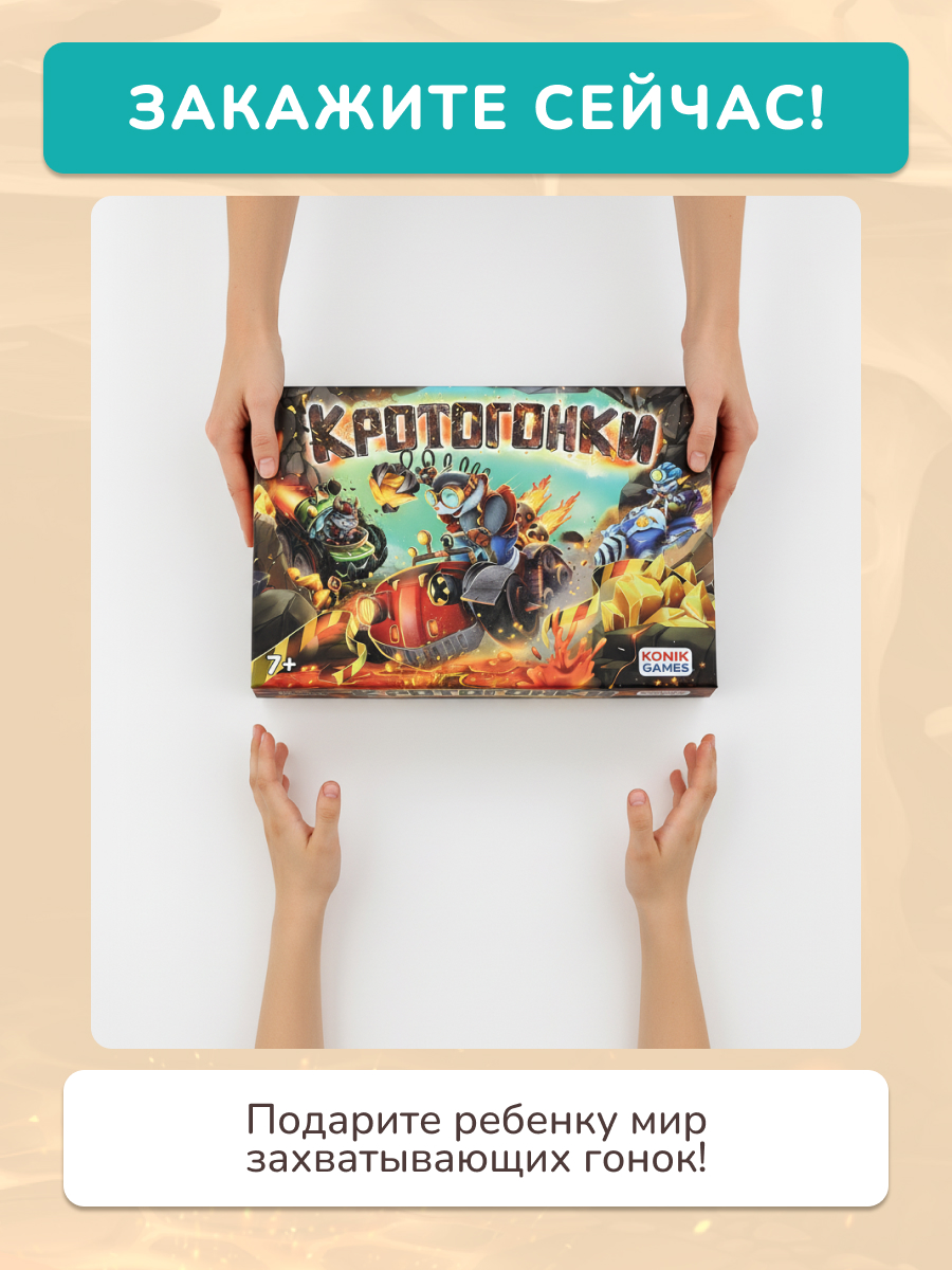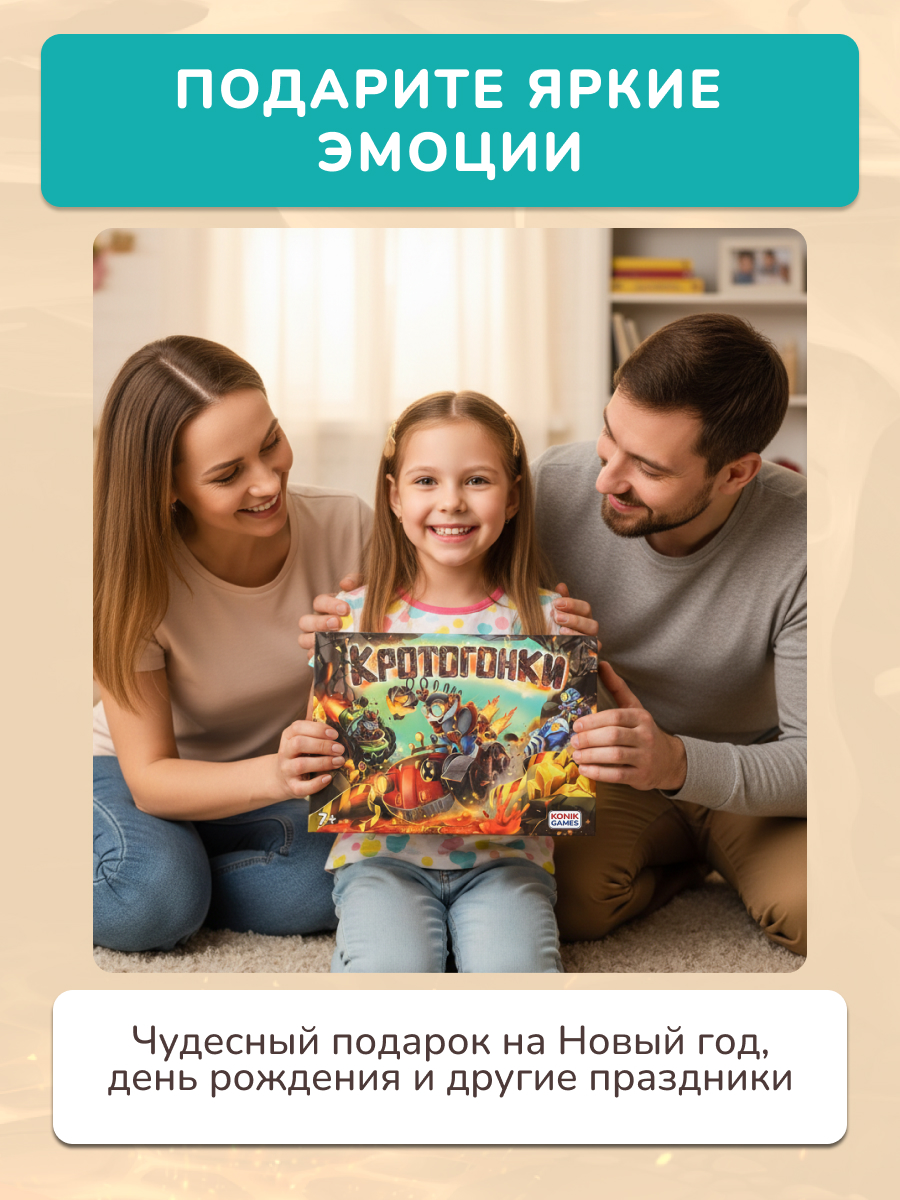 «Кротогонки» от Konik Games — это динамичная настольная игра в жанре гоночной стратегии. Управляйте забавными кротами-гонщиками на уникальных «кротомобилях», продумывайте ходы, избегайте столкновений и собирайте золотые самородки, чтобы стать чемпионом!