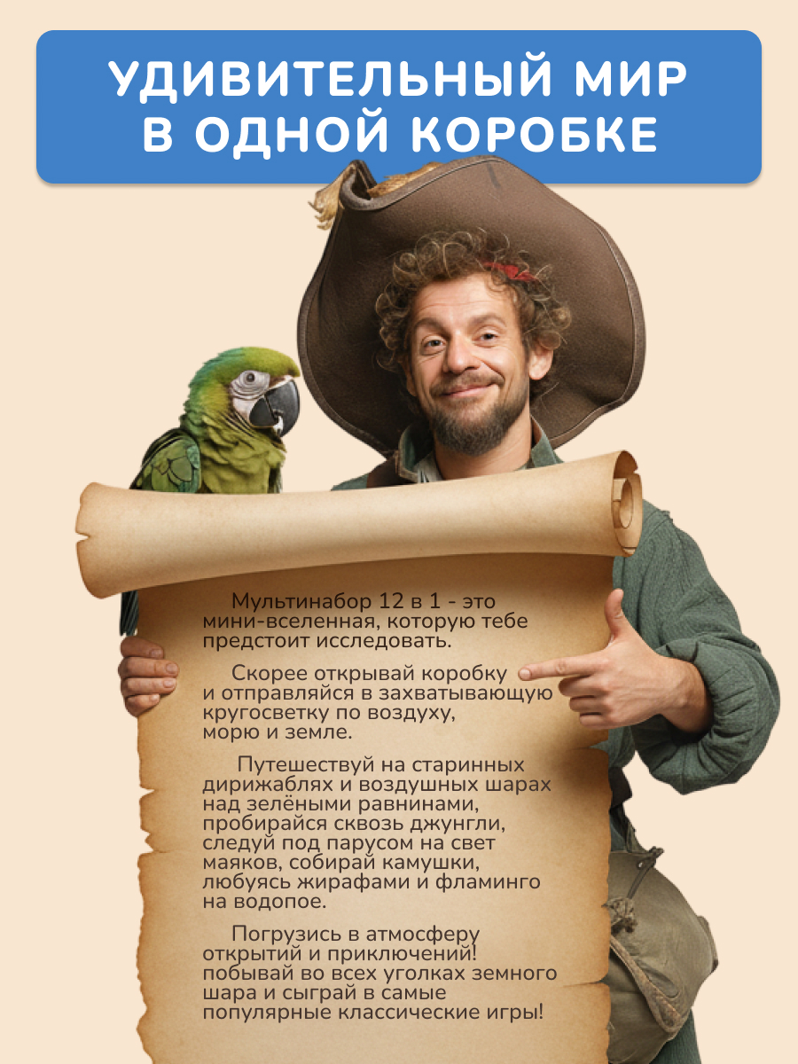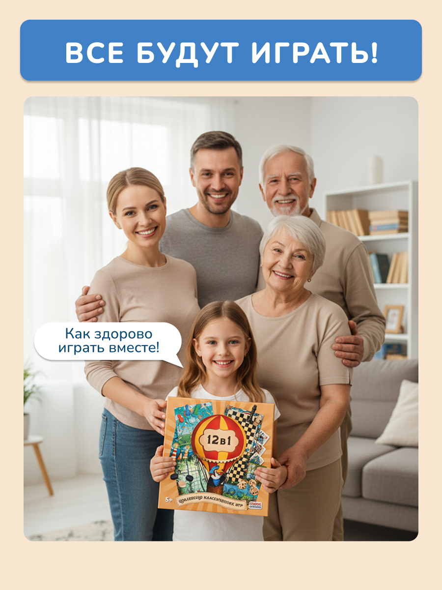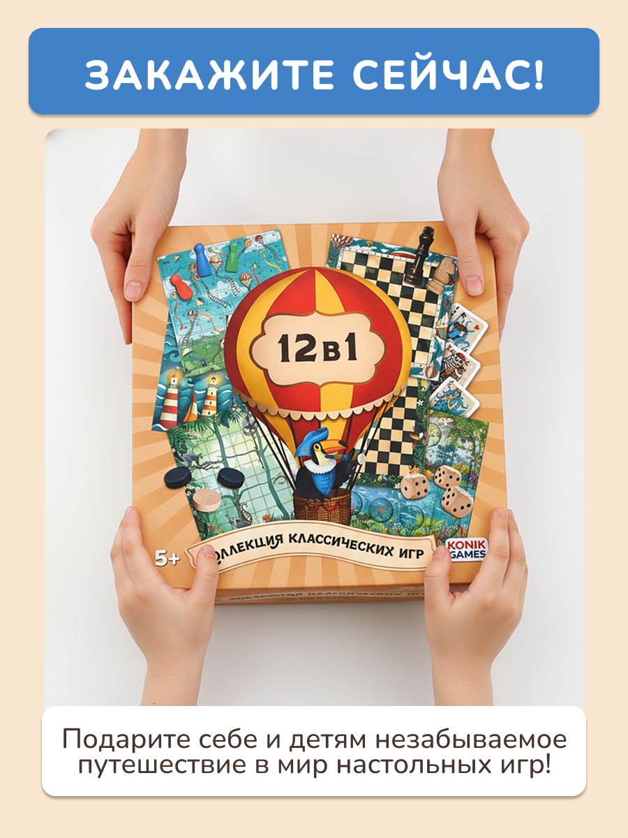 “Мультинабор 12 в 1” KONIK GAMES – коллекция лучших соревновательных классических настольных игр для семейного досуга.