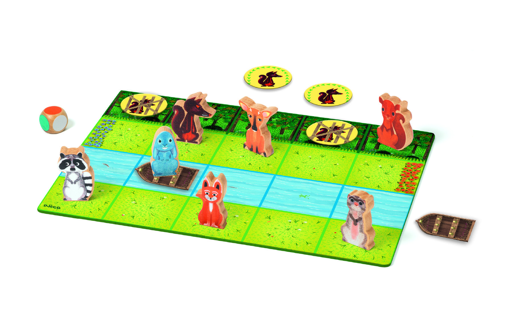 Клетка указывает на движение, которое нужно сделать, а защитные карты помогут детям противостоять волку. Как только все 6 животных достигли леса на другом берегу реки, они в целости и сохранности!
