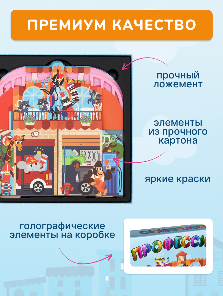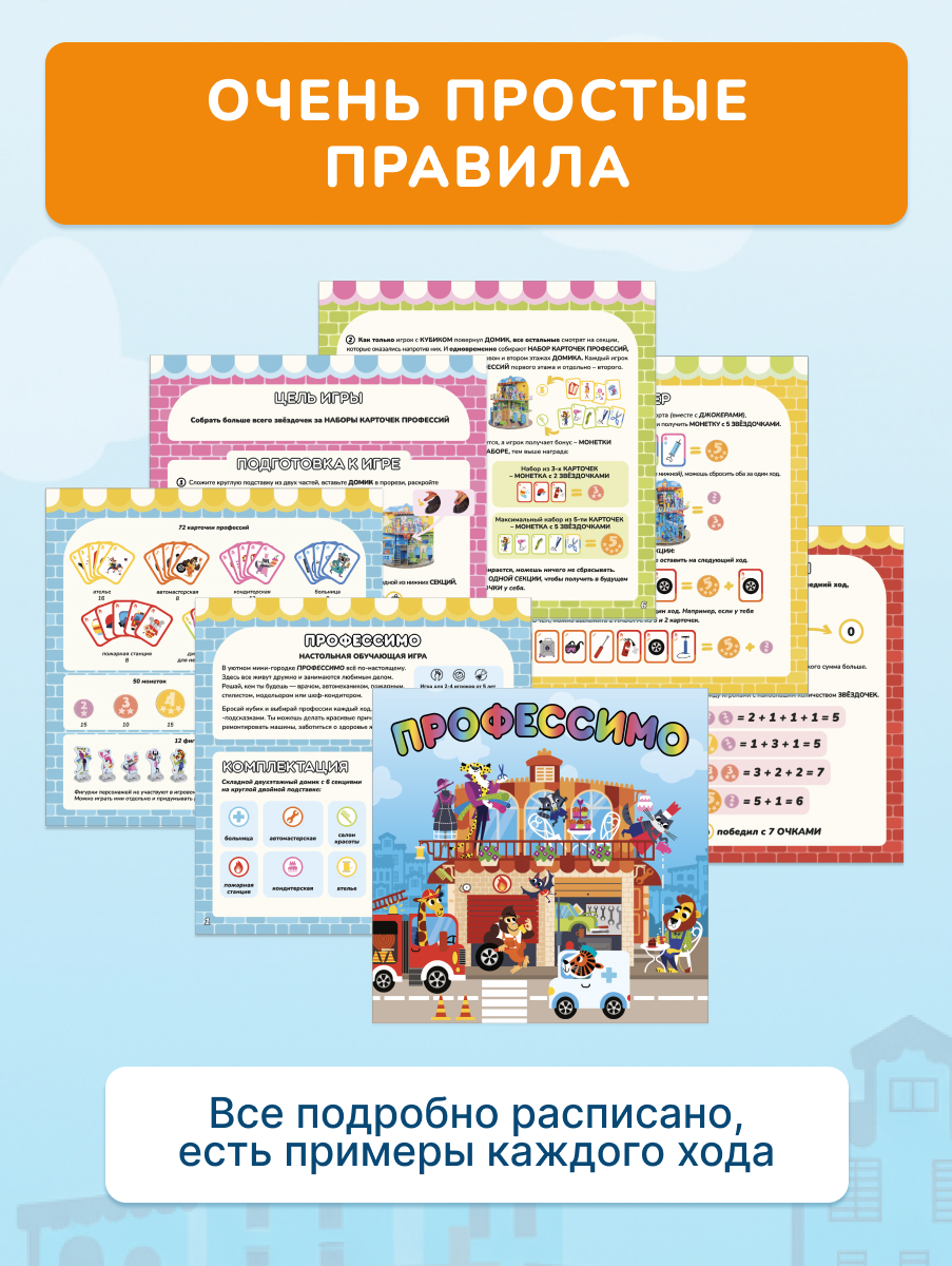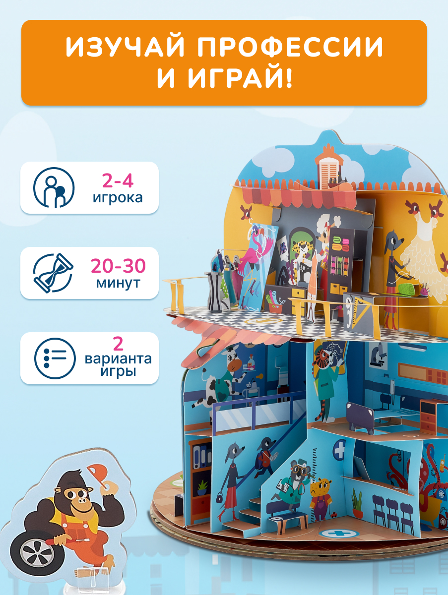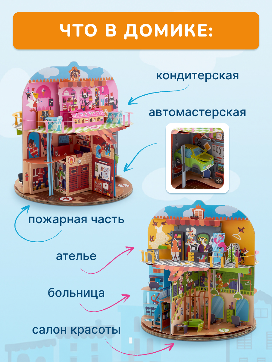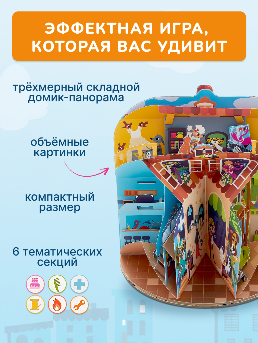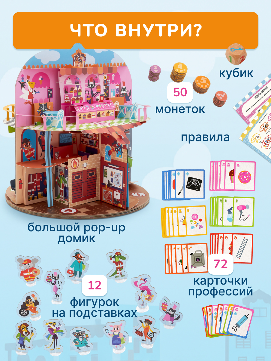 Большой pop-up домик с 6 секциями: кондитерская, салон красоты, больница, пожарная станция, ателье, автомастерская; 72 карточки профессий, кубик, 50 монеток, 12 фигурок на подставках, правила.