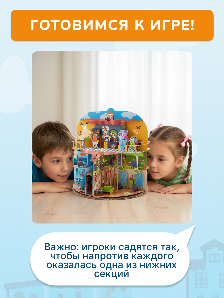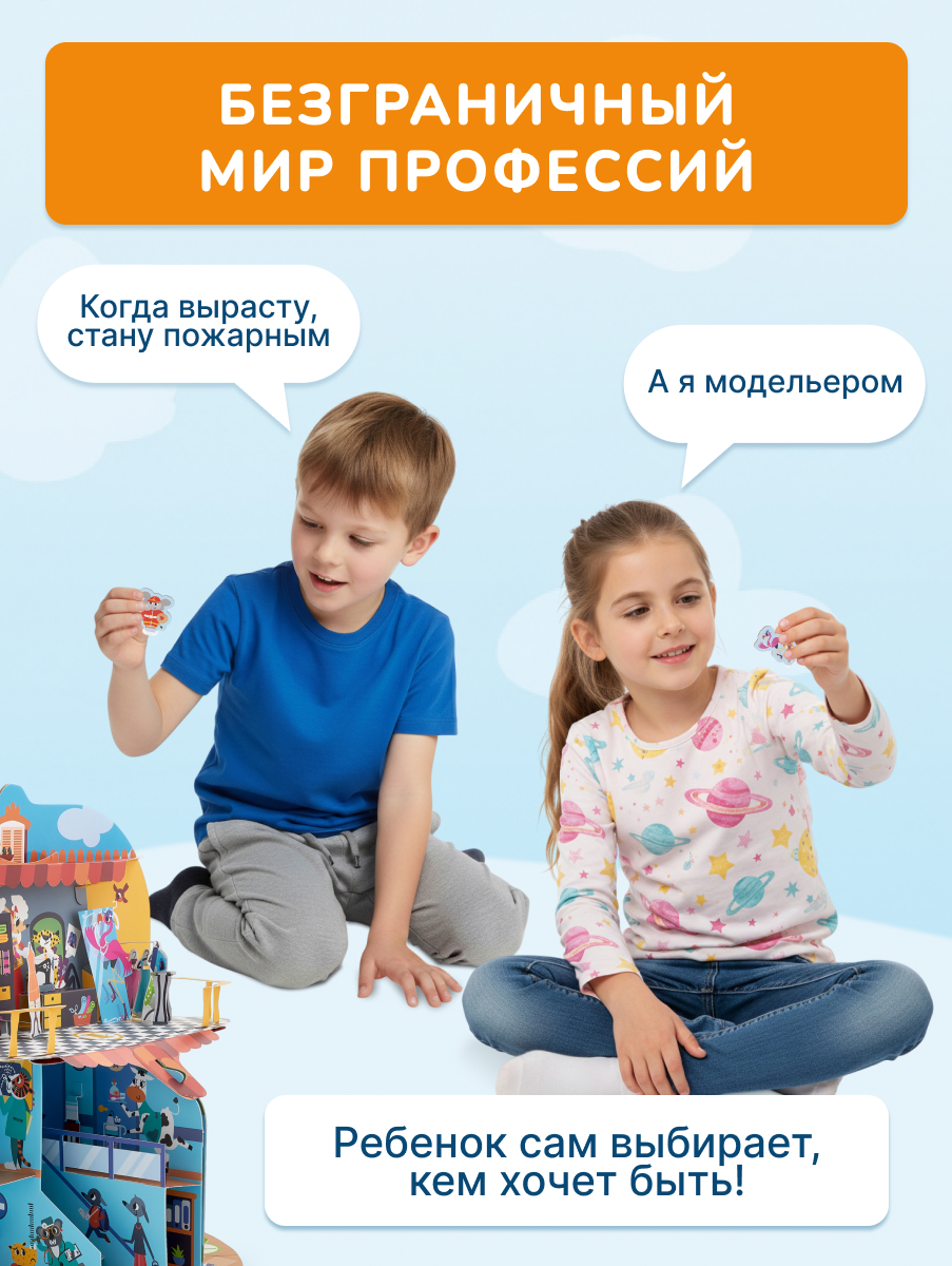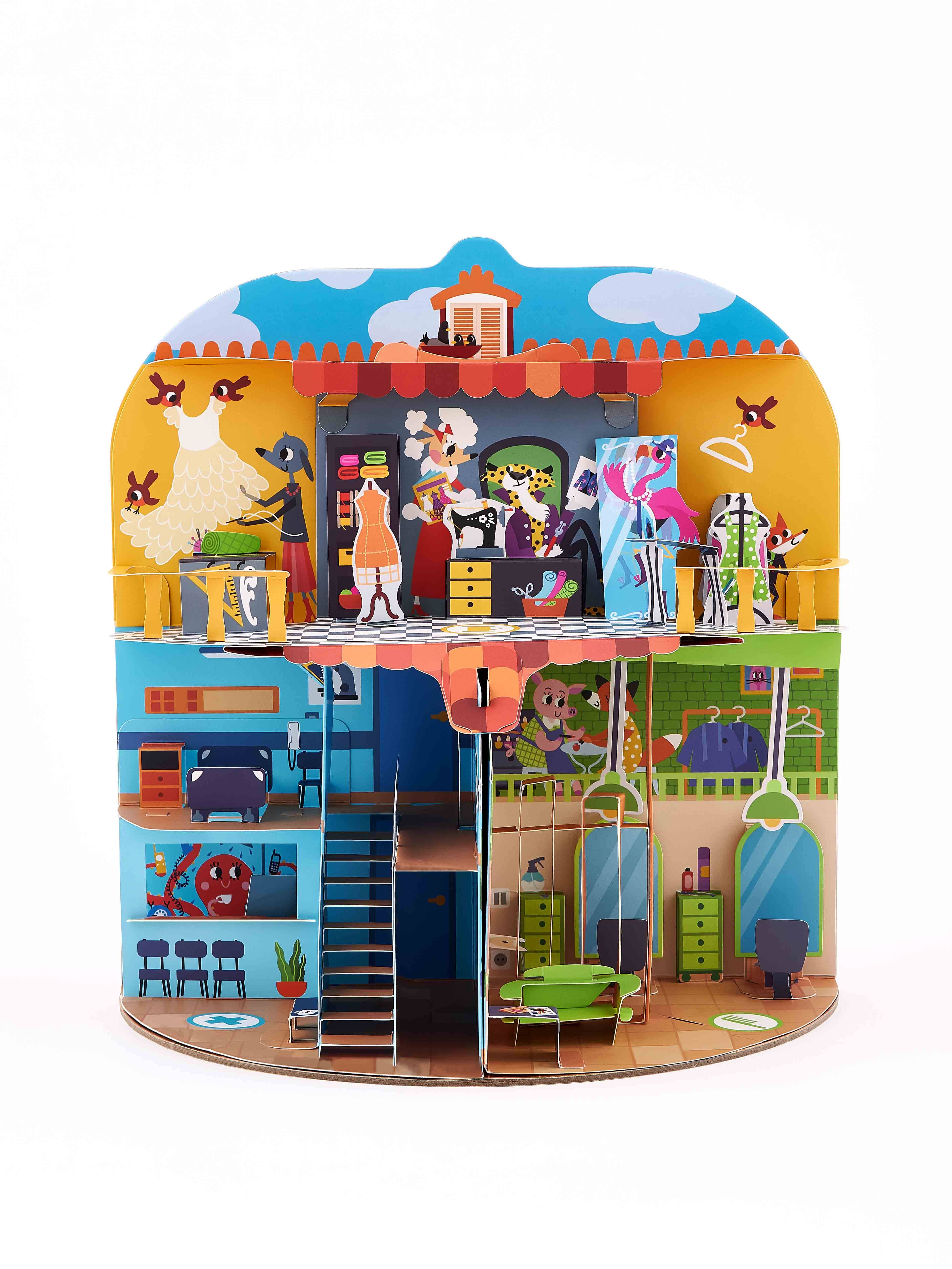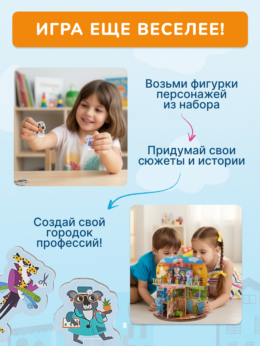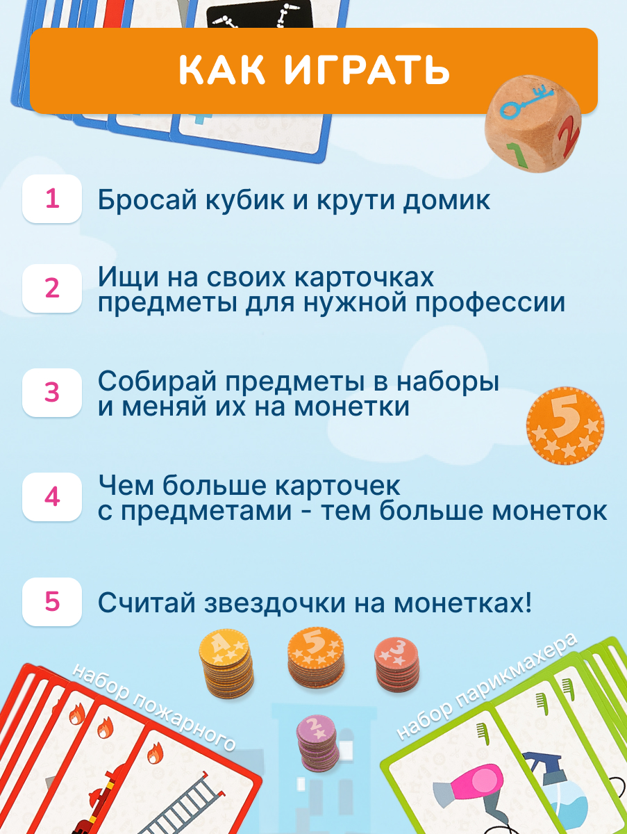 Большой pop-up домик с 6 секциями: кондитерская, салон красоты, больница, пожарная станция, ателье, автомастерская; 72 карточки профессий, кубик, 50 монеток, 12 фигурок на подставках, правила.