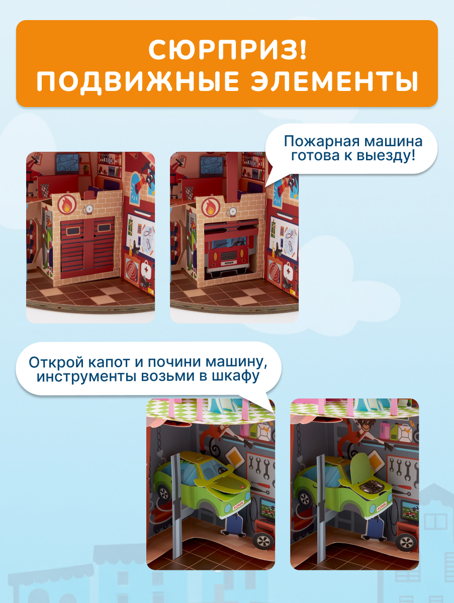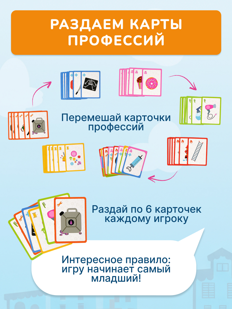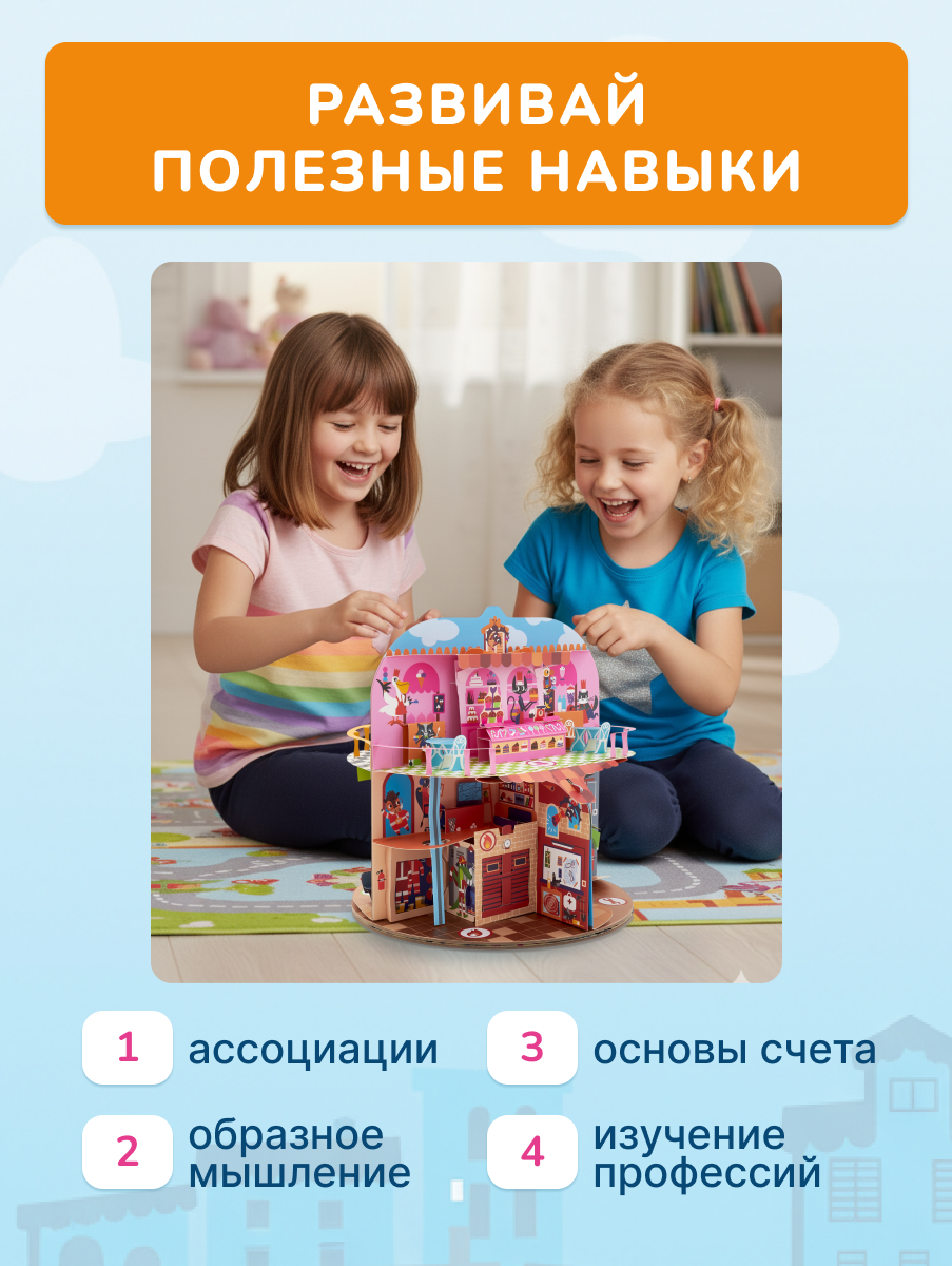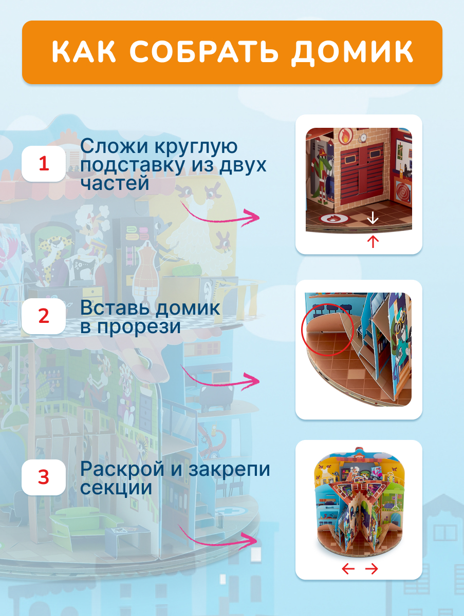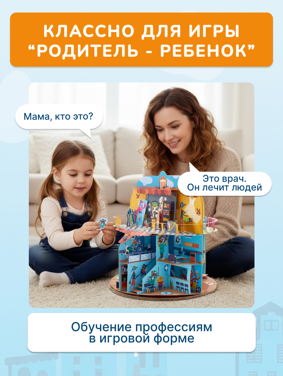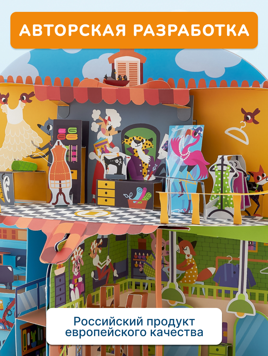 Большой pop-up домик с 6 секциями: кондитерская, салон красоты, больница, пожарная станция, ателье, автомастерская; 72 карточки профессий, кубик, 50 монеток, 12 фигурок на подставках, правила.