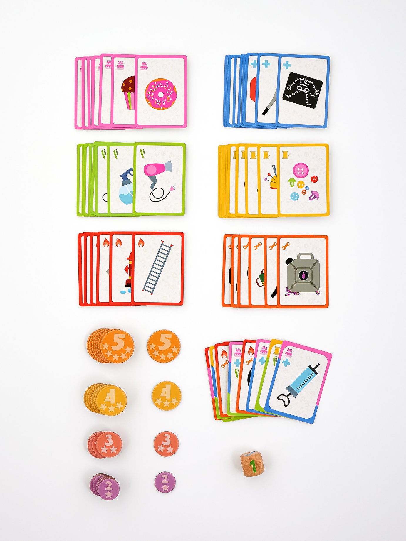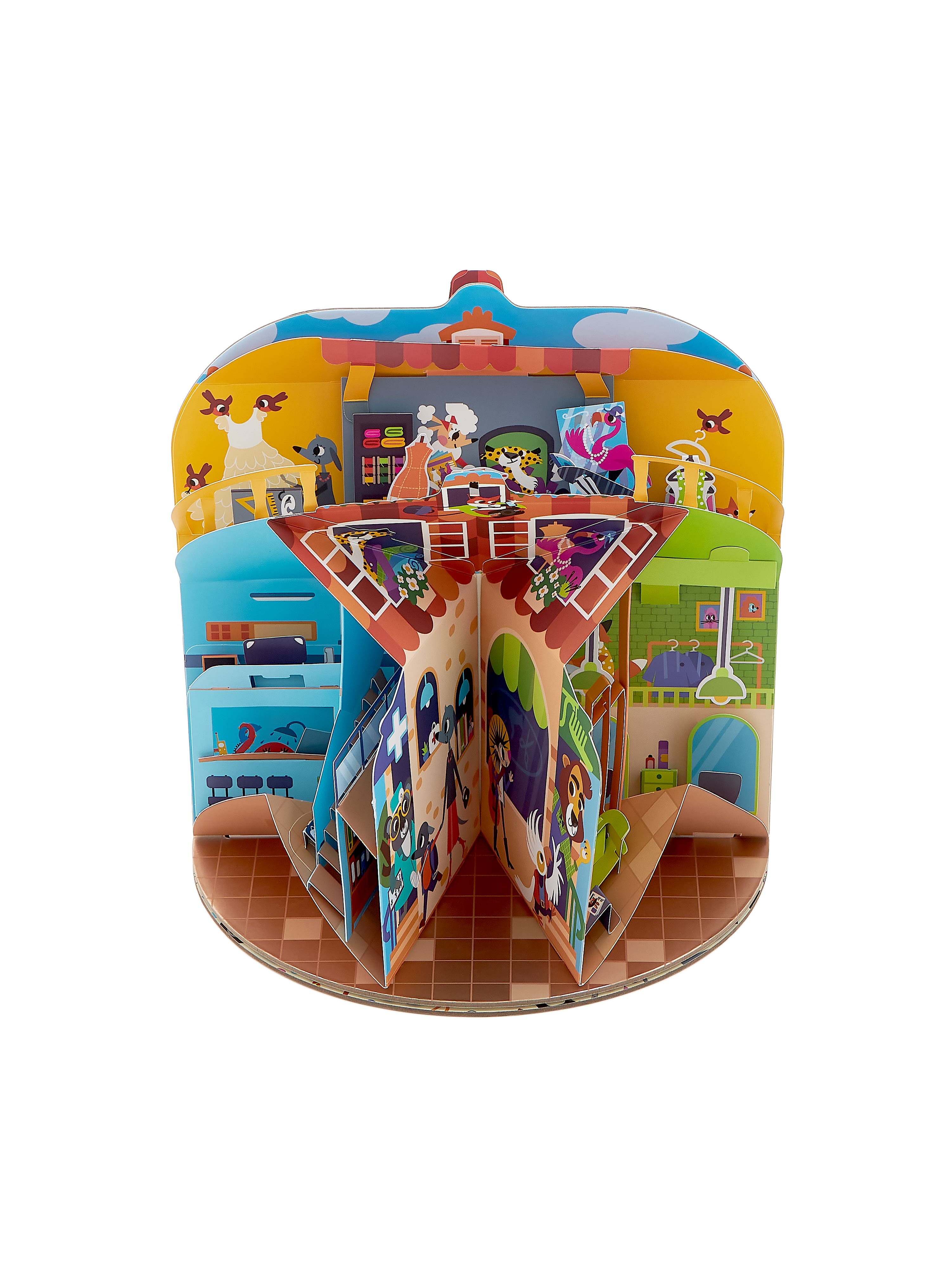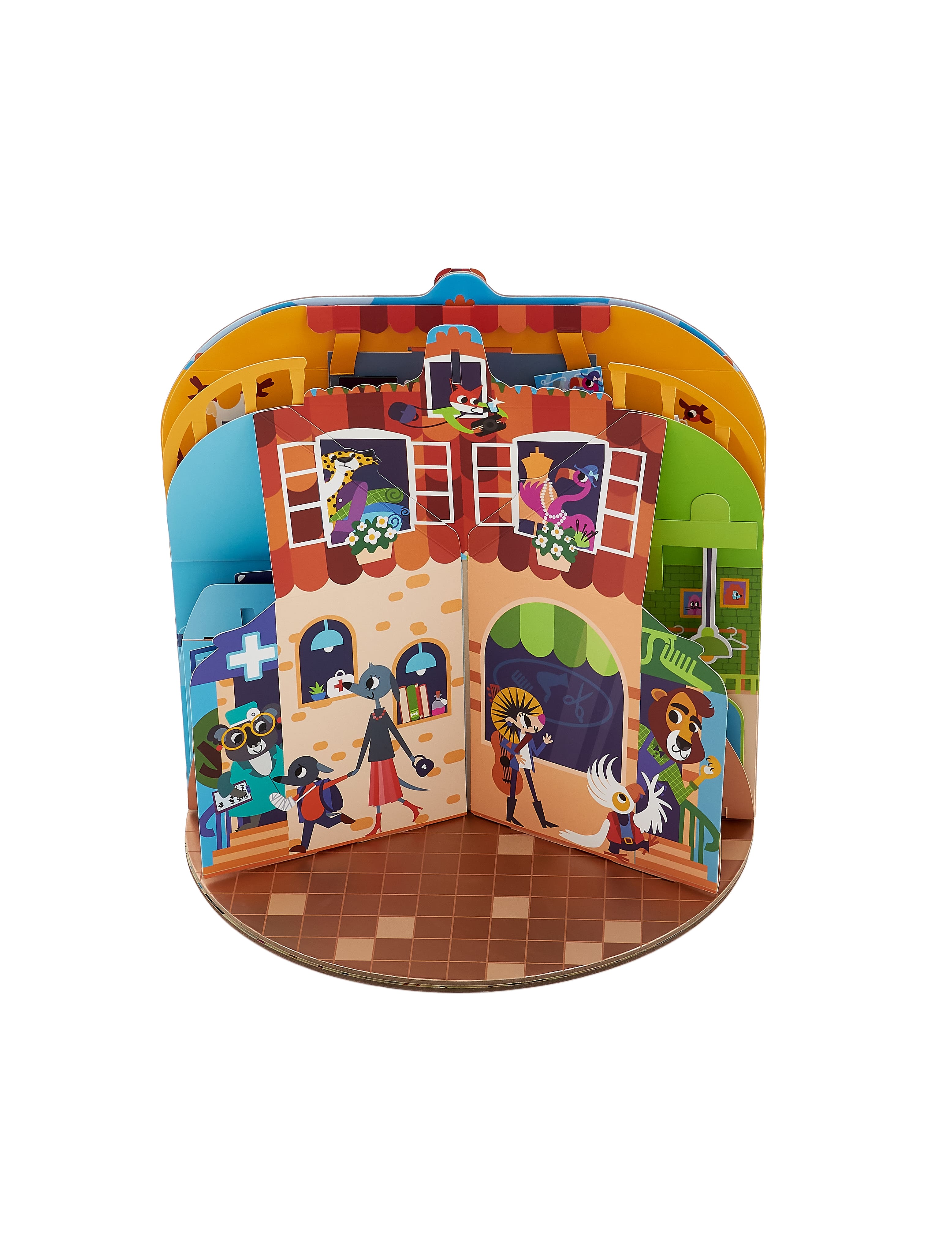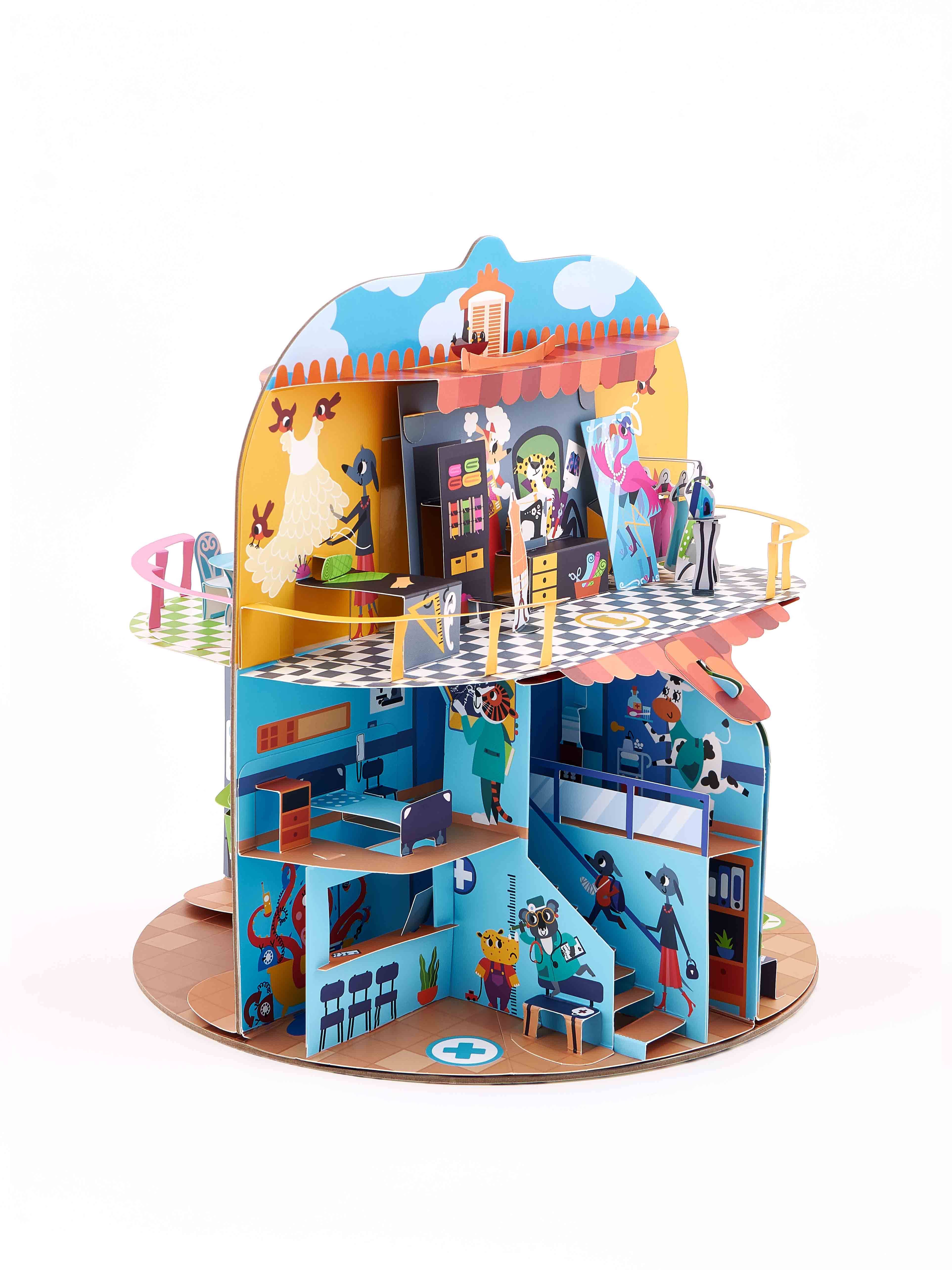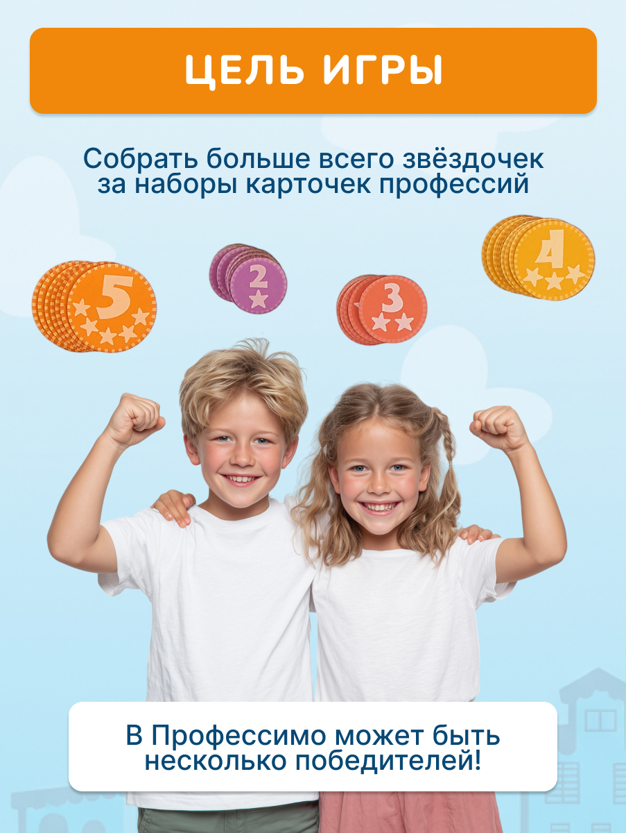 Большой pop-up домик с 6 секциями: кондитерская, салон красоты, больница, пожарная станция, ателье, автомастерская; 72 карточки профессий, кубик, 50 монеток, 12 фигурок на подставках, правила.