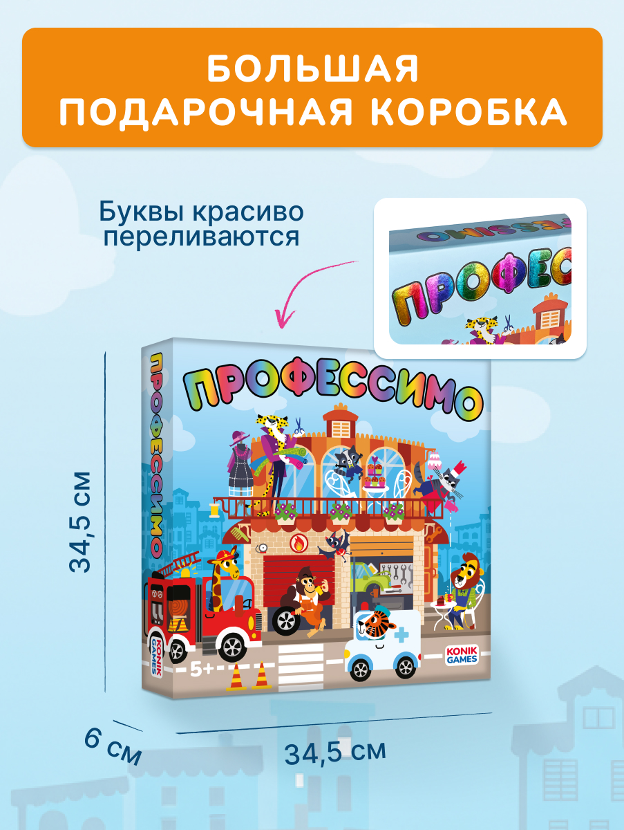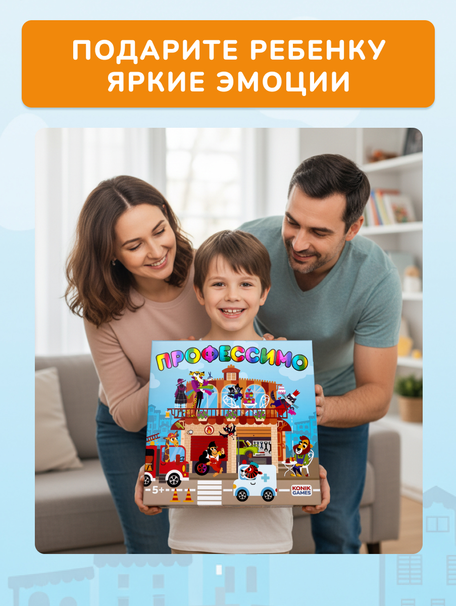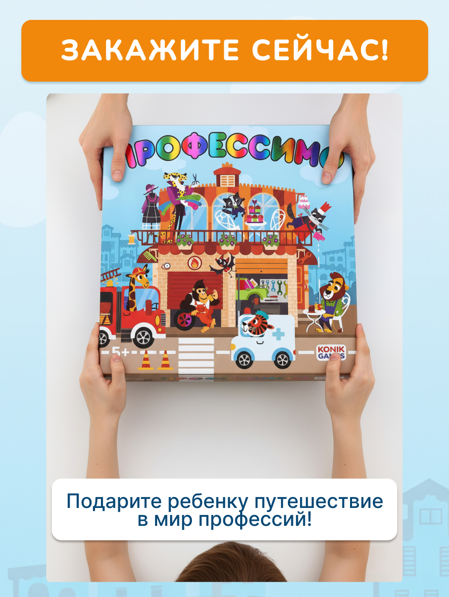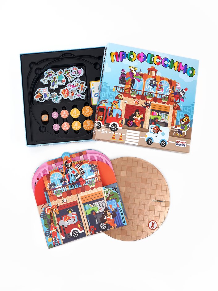 Профессимо от Konik Games - развивающая интерактивная настольная игра, от которой дети будут в восторге. В сложенном виде она выглядит как pop-up книга, а при раскладывании превращается в трёхмерный двухэтажный домик с 6 разворотами и объёмными сценами.