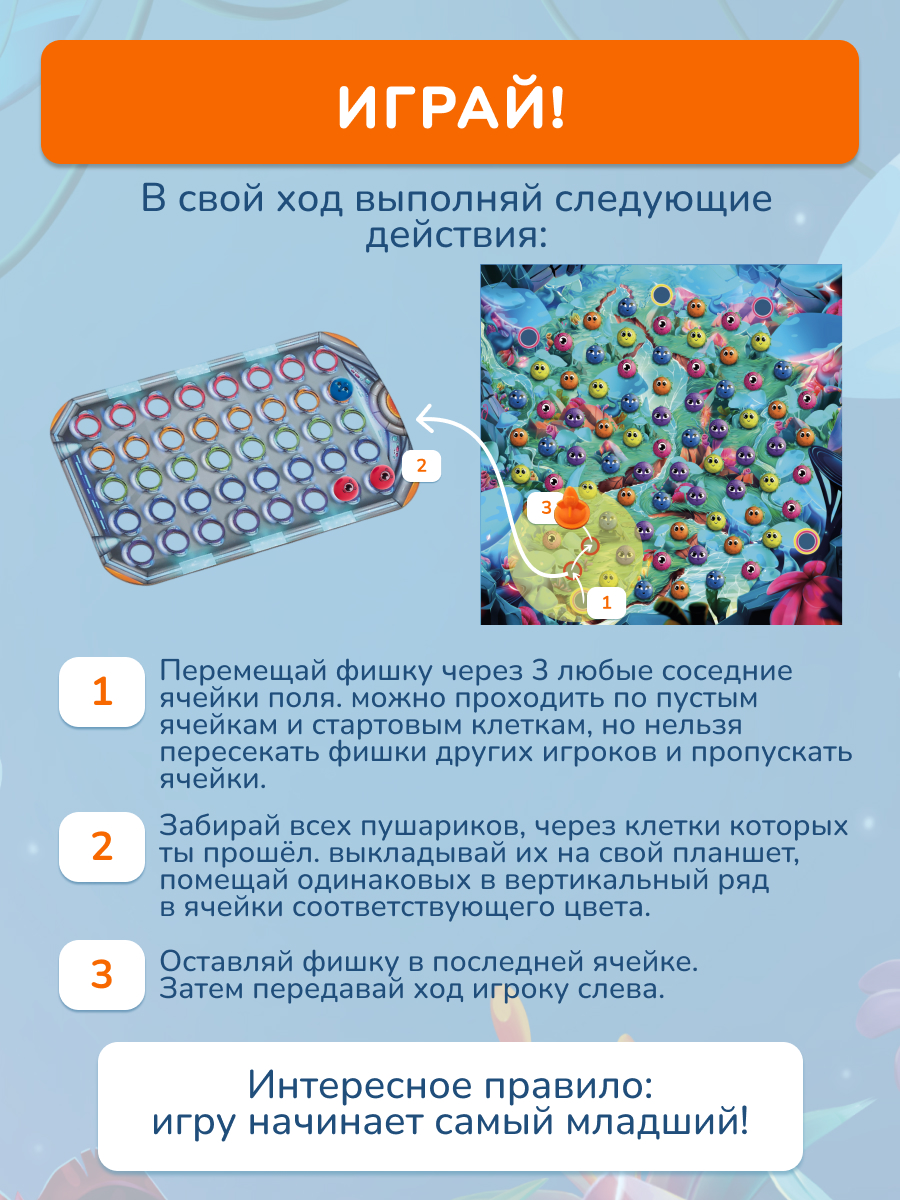Идеально подходит для детей и семейного вечера. Правила очень простые: ходите и собирайте ярких пушариков.