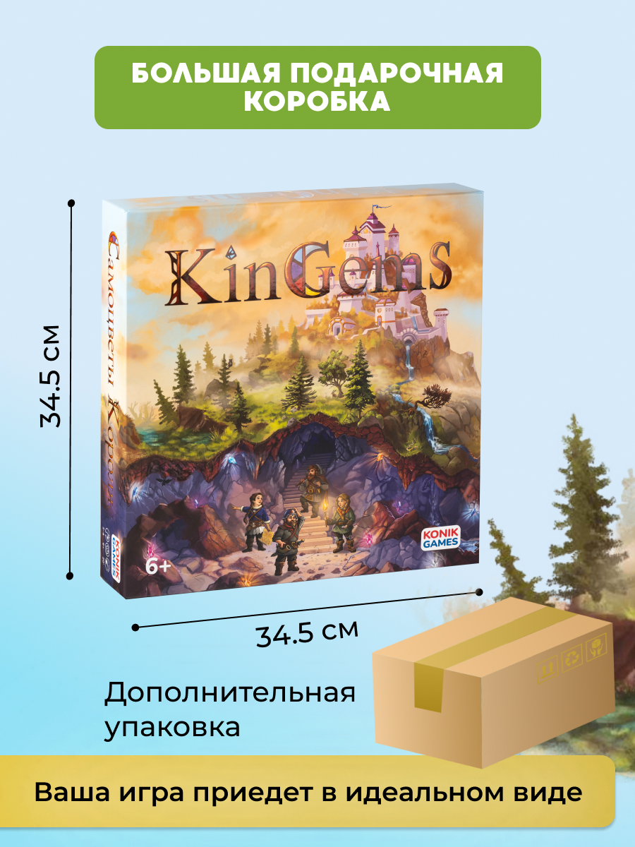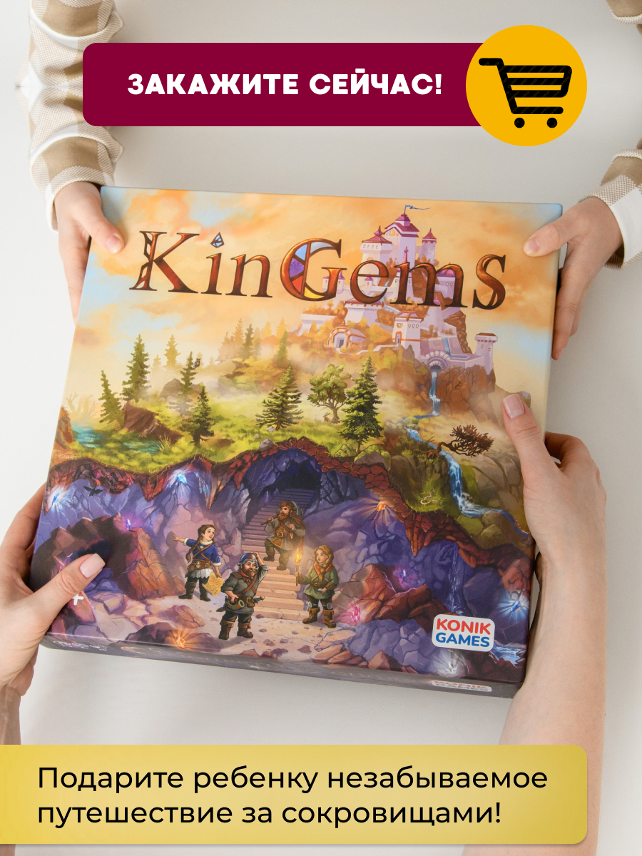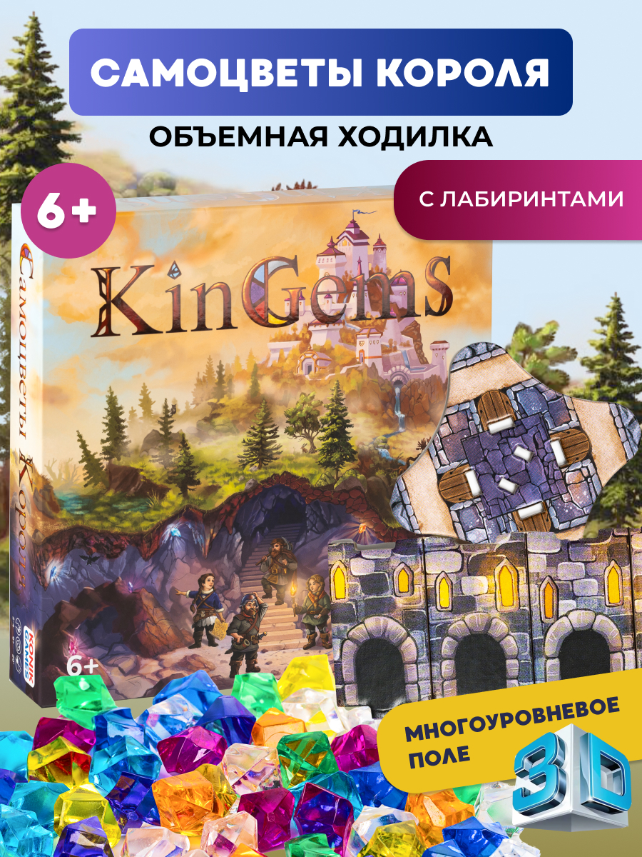 Настольная игра KINGEMS или «Самоцветы короля» от КОНИК ГЕЙМС– это захватывающая бродилка с 3D-полем, в которой вам предстоит собрать коллекцию драгоценных камней и получить звание Великого искателя сокровищ!
