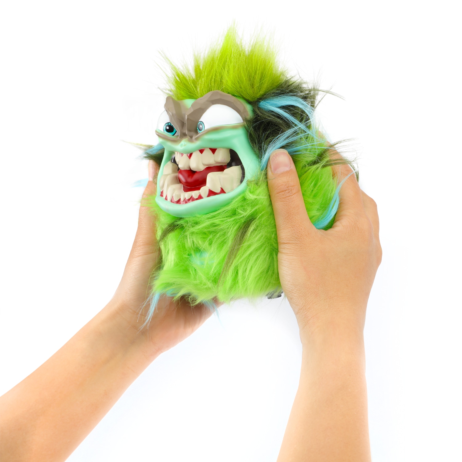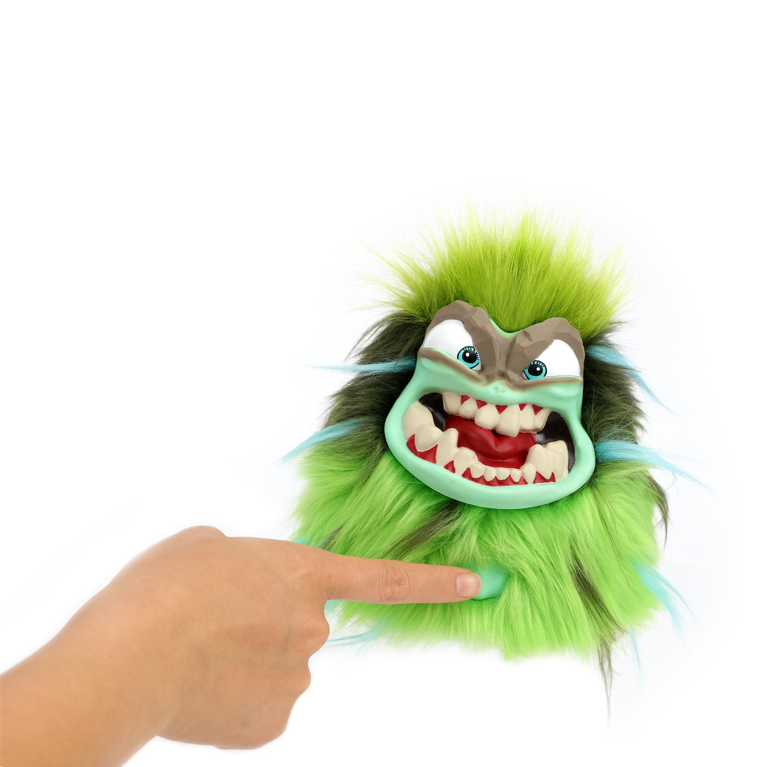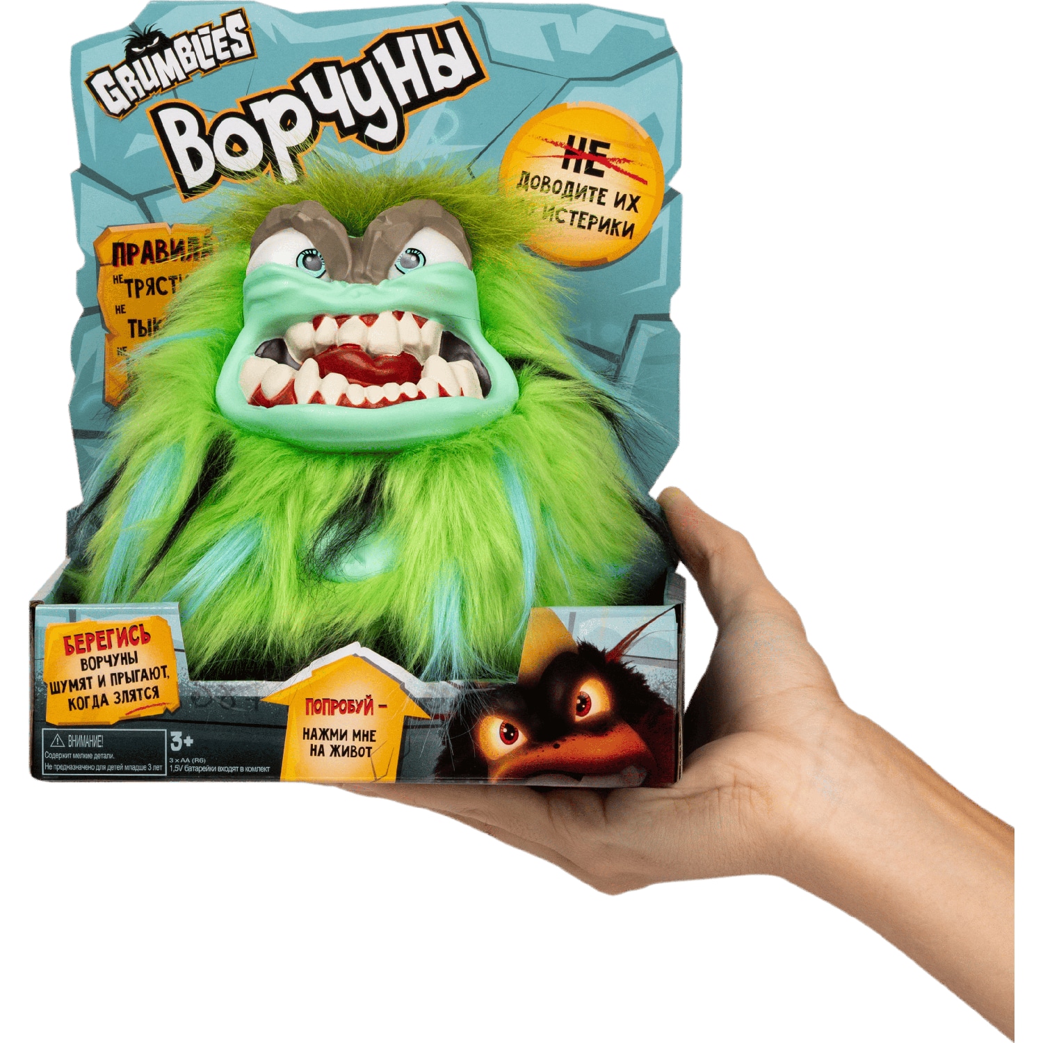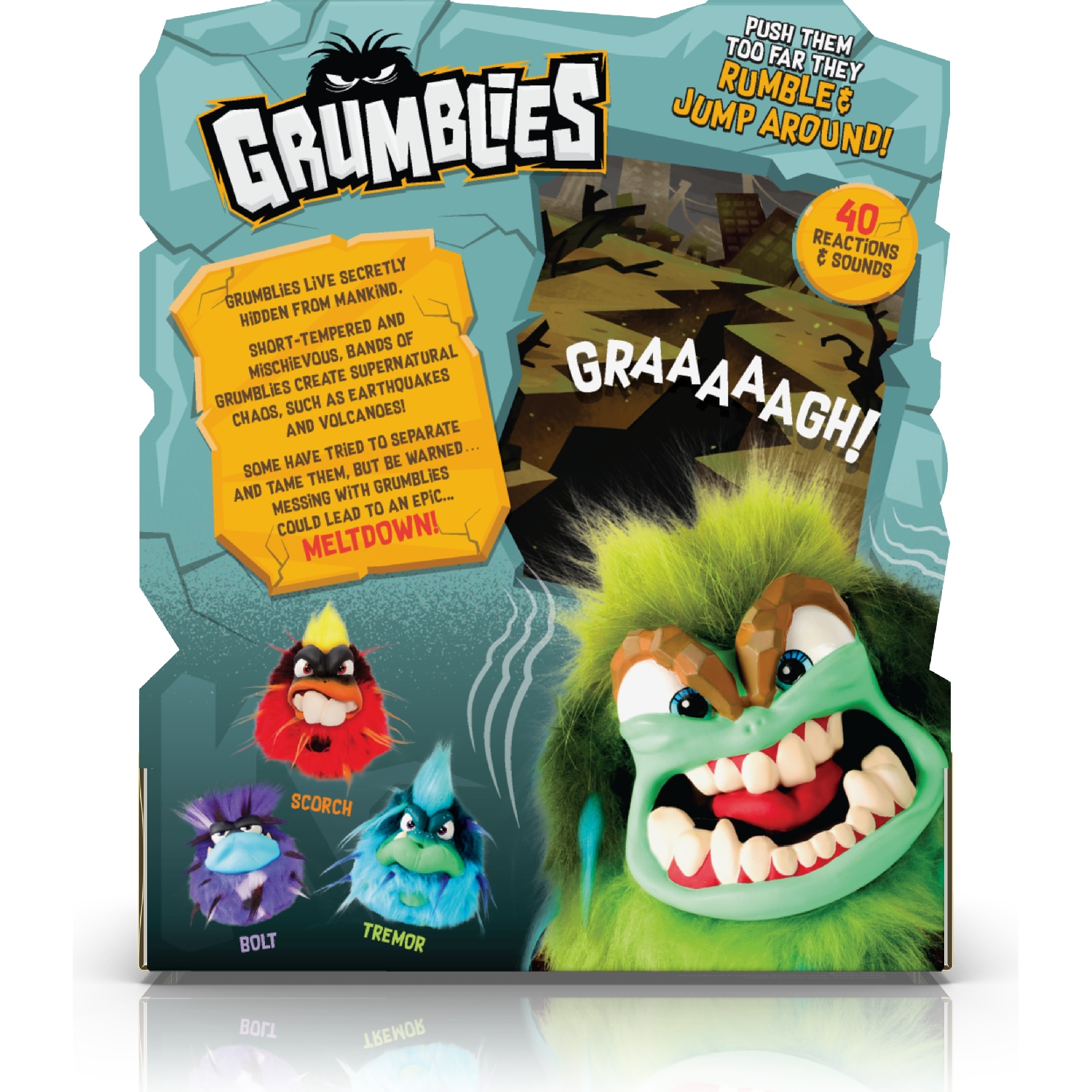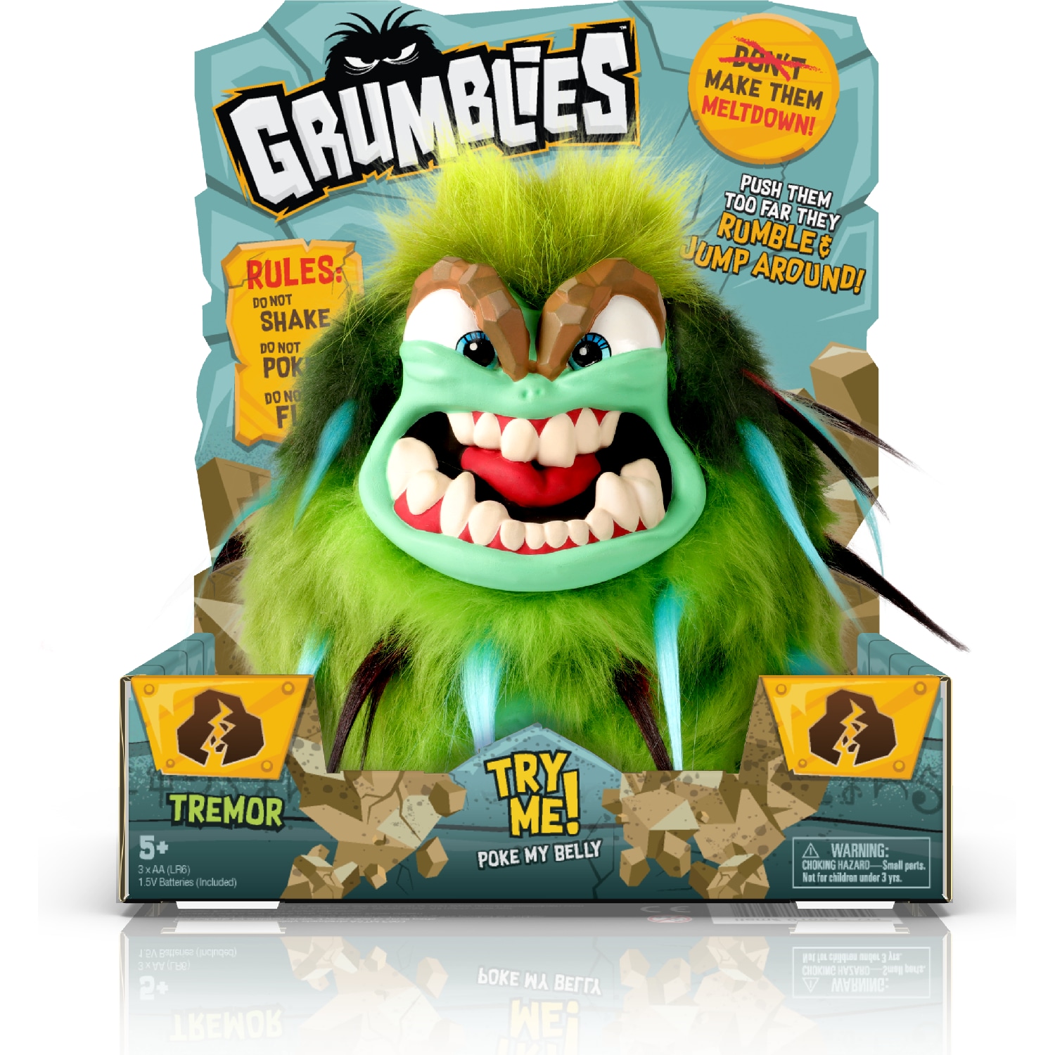 "ТРЕМОР" от Skyrocket - это озорная, вспыльчивая, зеленая интерактивная плюшевая игрушка, которая изображает землетрясения и вызывает шум, когда ее тычут, трясут или наклоняют, что приводит к более чем 40 уникальным реакциям и звукам, когда она грохочет, трясется и прыгает. Чем больше вы его раздражаете, тем злее он становится, его глаза меняют цвет и загораются, сигнализируя о приближении "серьезного срыва".