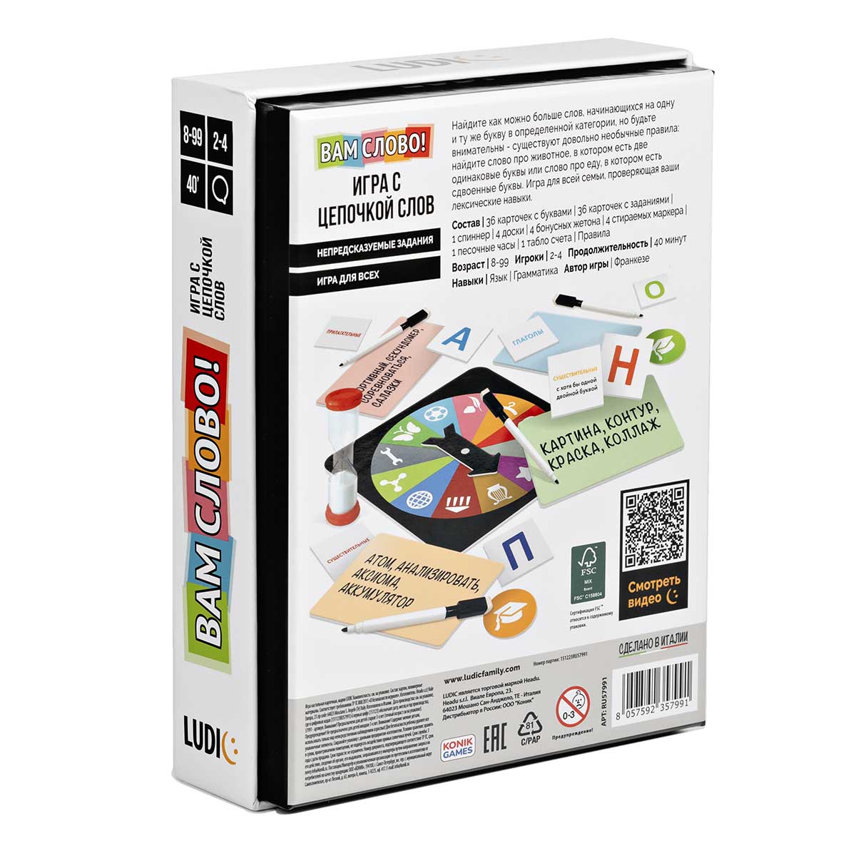 «Вам слово» – это веселая и познавательная настольная игра, которая способствует развитию интеллектуальных навыков и памяти. Задача – придумать как можно больше слов на определенную букву в разных категориях, соблюдая при этом указанные правила. Все просто: возьмите по одной карточке с буквой и заданием, а после вращайте спиннер, чтобы выбрать категорию. Когда категория определена, запускается таймер: вы и остальные участники должны написать как можно больше слов на нужную букву.