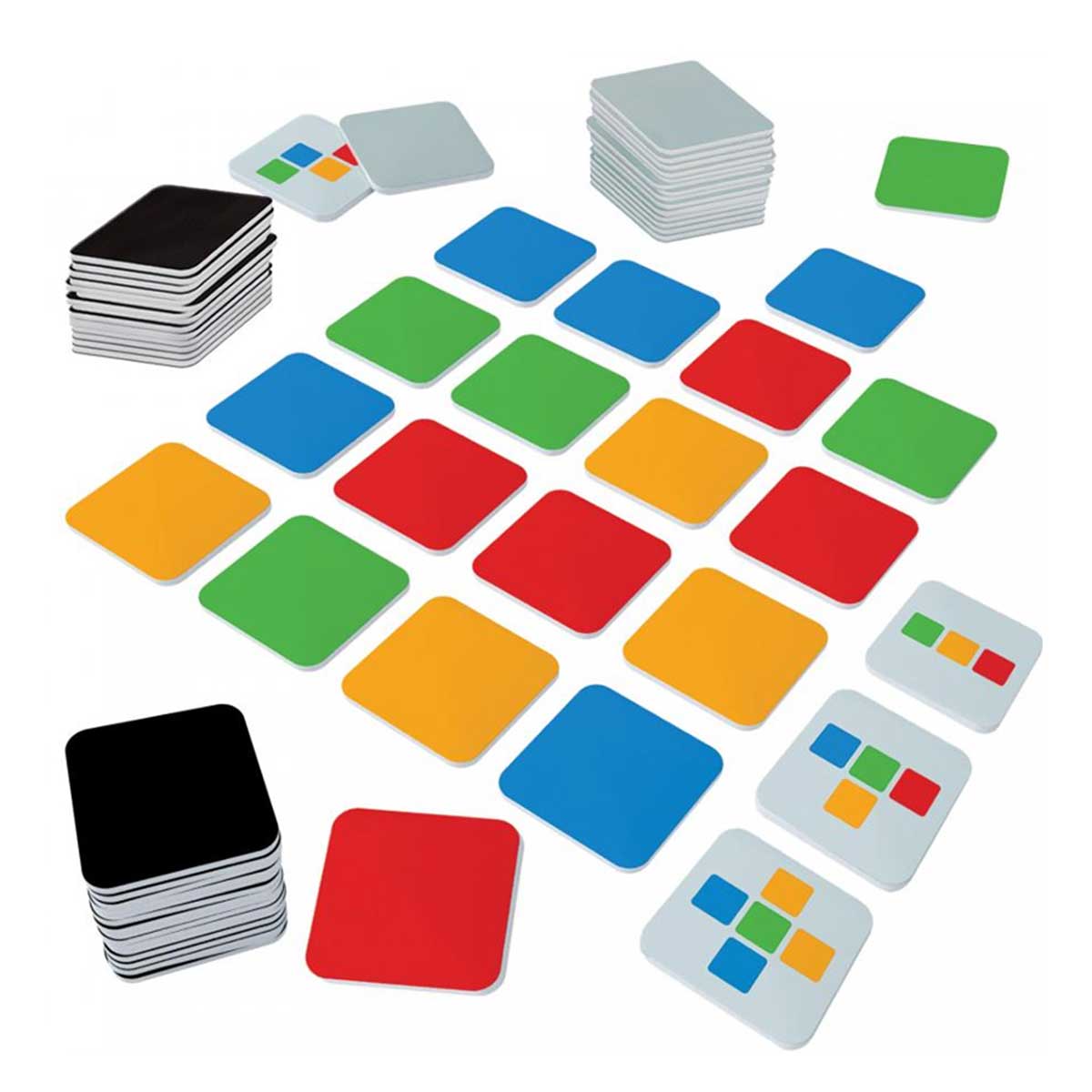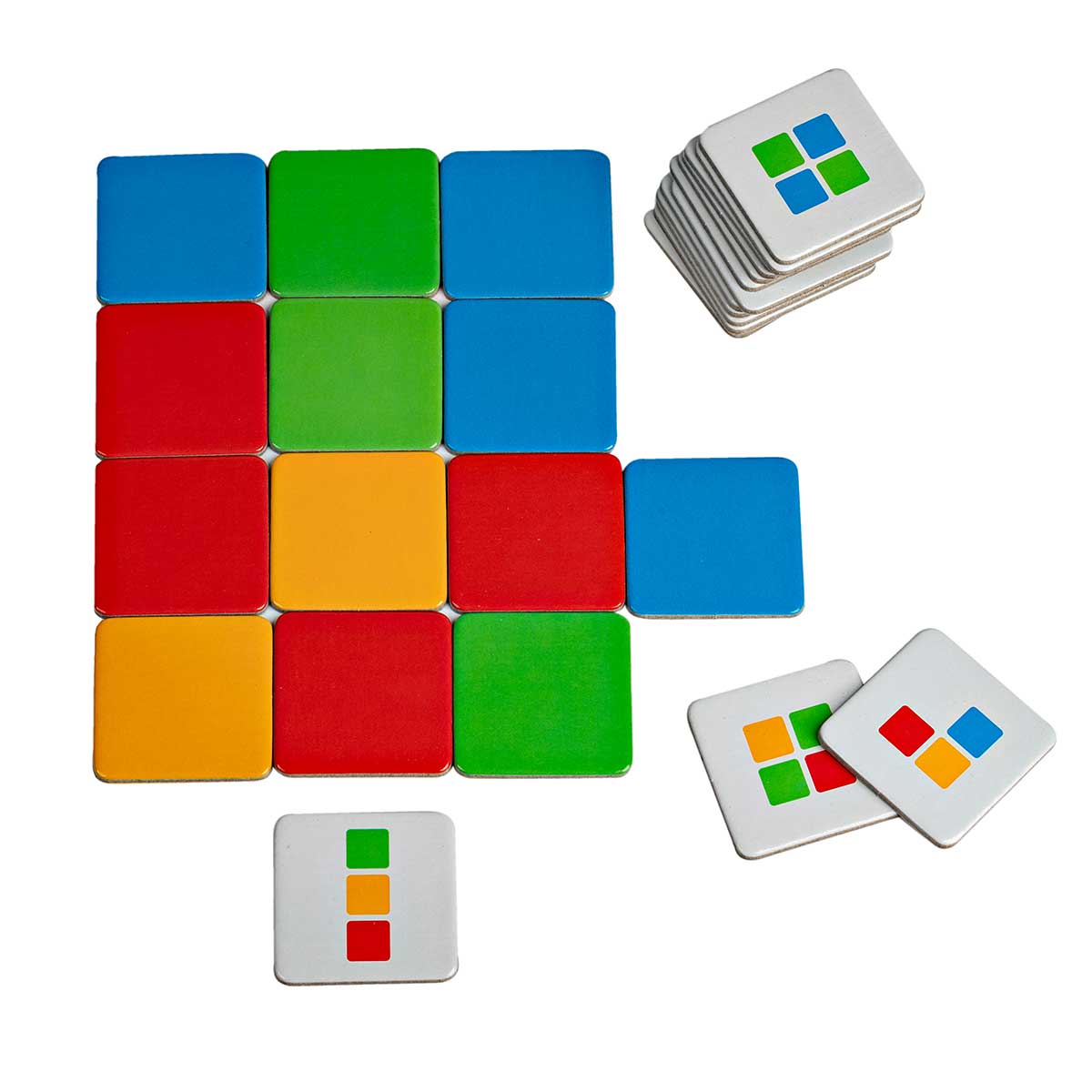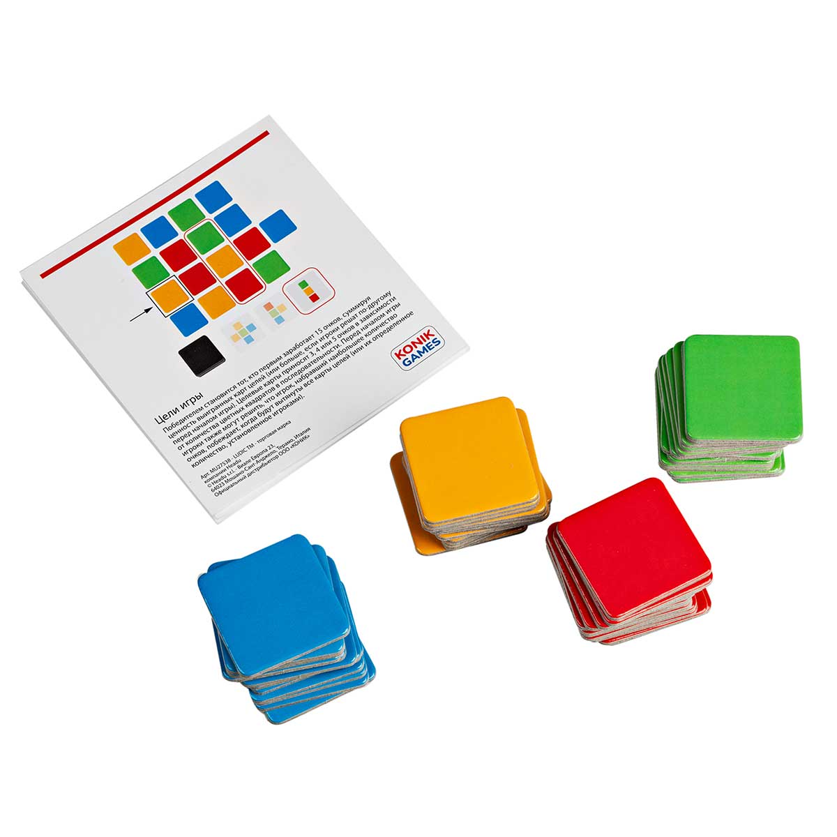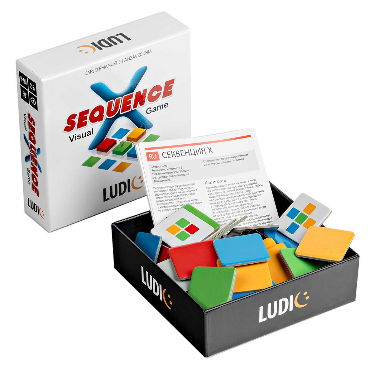 «Секвенция X» – это яркая и увлекательная настольная игра для развития внимательности. На игровое поле выкладываются 16 карточек в виде сетки 4х4. Над ними выкладываются 3 целевые карты. Задача игроков – воспроизвести на квадрате с цветными плитками одну из последовательностей, показанных на трех целевых картах, используя карточки из колоды. Победителем становится тот, кто первым заработает 15 очков.